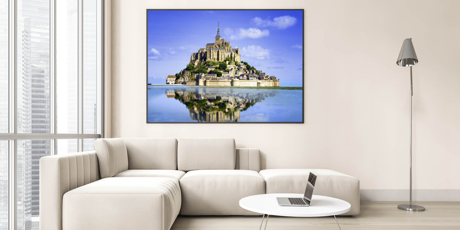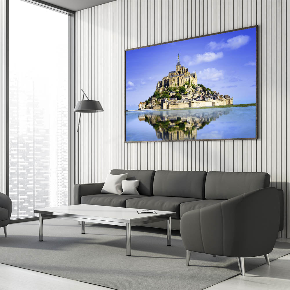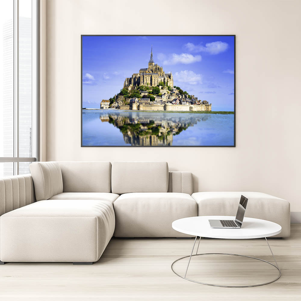 Add a touch of elegance and history to your space with this stunning Mont St. Michel art print, part of the French Scenery Canvas collection. This beautiful artwork showcases Mont St. Michel on a clear day, its grand architecture reflected in the calm waters below. This iconic view of French history and architecture will bring timeless charm to any room.
