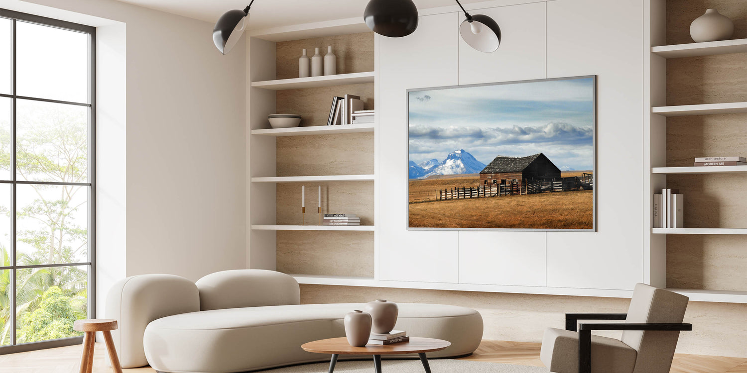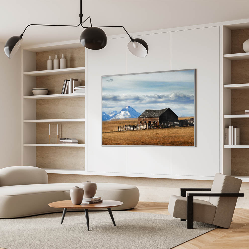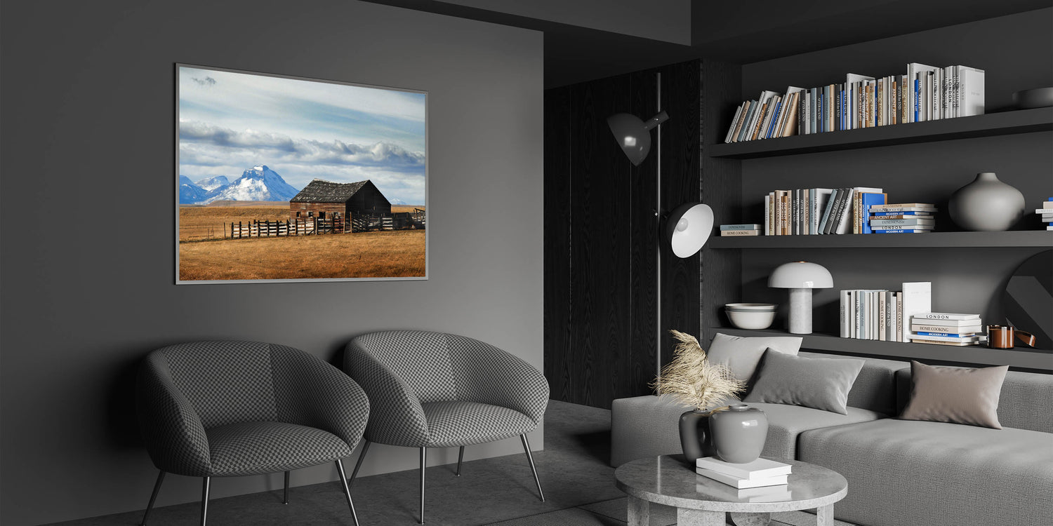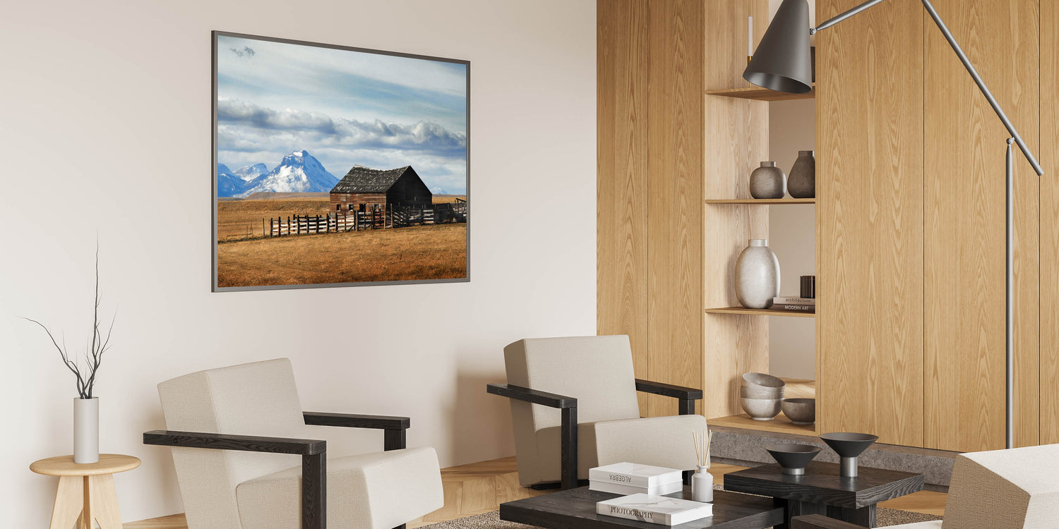 • Framed art of Montana landscapes featuring a rustic barn and snowy mountains