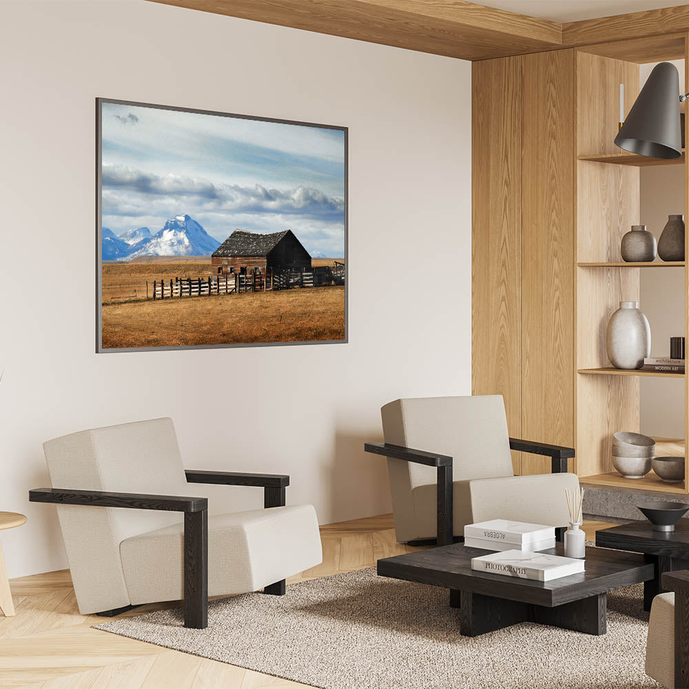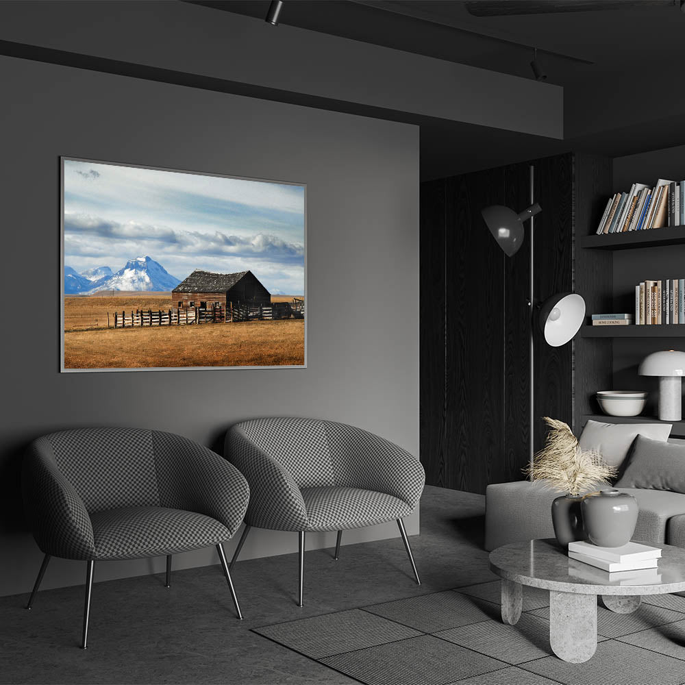 Bring the rugged beauty of Montana into your home with this framed landscape print featuring a rustic barn set against the majestic backdrop of snow-capped mountains. This Montana scenic art perfectly captures the quiet charm of rural life and the grandeur of the surrounding wilderness. Available in multiple formats, including framed prints, acrylic glass, and canvas, this piece adds a touch of natural beauty to any room.
