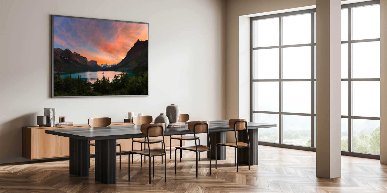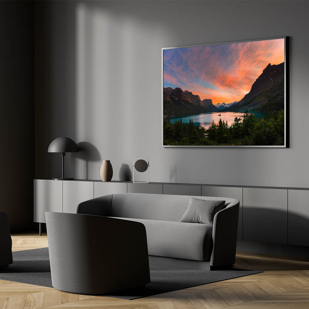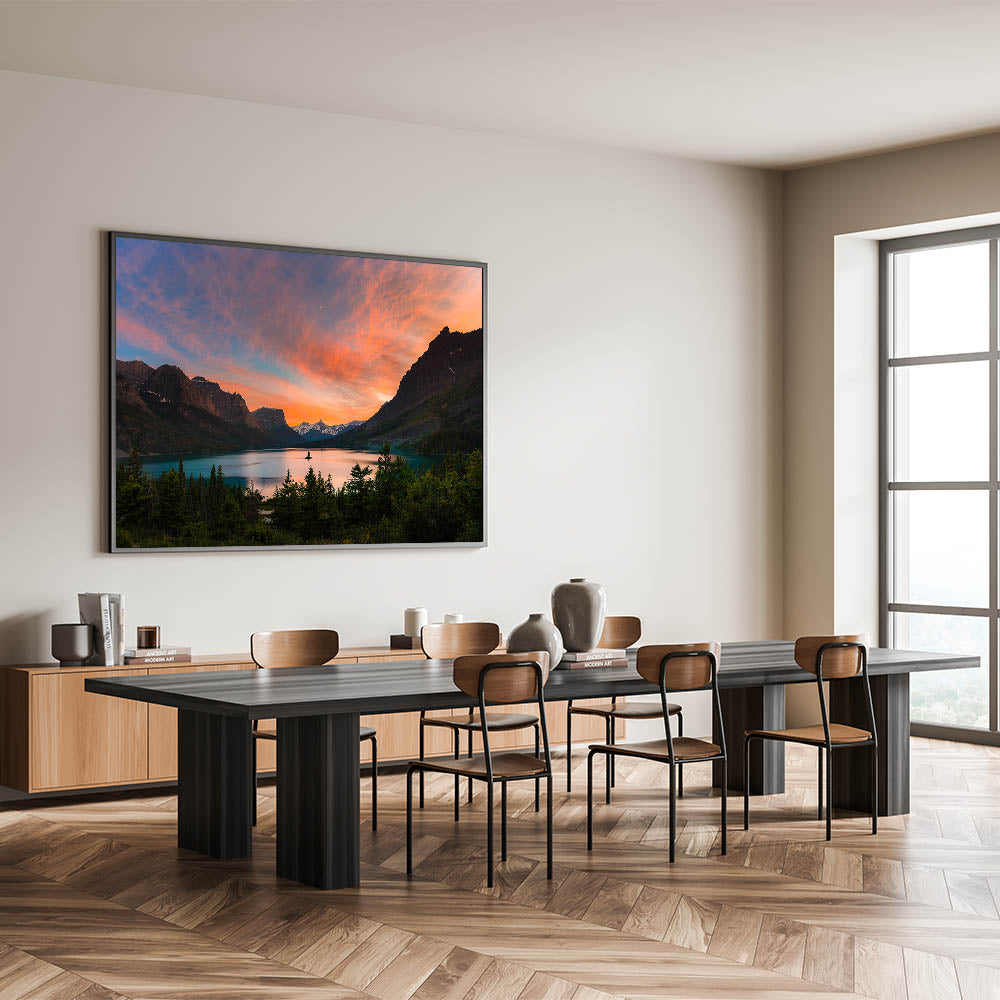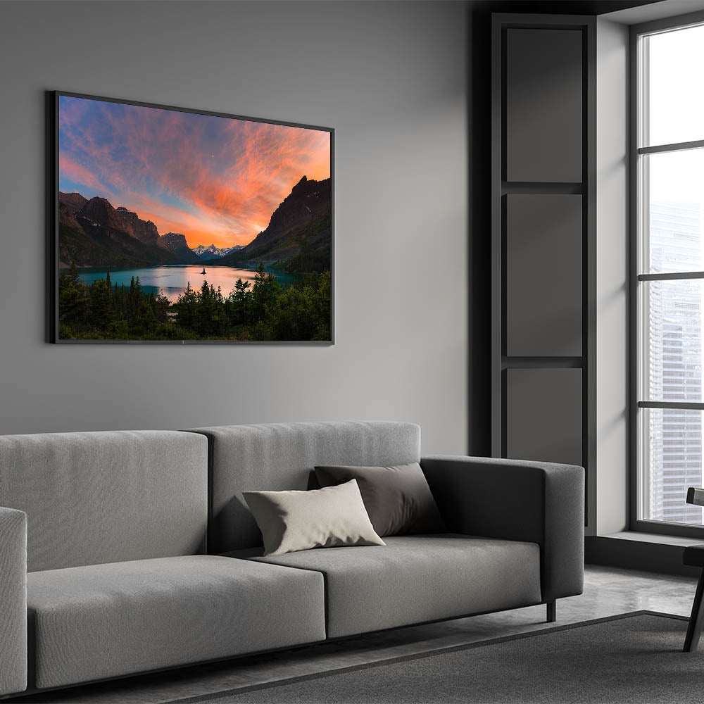 This Glacier National Park framed art is a stunning tribute to Montana’s majestic scenery, making it an excellent addition to any home. Whether displayed as a canvas print or framed art, this piece will infuse your space with the tranquility of nature.