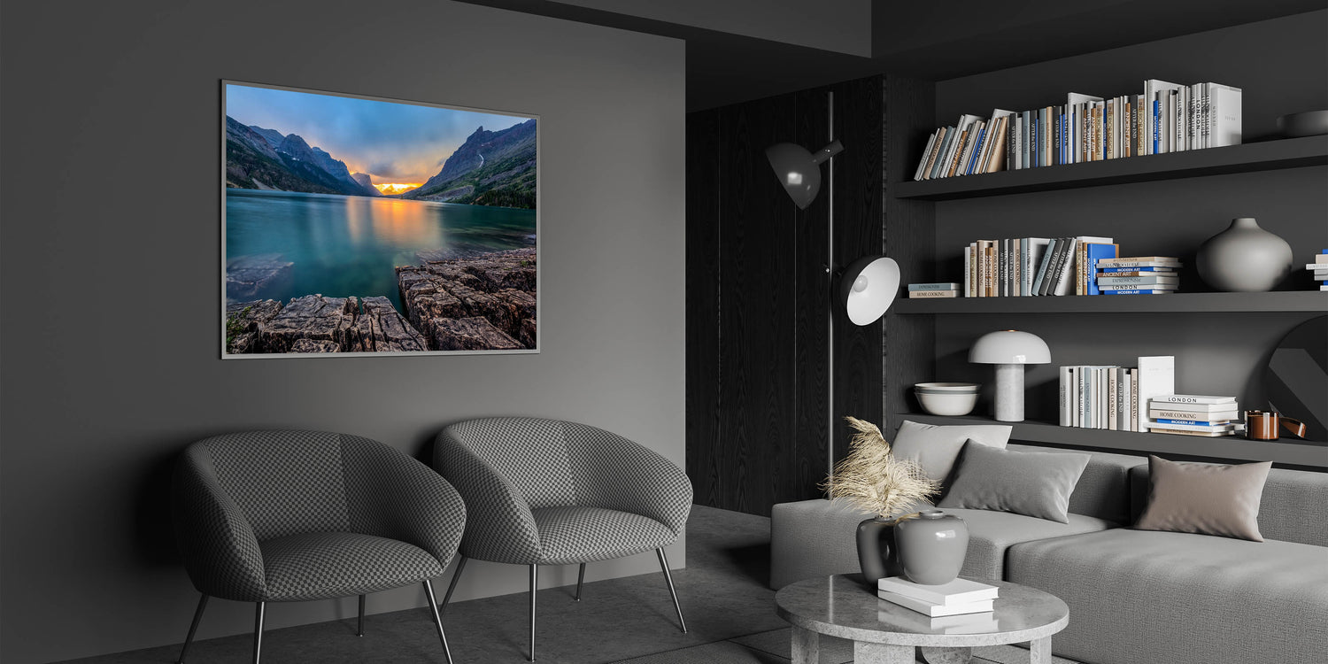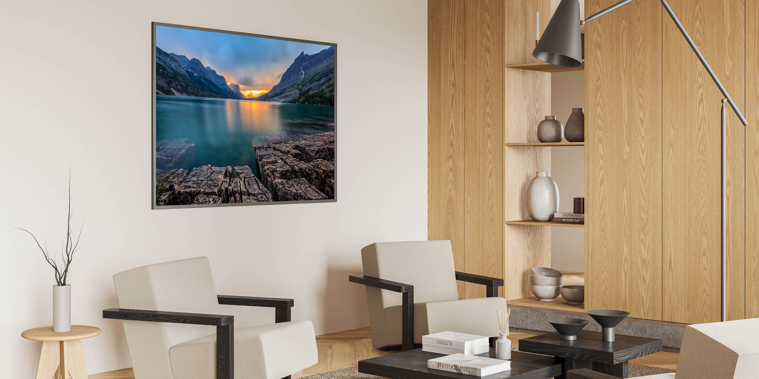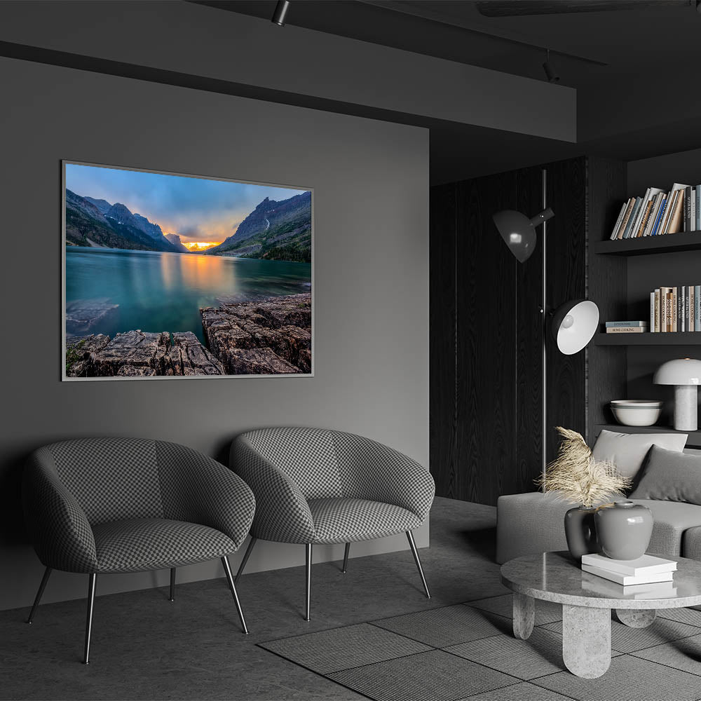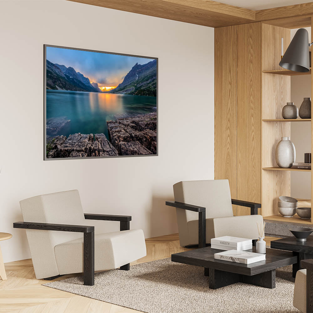 Whether you choose a framed canvas, acrylic glass, or a rolled print, this piece is perfect for adding a touch of nature-inspired wall decor to your home. The sunset hues create a warm, calming atmosphere, while the striking Montana landscape brings the vast beauty of Glacier National Park to life.