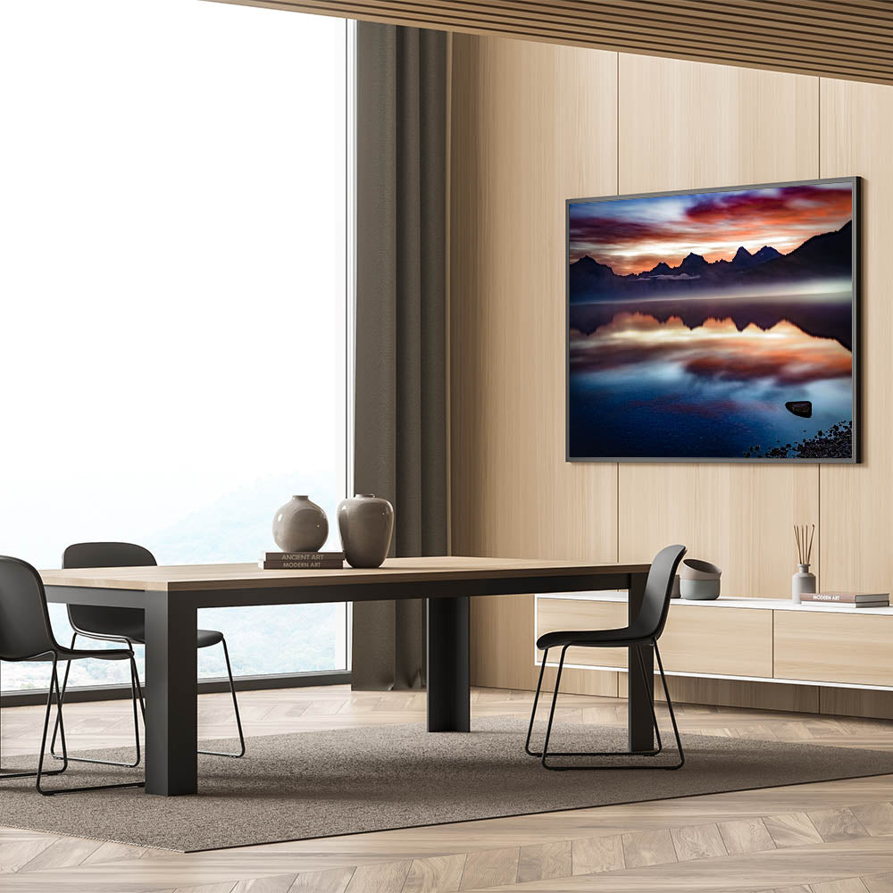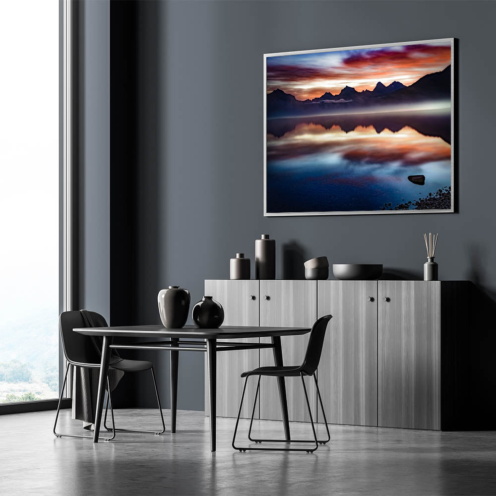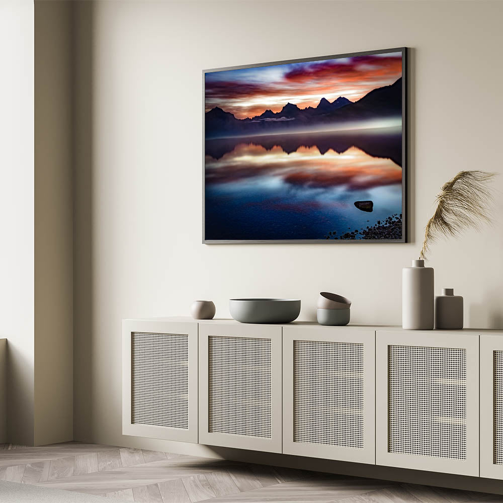 This breathtaking Montana wilderness art captures the calm beauty of a mountain lake at sunrise. The dark silhouettes of Montana’s rugged peaks stand majestically against the vibrant colors of the sky, reflected in the tranquil waters below. This Montana custom art print is perfect for creating a peaceful atmosphere in any room, bringing the essence of Montana’s untouched wilderness into your home. Available in various formats, from acrylic glass to framed prints, this stunning wall art offers durability and exceptional color quality.