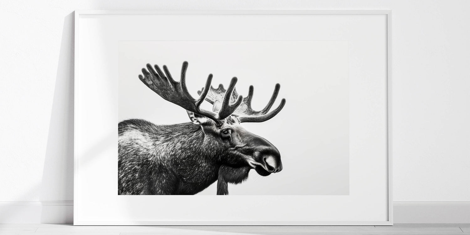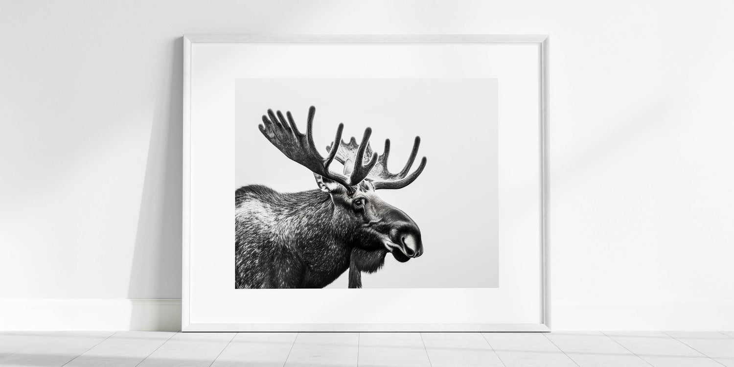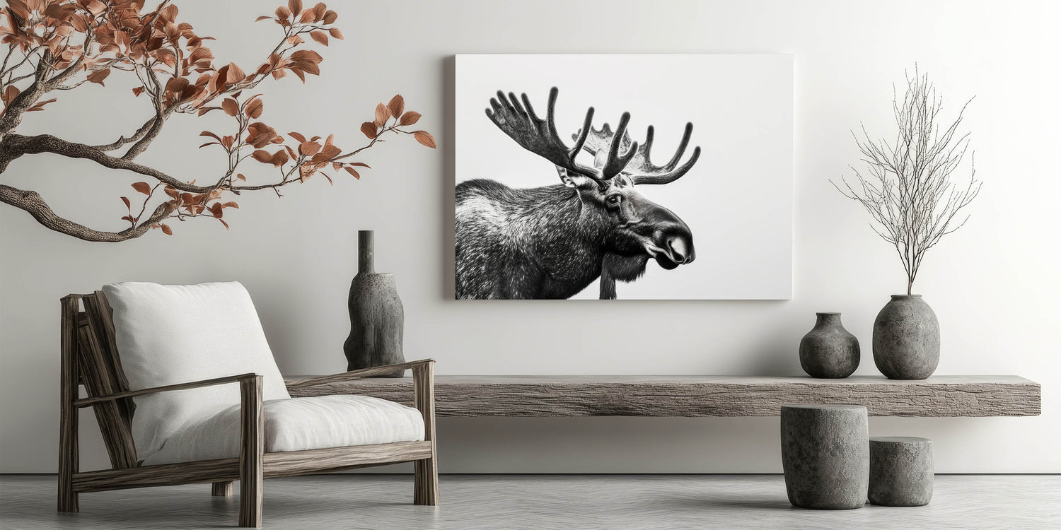Introduce a striking piece of art to your home with this Black & White Moose Portrait. This captivating artwork features a detailed close-up of a moose, rendered in a refined black and white palette. The simplicity of the monochrome design brings out the intricate textures and powerful presence of the moose, making it a bold statement piece for any decor style.