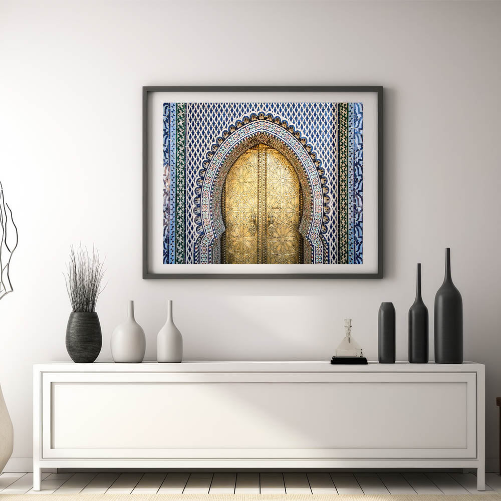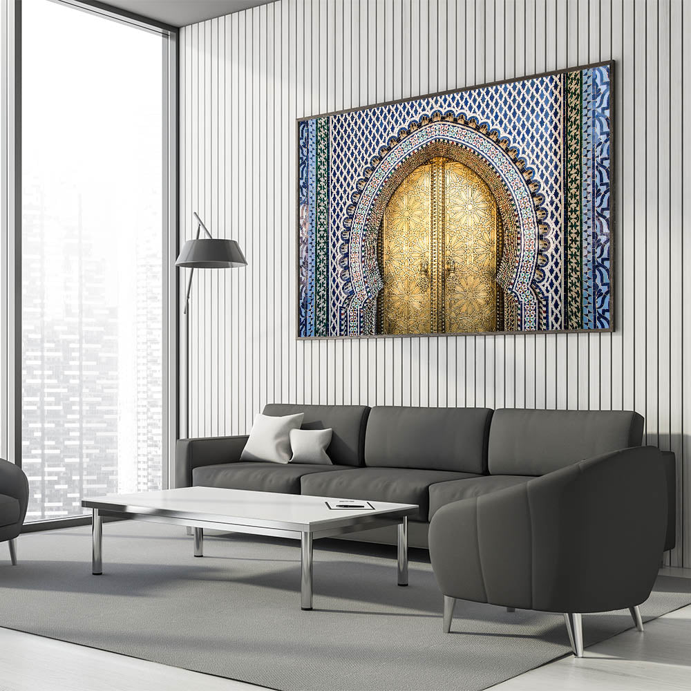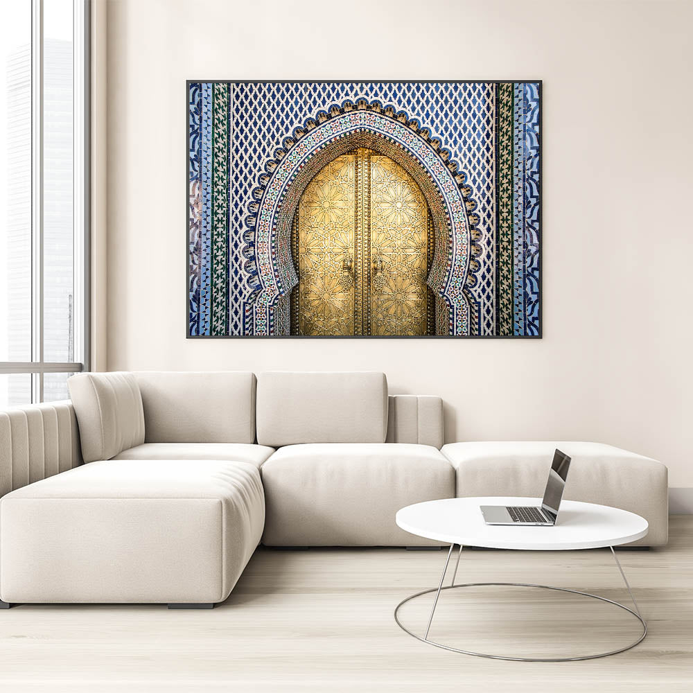 • Exquisite Details: The artwork showcases the elaborate patterns and textures of the gold door and surrounding tiles, bringing the sophistication of Moroccan architecture into your home.