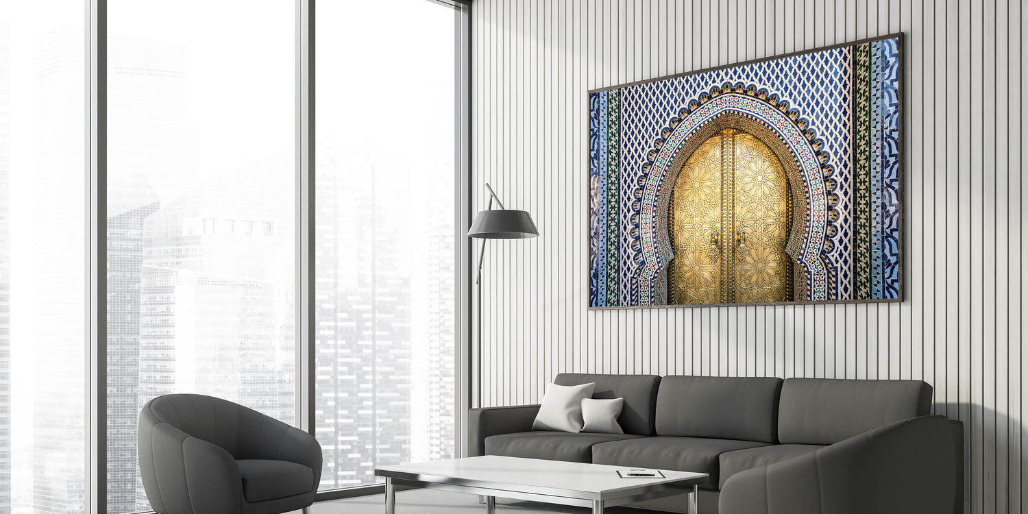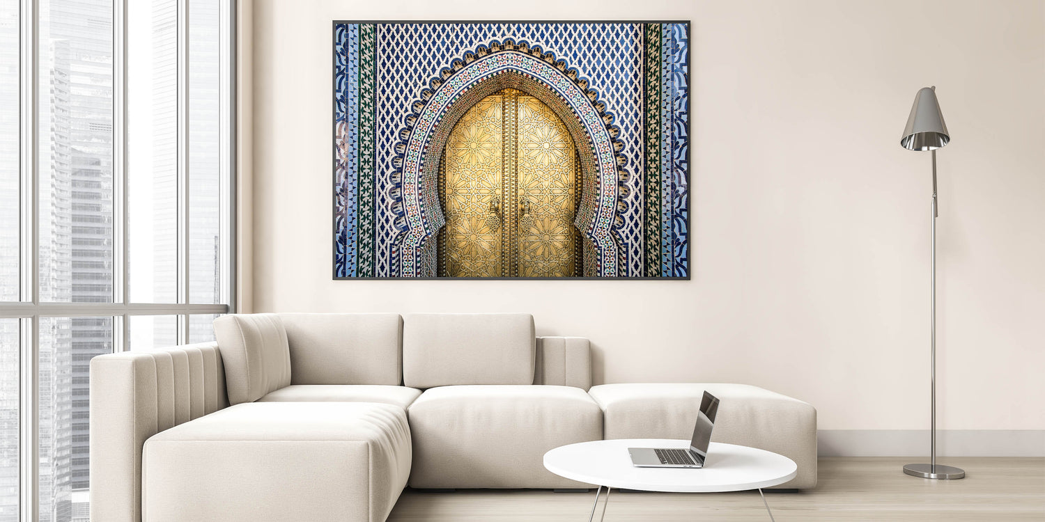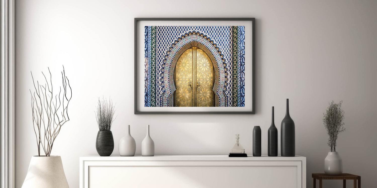 • Exquisite Details: The artwork showcases the elaborate patterns and textures of the gold door and surrounding tiles, bringing the sophistication of Moroccan architecture into your home.