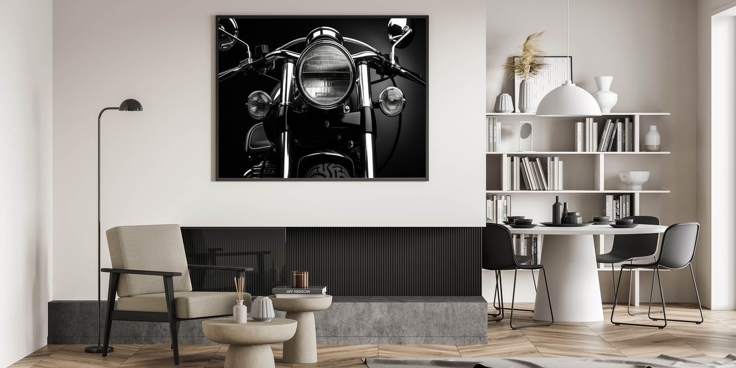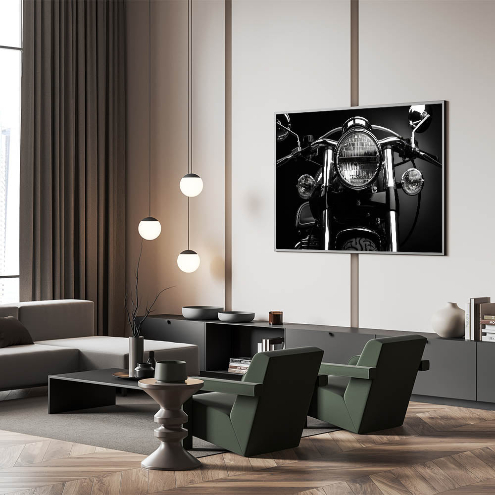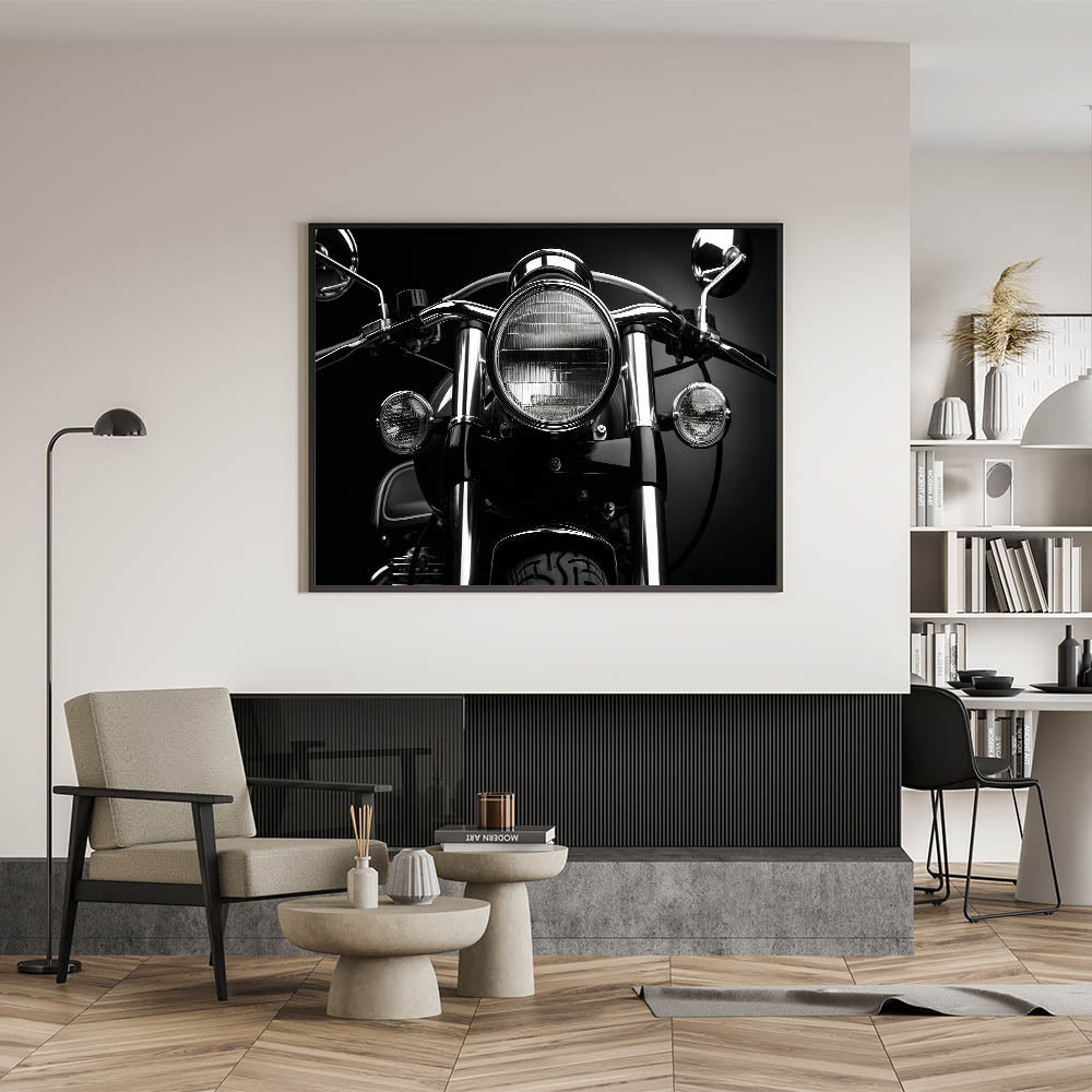 Bring a touch of timeless elegance to your space with our Classic Motorcycle Canvas, featuring a striking monochrome close-up of a motorcycle headlight. This wall art captures the essence of vintage motorcycle design with its sleek chrome detailing and bold lines. The black-and-white color scheme adds a sophisticated, modern edge, making it a versatile piece that fits seamlessly into any decor.
