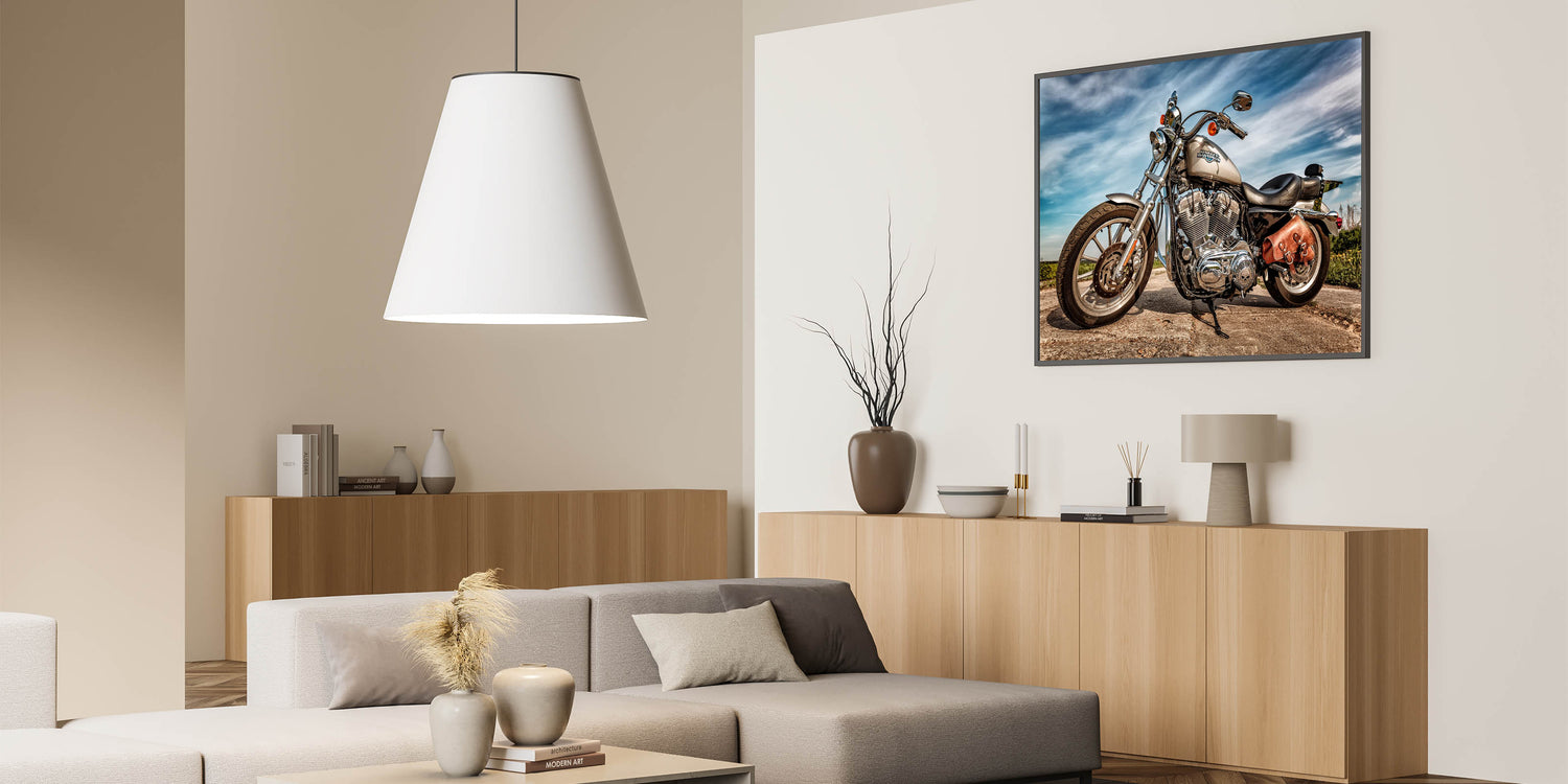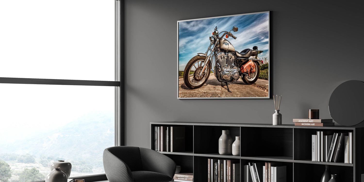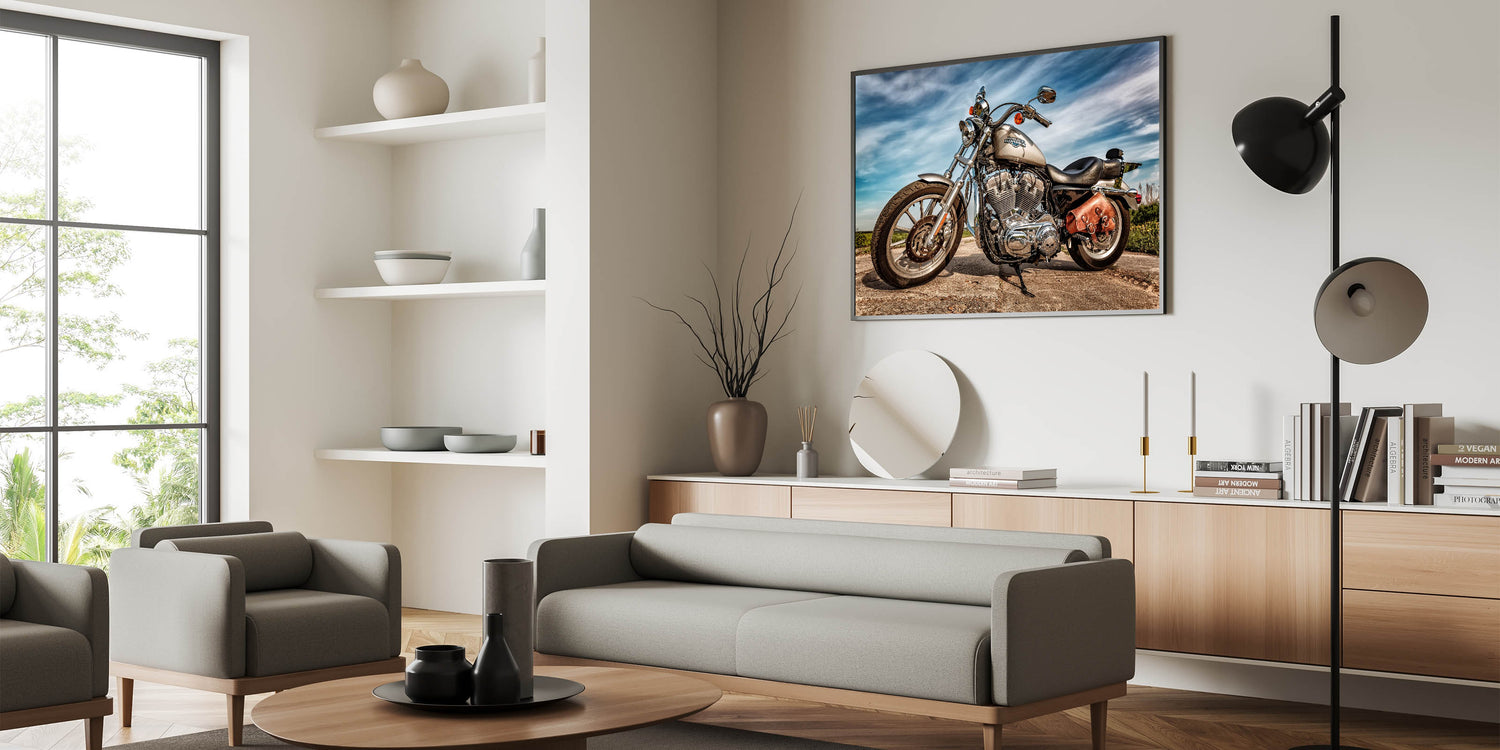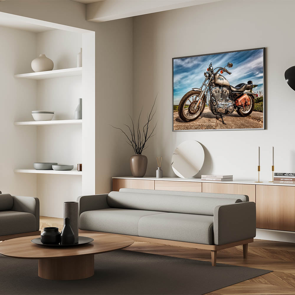 Celebrate the iconic design and engineering of Harley Davidson with this Classic Motorcycle Photography Print. This stunning piece captures a beautifully detailed Harley Davidson motorcycle, standing proud under a clear blue sky. The image highlights the bike’s gleaming chrome, rugged leather saddlebag, and the unmistakable Harley Davidson emblem, making it a perfect addition to any motorcycle enthusiast’s collection.
