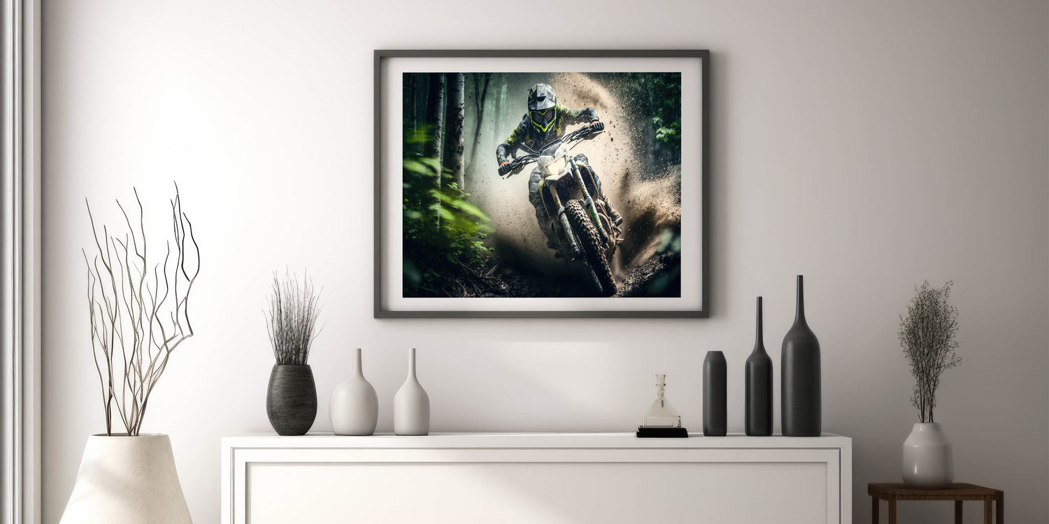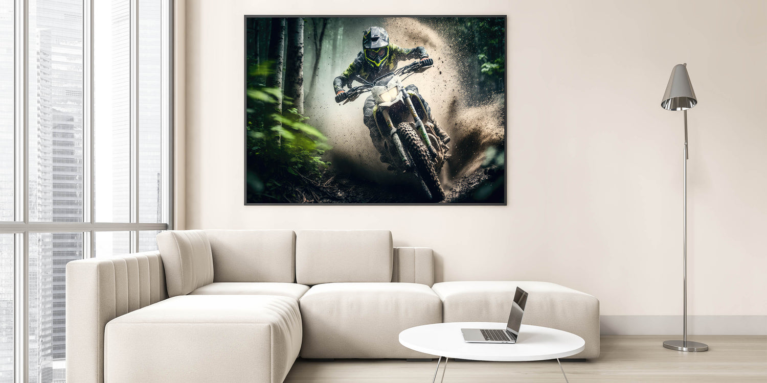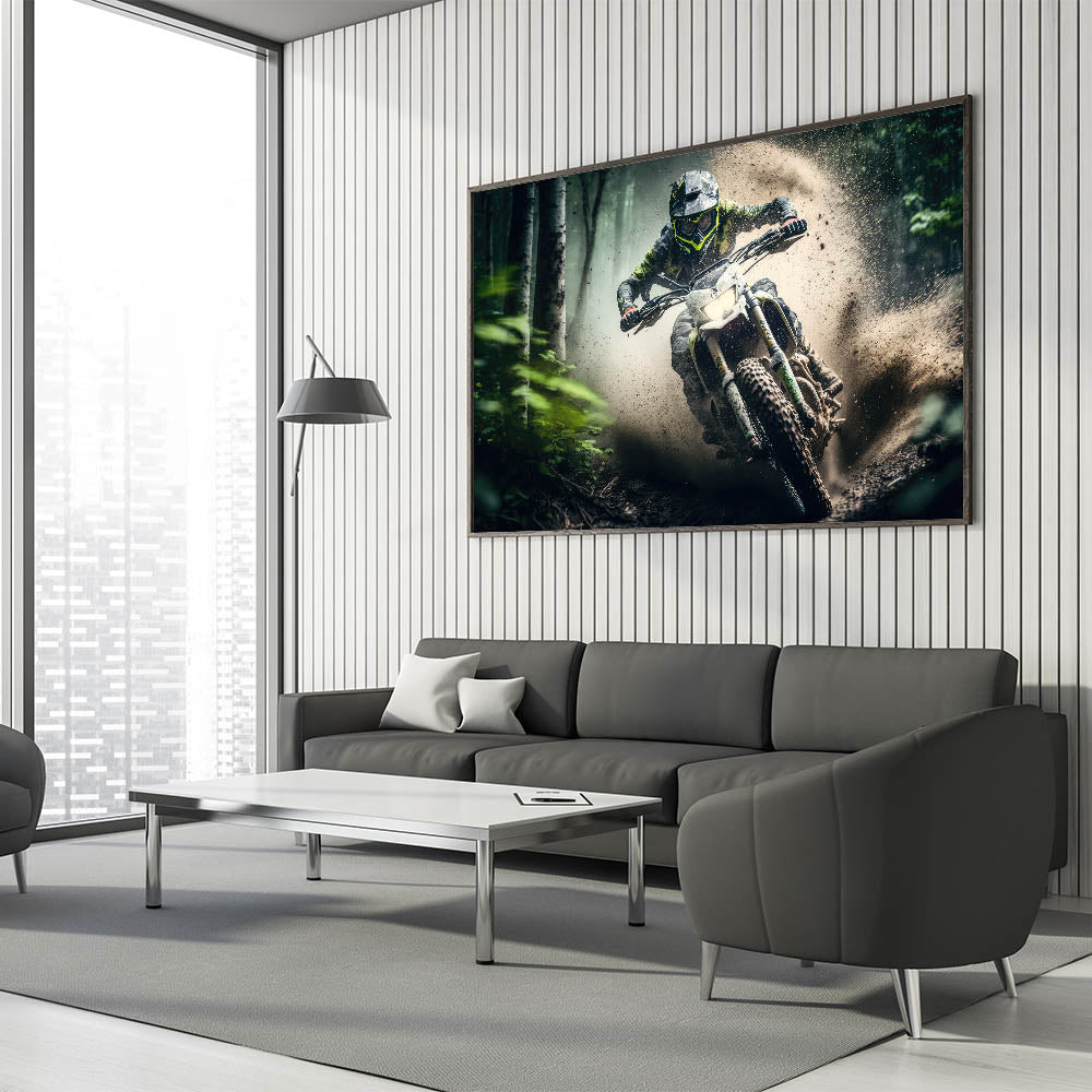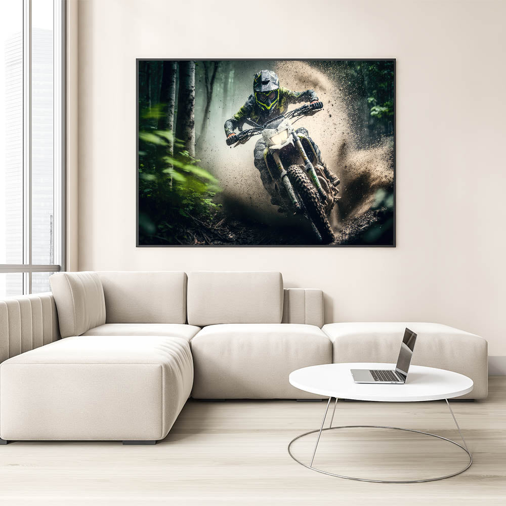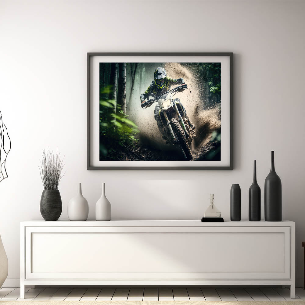 Feel the rush of adrenaline with this Dynamic Dirt Bike Wall Art, capturing the intensity of off-road racing as a rider carves through the forest trails. This action-packed image showcases a dirt bike kicking up mud and debris, embodying the thrill and raw power of off-road adventures. The vibrant greens of the forest contrast with the gritty, earthy tones of the trail, creating a visually striking piece that’s perfect for any space dedicated to motorsports and adventure.