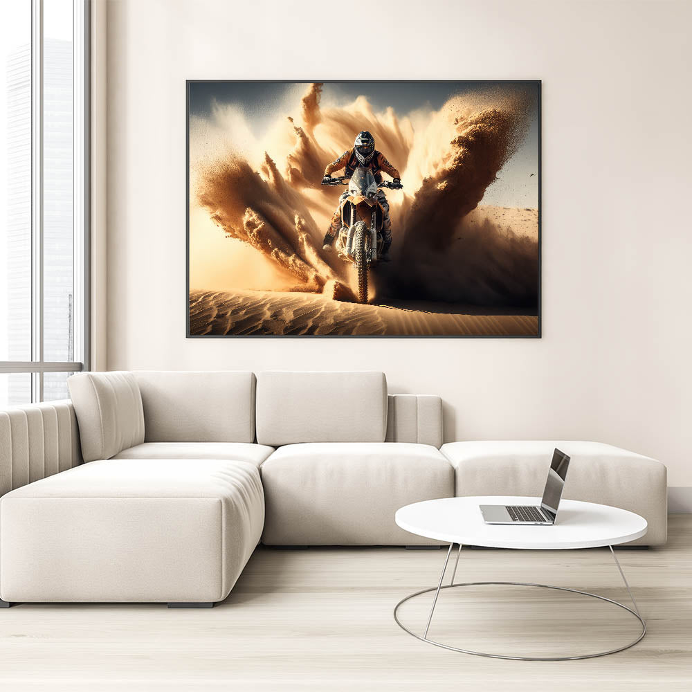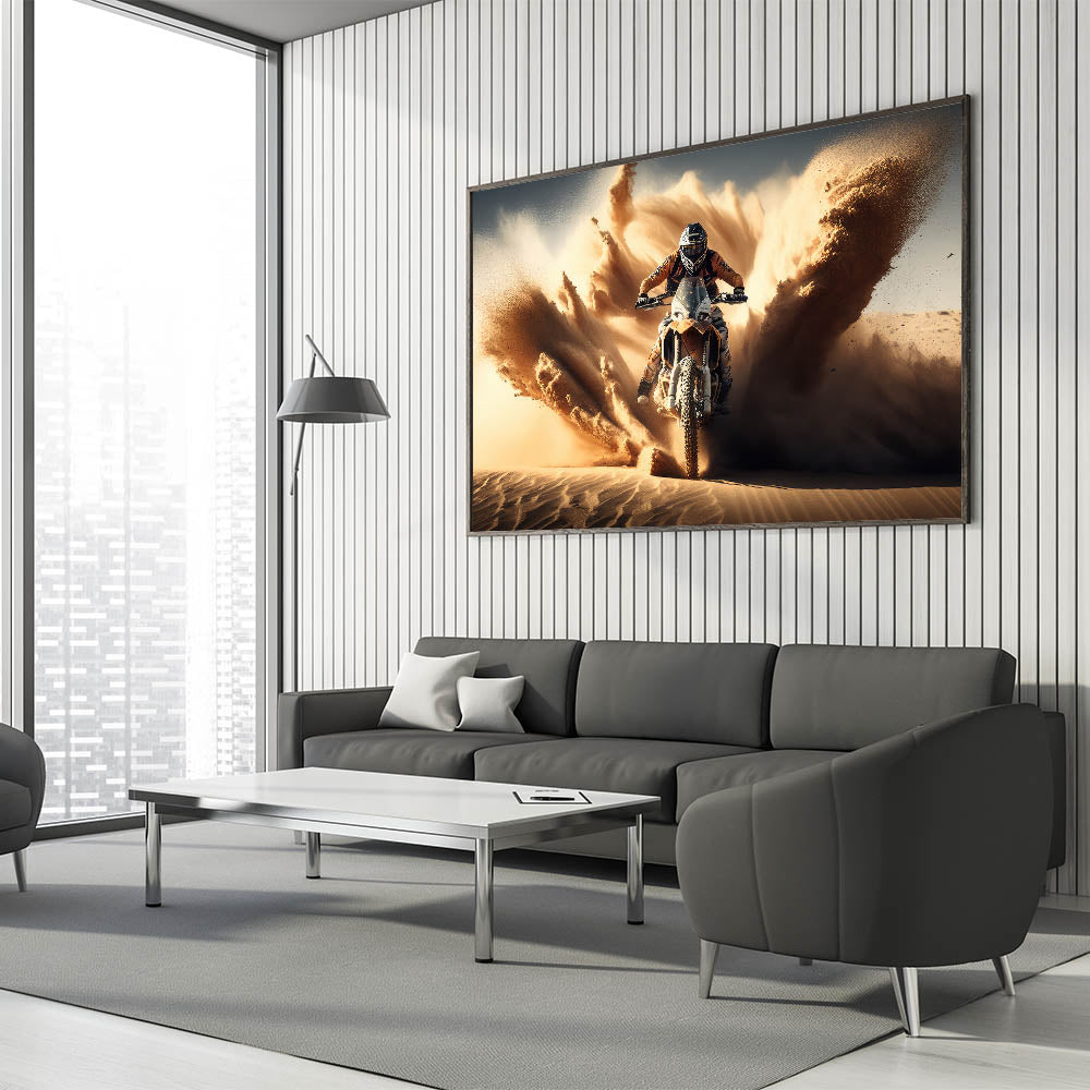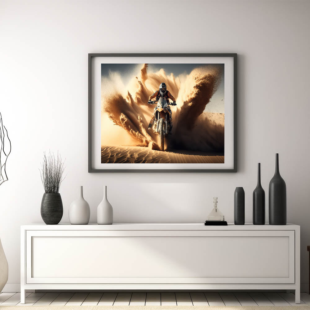 Experience the thrill of high-octane desert racing with this Desert Rally Motorcycle Wall Art. This captivating image captures a rider bursting through a wall of sand, embodying the raw power and intensity of off-road rally racing. The striking contrast between the rider’s focused determination and the dynamic explosion of sand creates a visually stunning piece that’s perfect for any space dedicated to adventure and extreme sports.
