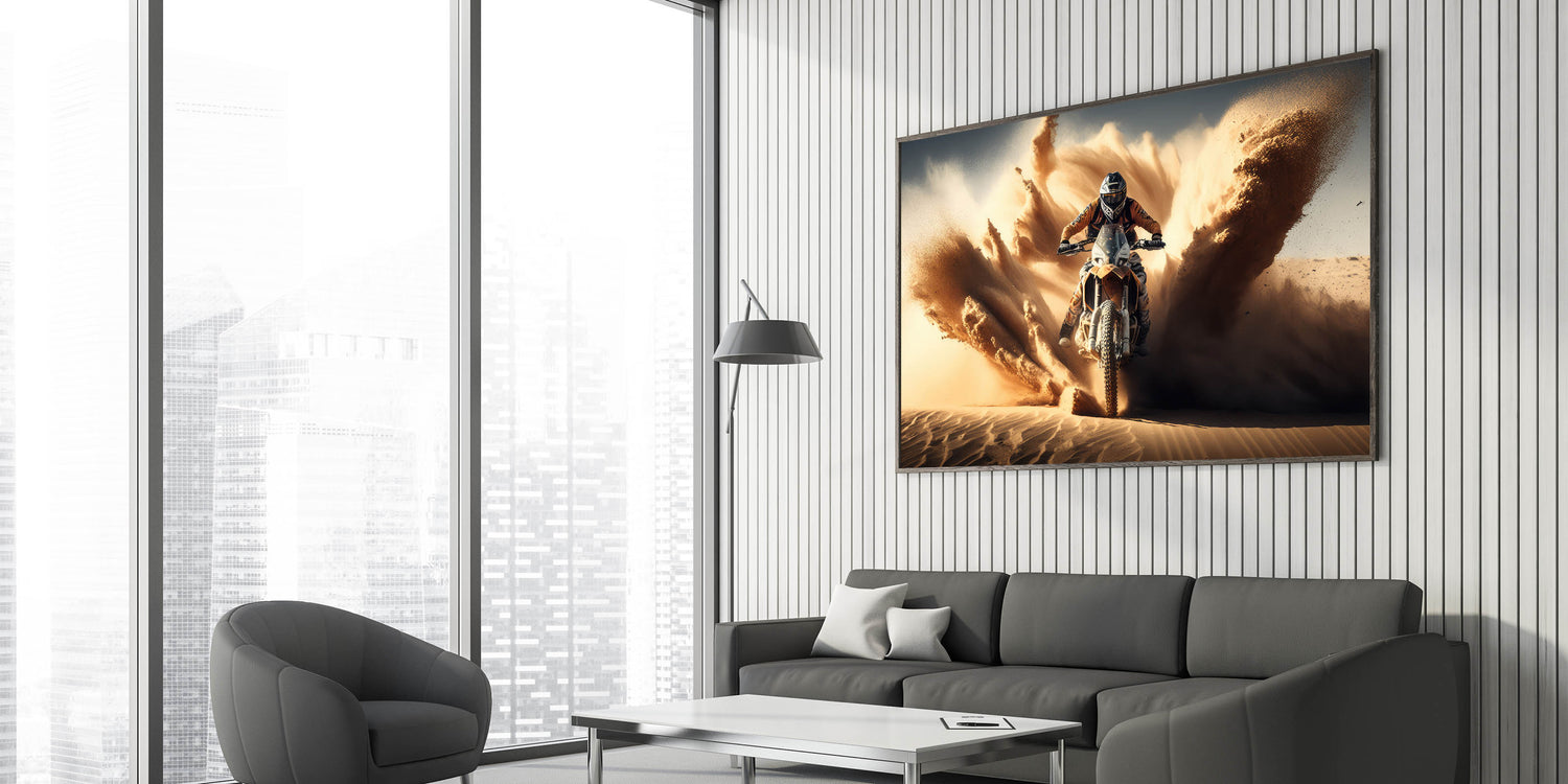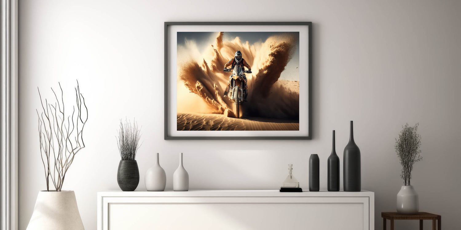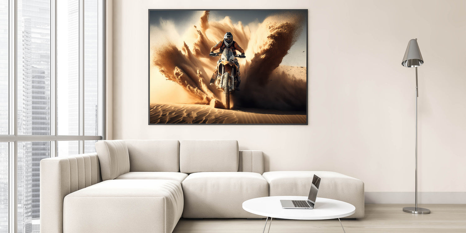 Experience the thrill of high-octane desert racing with this Desert Rally Motorcycle Wall Art. This captivating image captures a rider bursting through a wall of sand, embodying the raw power and intensity of off-road rally racing. The striking contrast between the rider’s focused determination and the dynamic explosion of sand creates a visually stunning piece that’s perfect for any space dedicated to adventure and extreme sports.