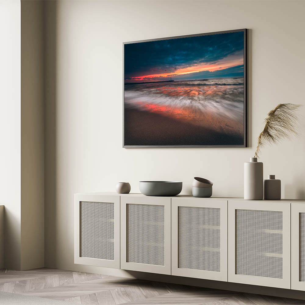 Bring the dramatic beauty of Lithuania’s Baltic coast into your home with this stunning wall art. This canvas print features crashing waves and a vibrant sunset, with rich tones of orange, red, and blue reflecting across the water. The powerful contrast between the stormy sky and the soft glow of the sunset creates an awe-inspiring scene that will add depth and energy to any room.