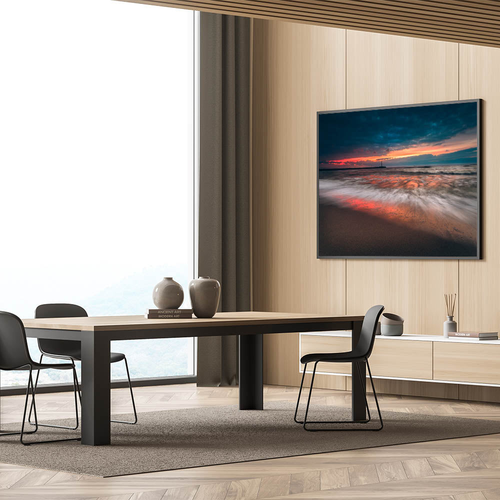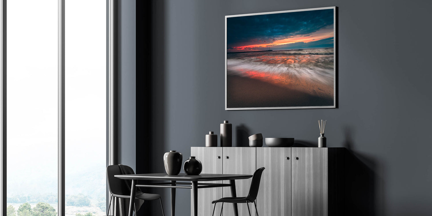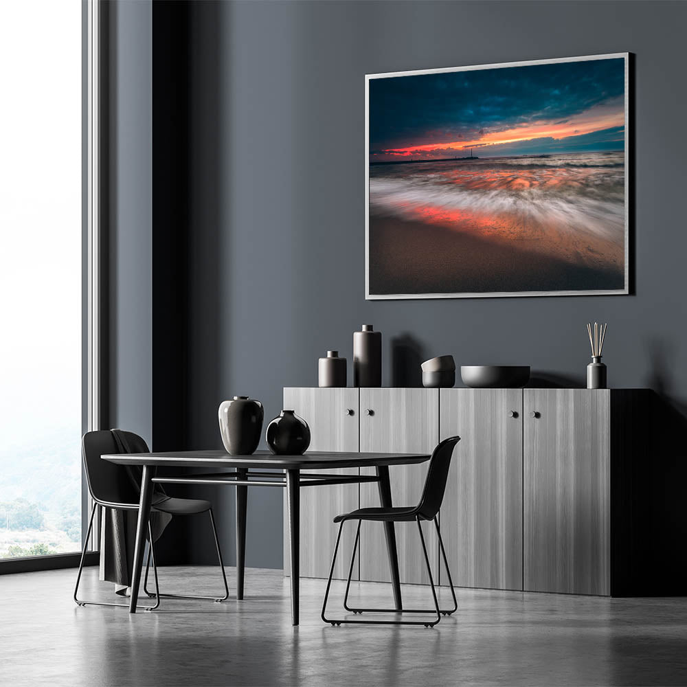 - High-resolution print capturing the dynamic movement of the waves and the vivid colors of the sunset.
