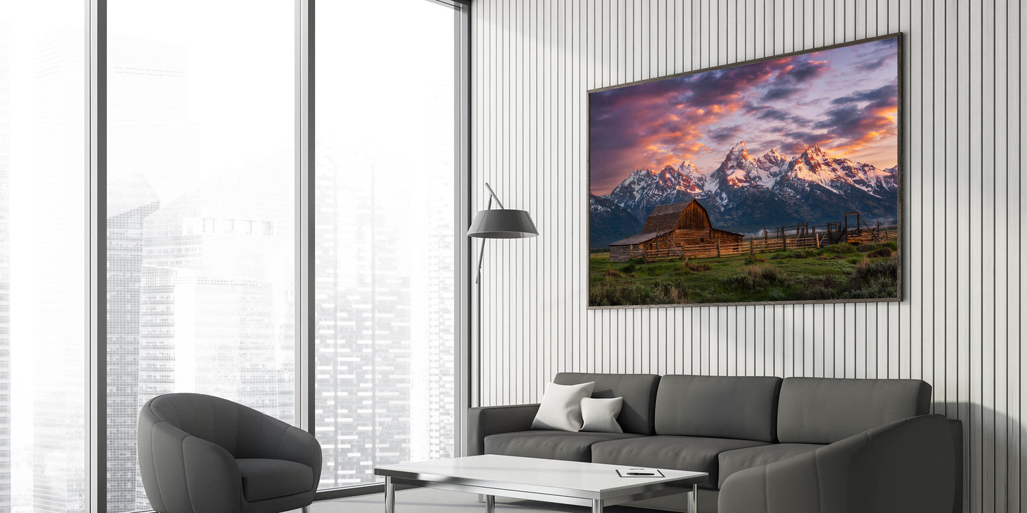 This Grand Teton scenic print brings the beauty of a glowing sunset and the rustic charm of a barn into your home, creating a peaceful and inviting atmosphere.