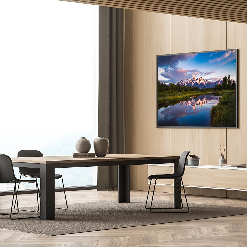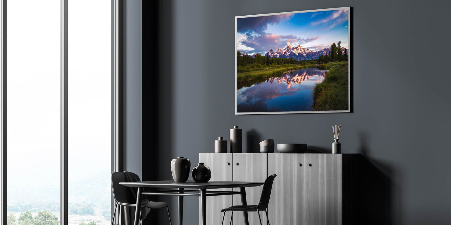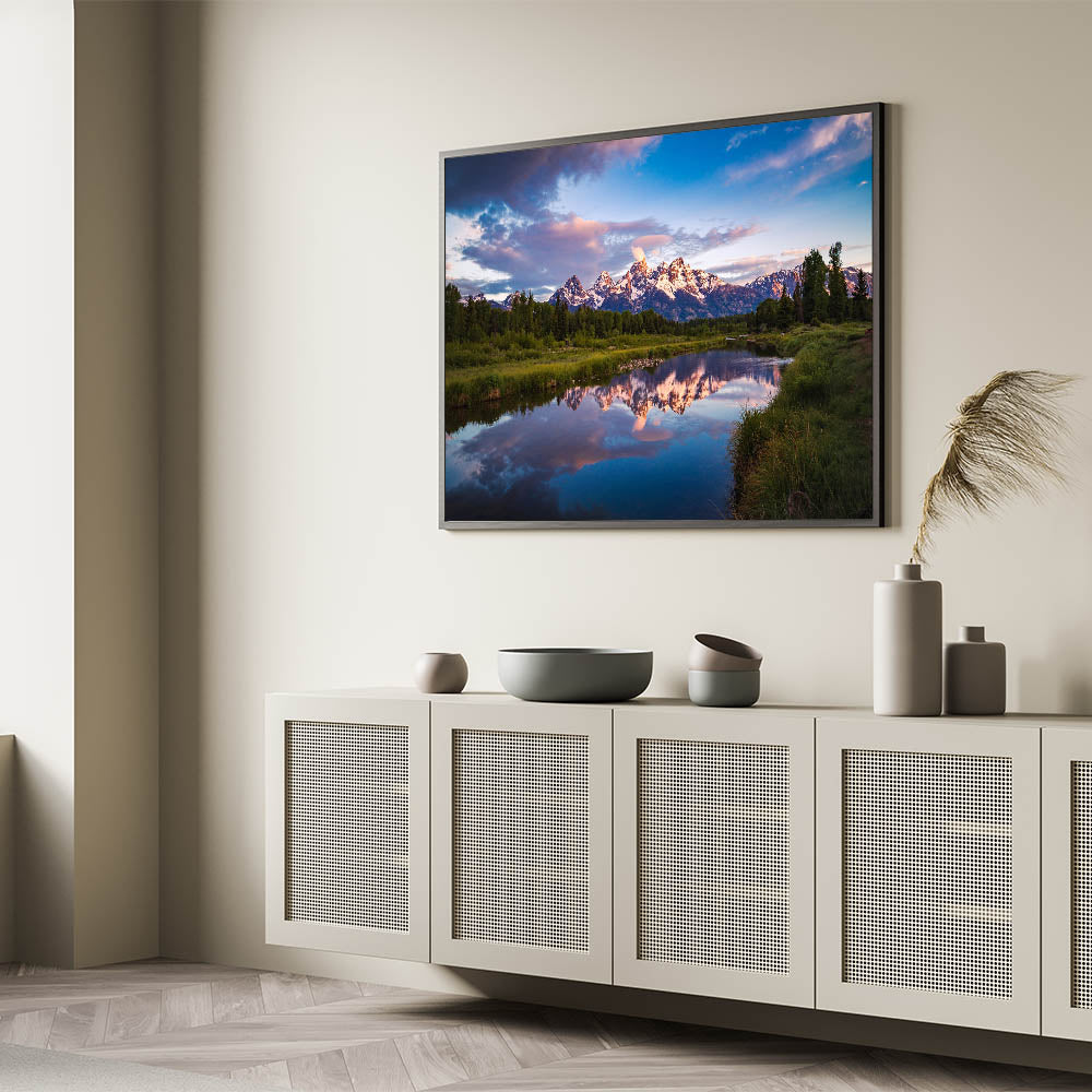 This Grand Teton scenic print brings the peaceful beauty of mountain reflections and vibrant sunsets into your space, creating a calming and inviting atmosphere.