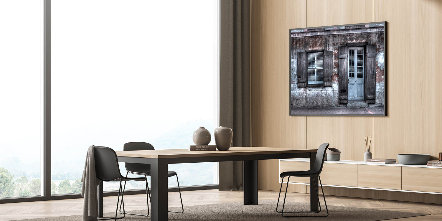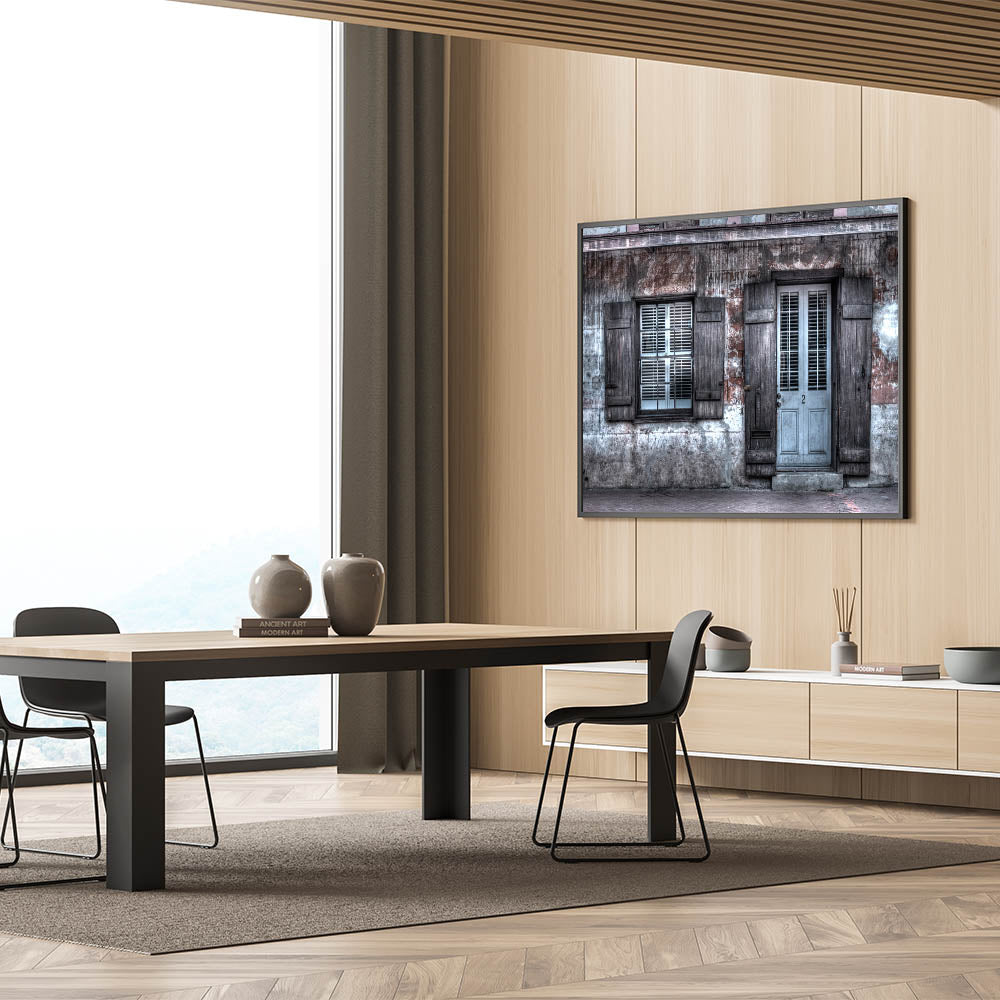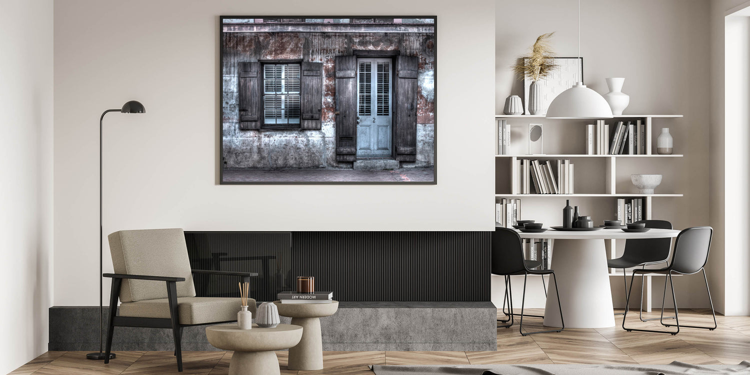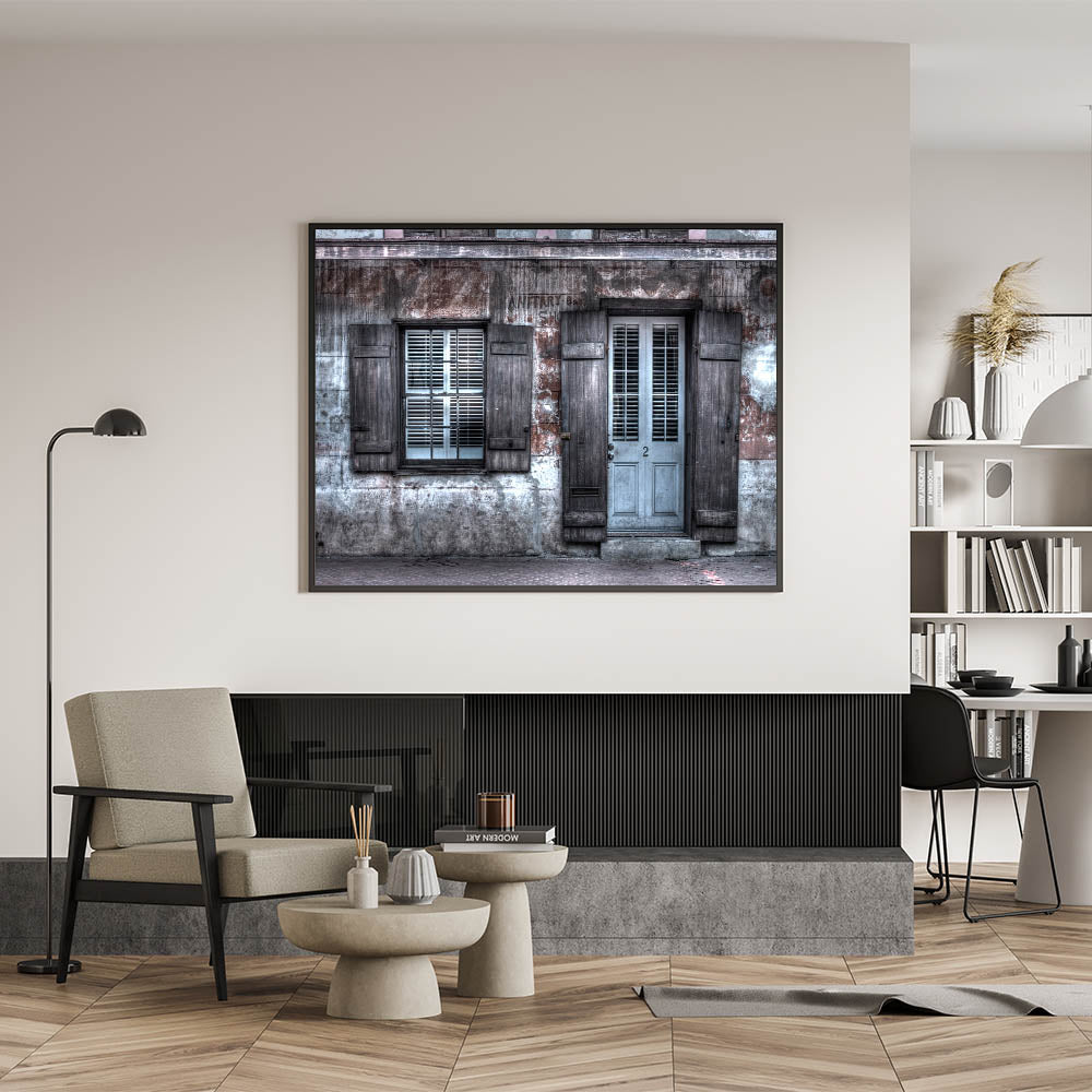 Step into the charm of New Orleans with this rustic architectural wall art, showcasing the weathered beauty of a historic building. This piece beautifully captures the essence of Louisiana's timeless architecture, with distressed wooden shutters and aged textures, evoking a sense of history and character. Perfect for those who love the unique and rustic charm of the Crescent City, this artwork adds a distinctive touch to any space.