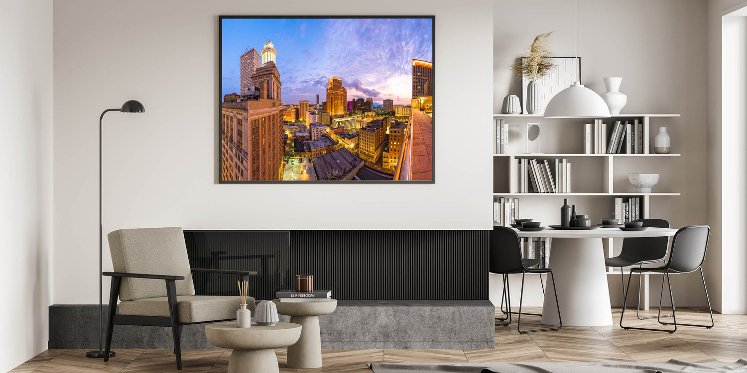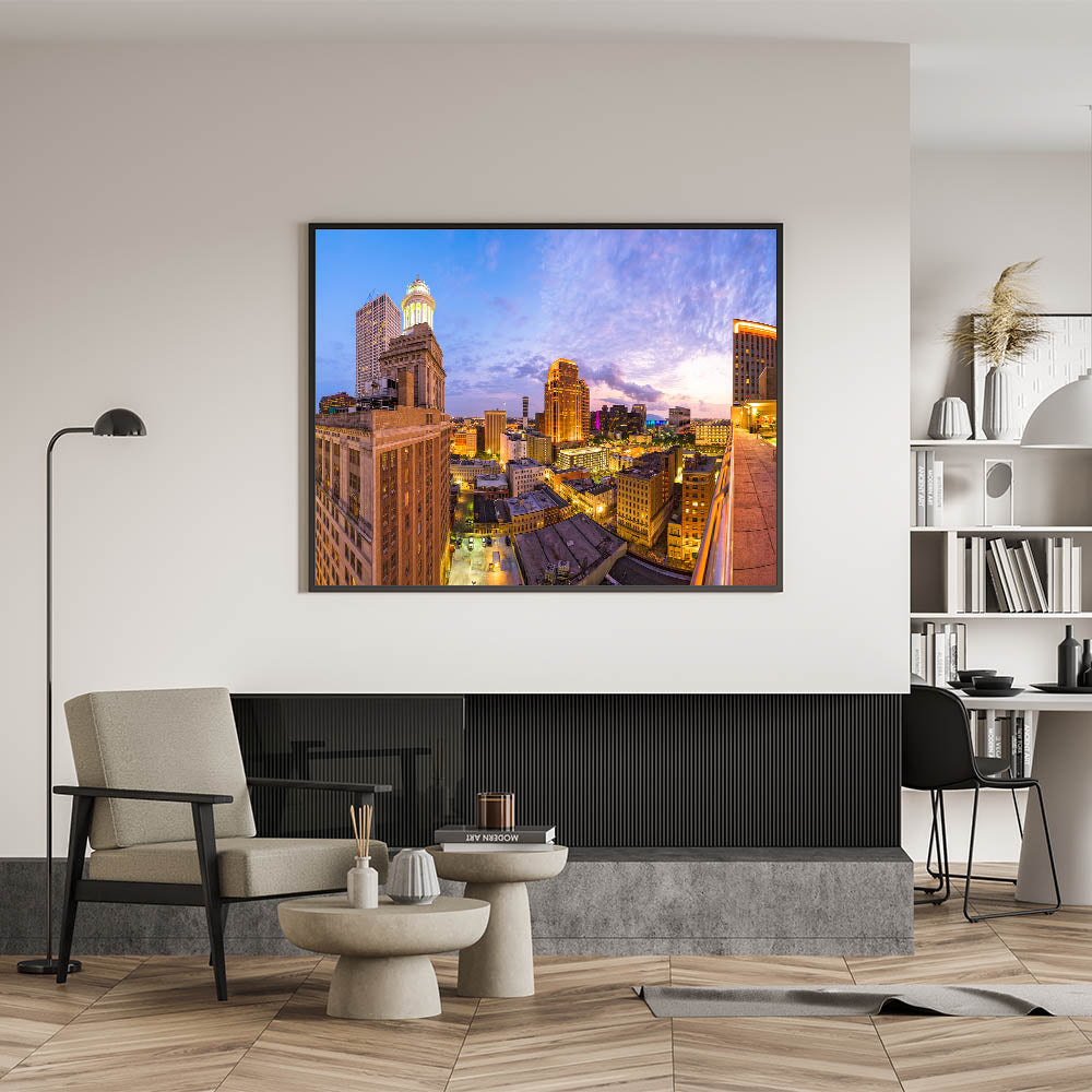 Capture the dazzling beauty of New Orleans from a rooftop perspective with this vibrant skyline art print. Featuring the city illuminated under the soft glow of a stunning sunset, this piece brings the charm and energy of the Crescent City into your space. The warm lights and iconic architecture create a sense of grandeur, perfect for anyone looking to showcase the lively spirit of New Orleans.