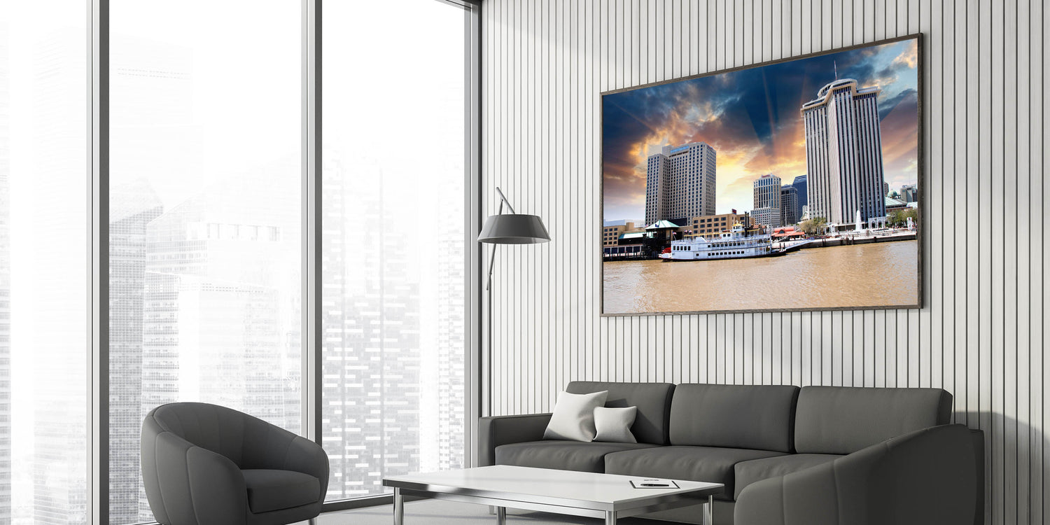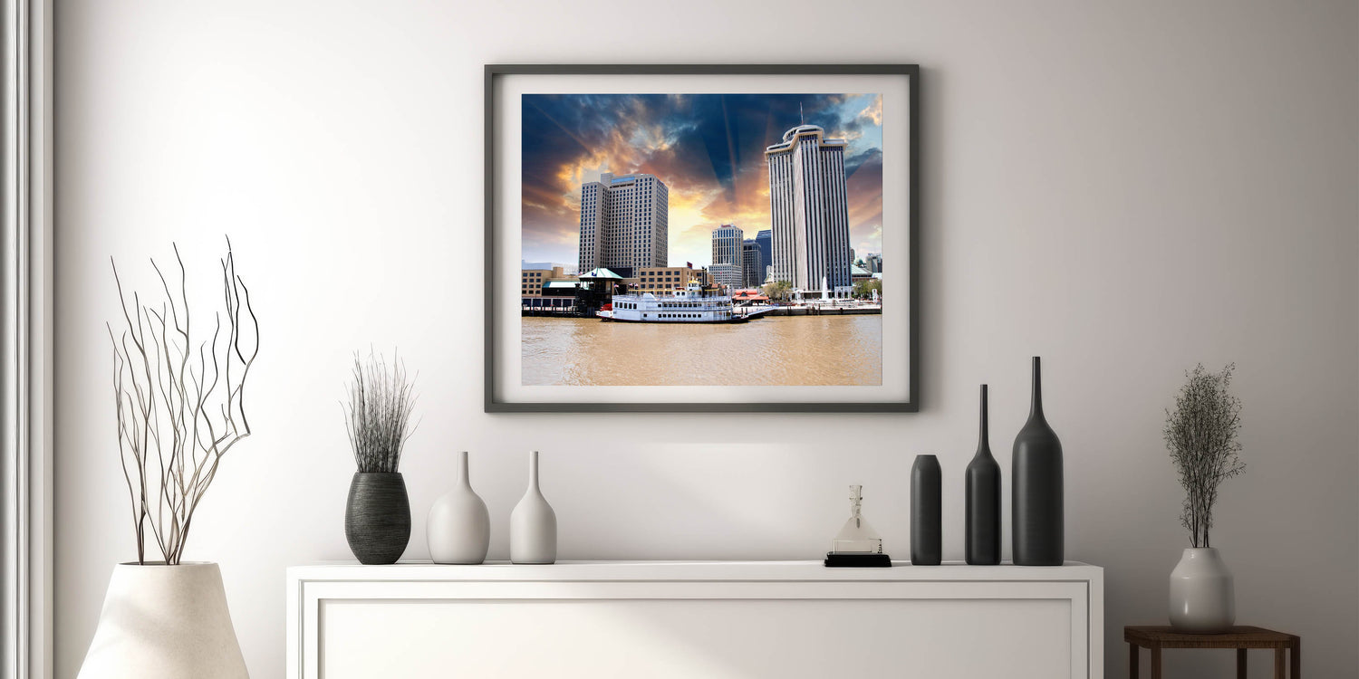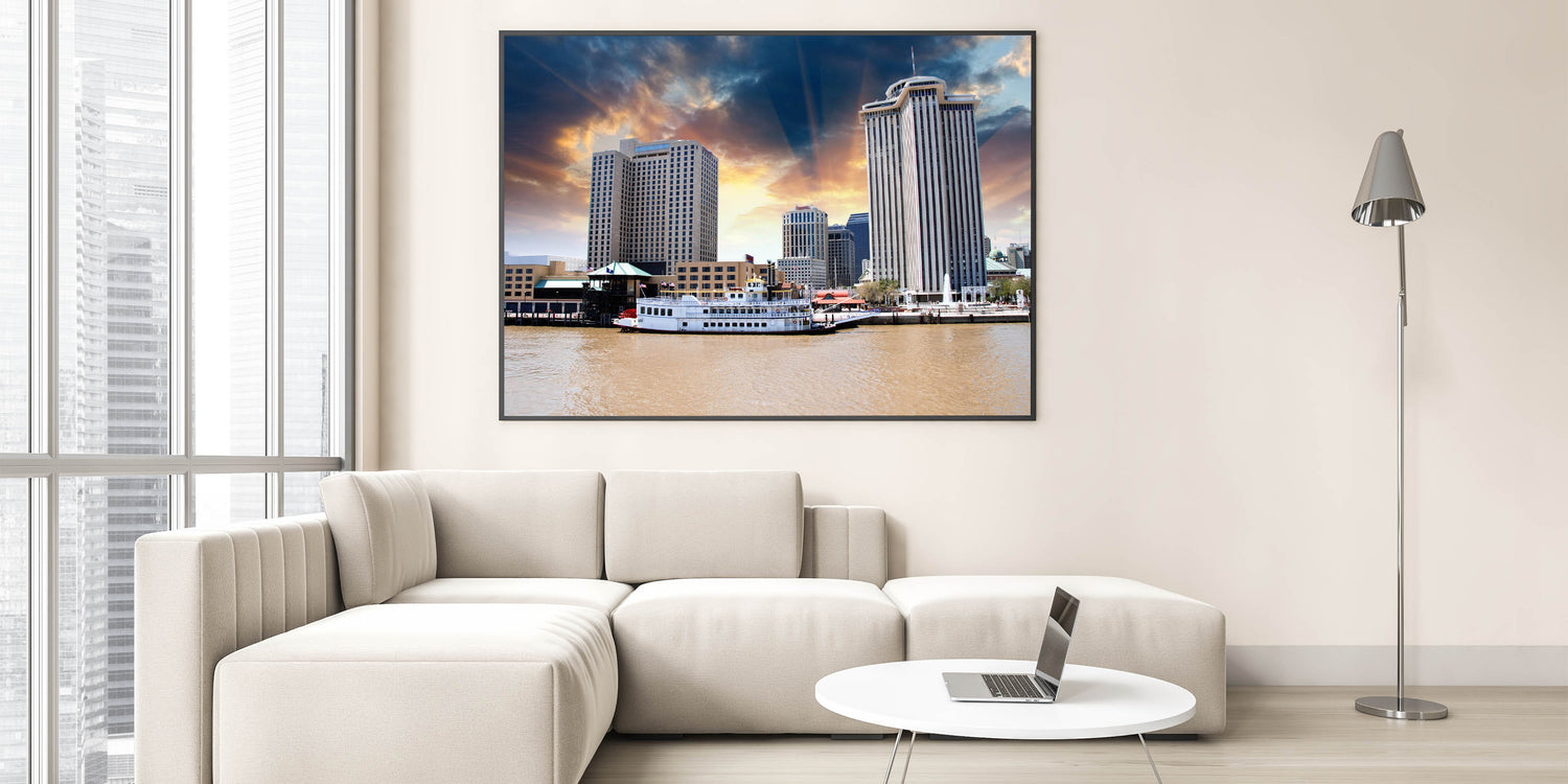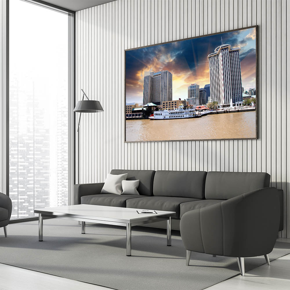 Capture the vibrant energy of New Orleans with this stunning wall art featuring the iconic skyline of the city. This piece encapsulates the heart of the Crescent City, where historic architecture meets modern urban life, beautifully displayed under a striking sunset. Whether you're looking to bring a piece of the French Quarter into your home or office, this artwork is the perfect blend of elegance and New Orleans culture.