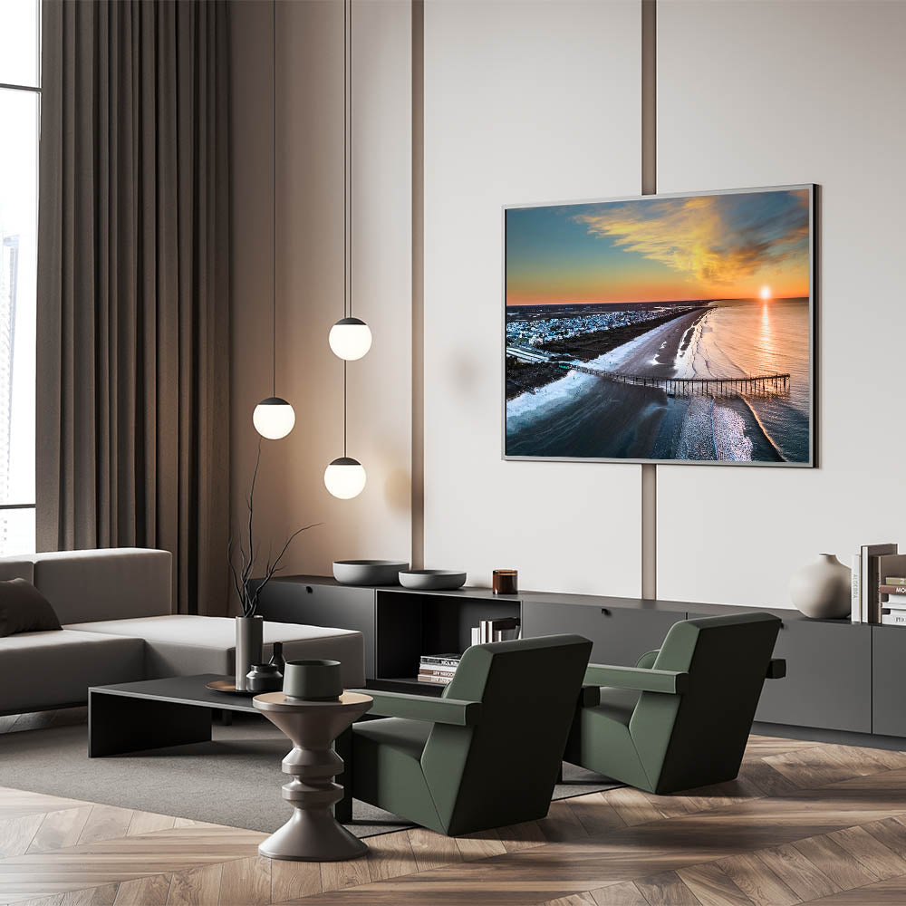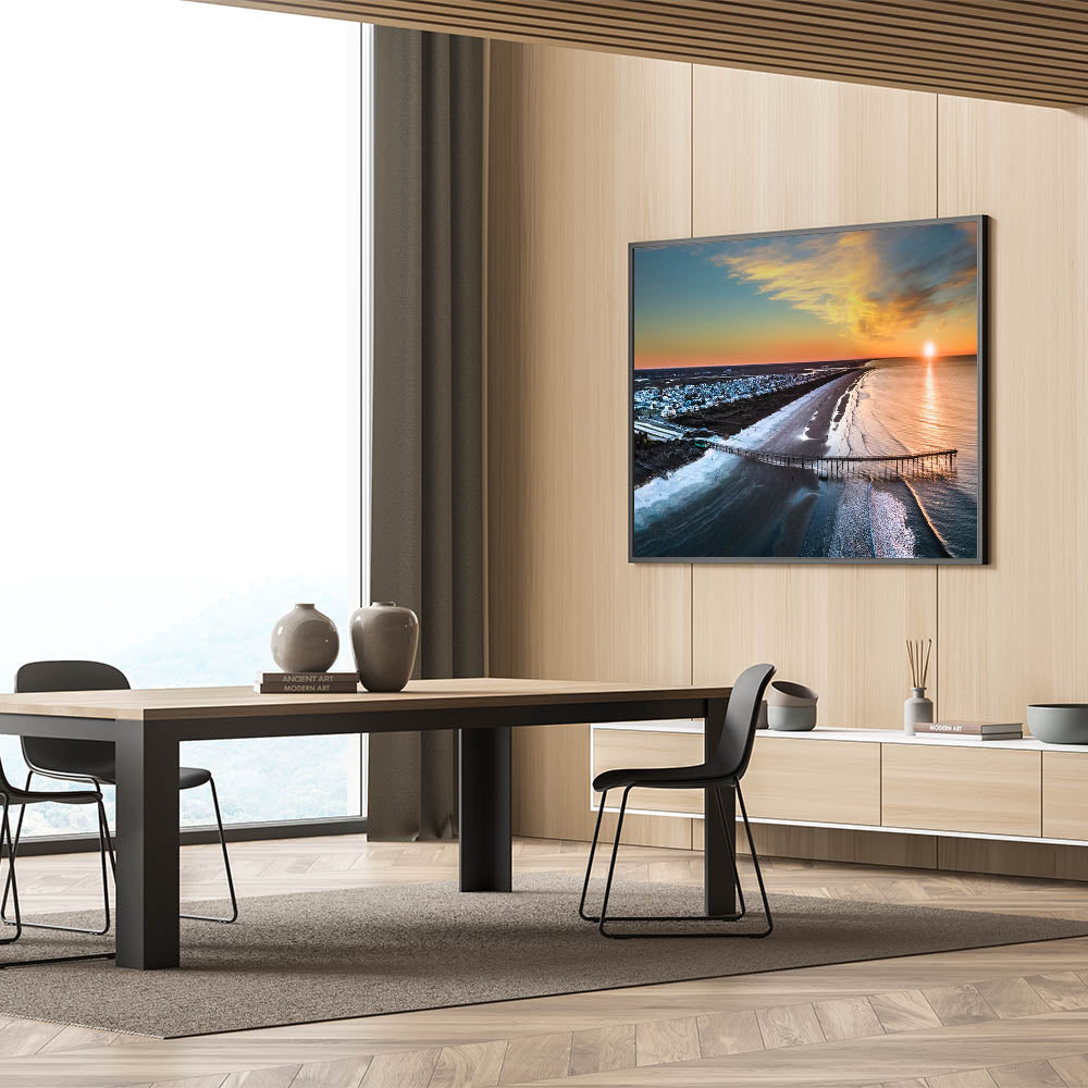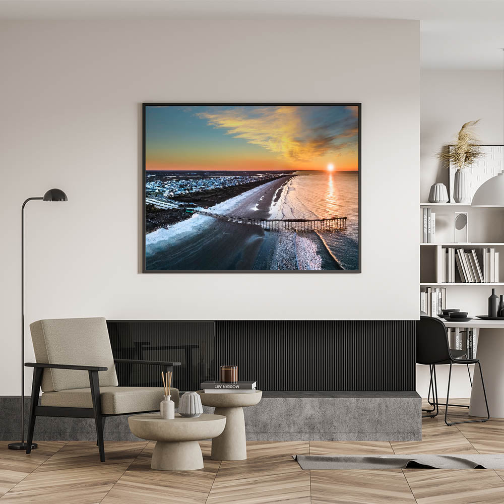Immerse yourself in the stunning coastal beauty of the Outer Banks with this breathtaking aerial wall art. Capturing the peaceful shoreline and a vibrant sunset, this photograph showcases the iconic beauty of North Carolina’s coast from a unique perspective. Perfect for beach lovers and coastal decor enthusiasts, this artwork is an ideal addition to any living space.
