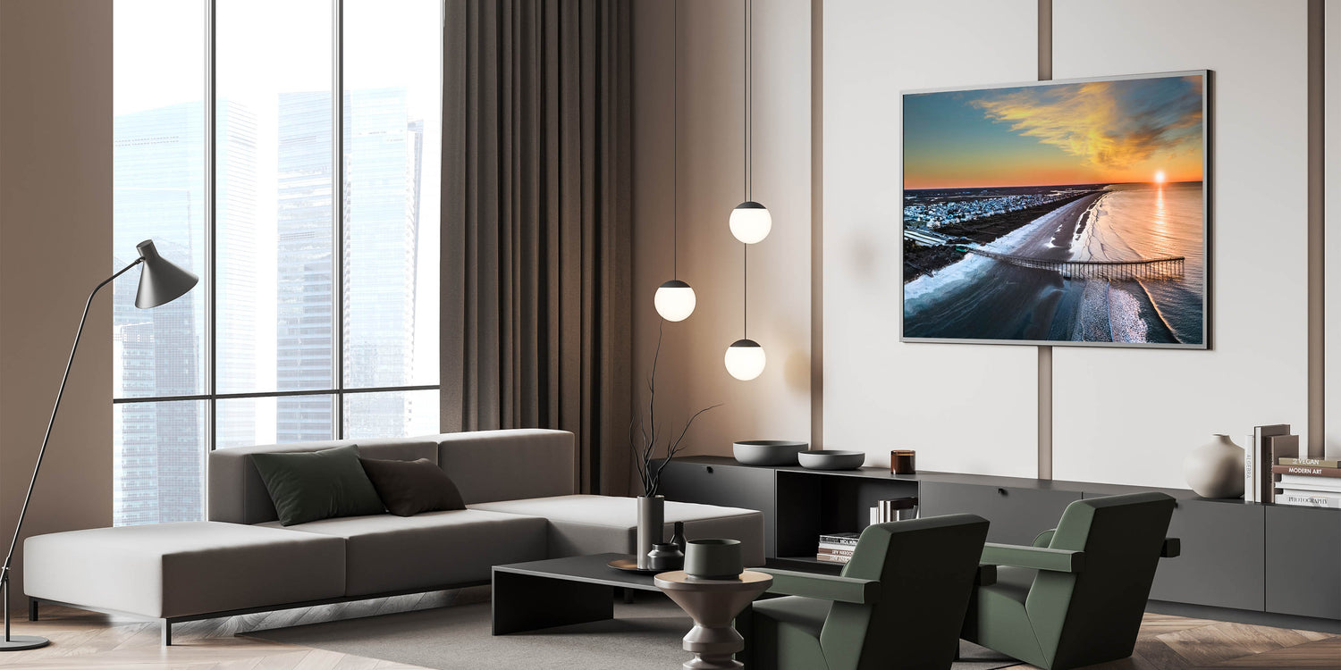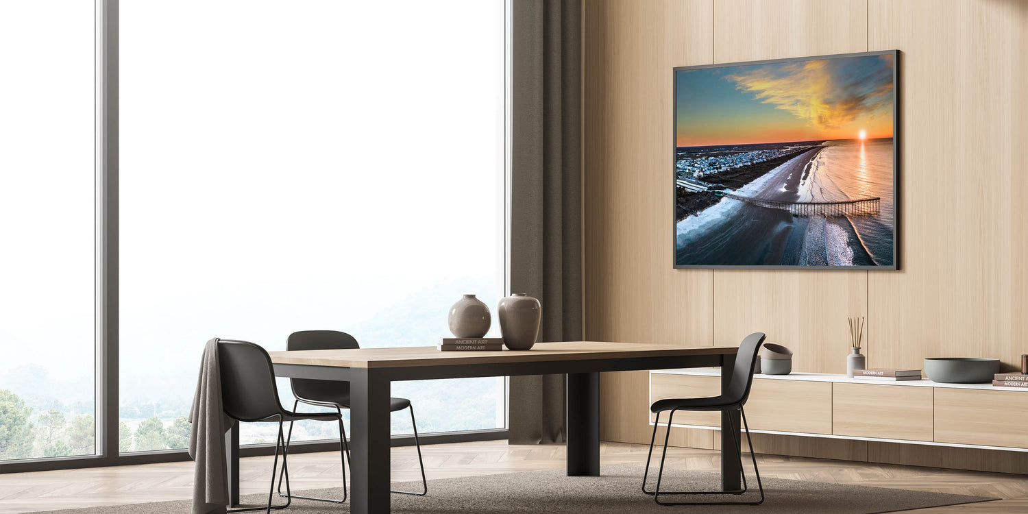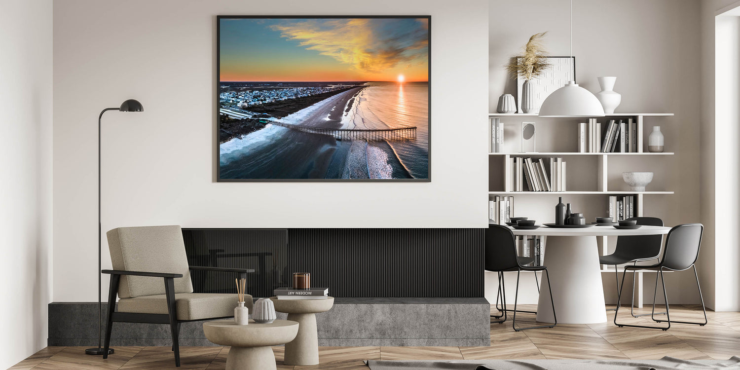 Immerse yourself in the stunning coastal beauty of the Outer Banks with this breathtaking aerial wall art. Capturing the peaceful shoreline and a vibrant sunset, this photograph showcases the iconic beauty of North Carolina’s coast from a unique perspective. Perfect for beach lovers and coastal decor enthusiasts, this artwork is an ideal addition to any living space.