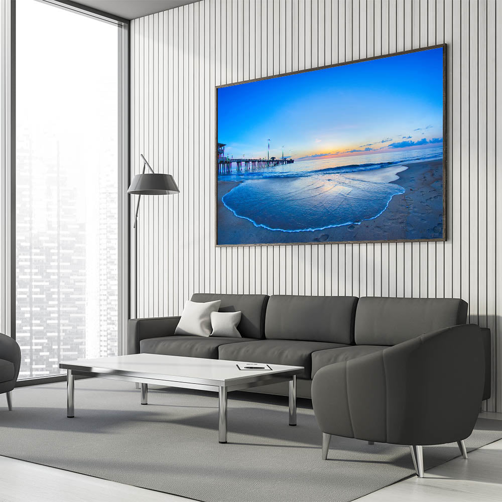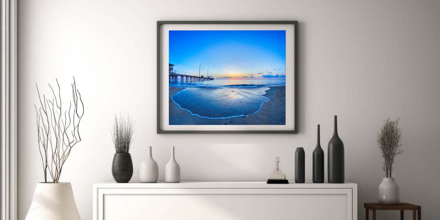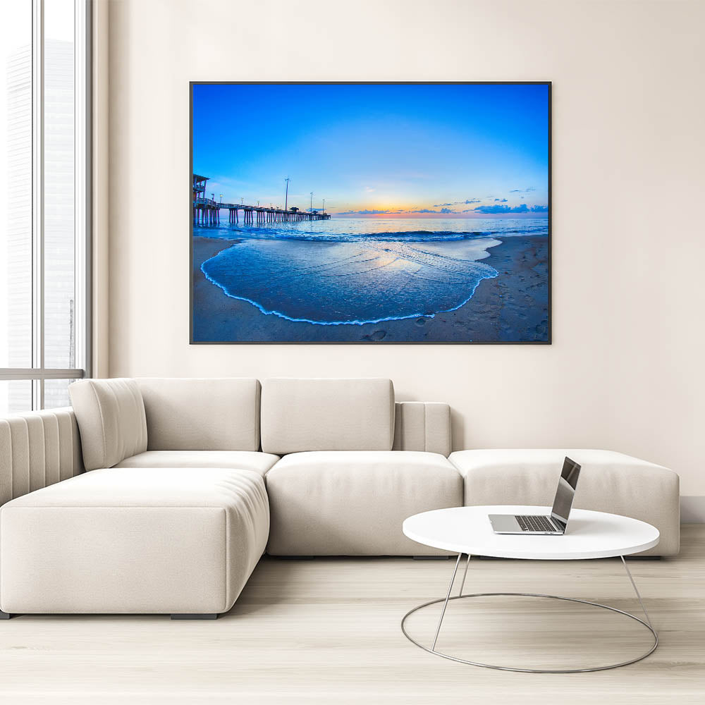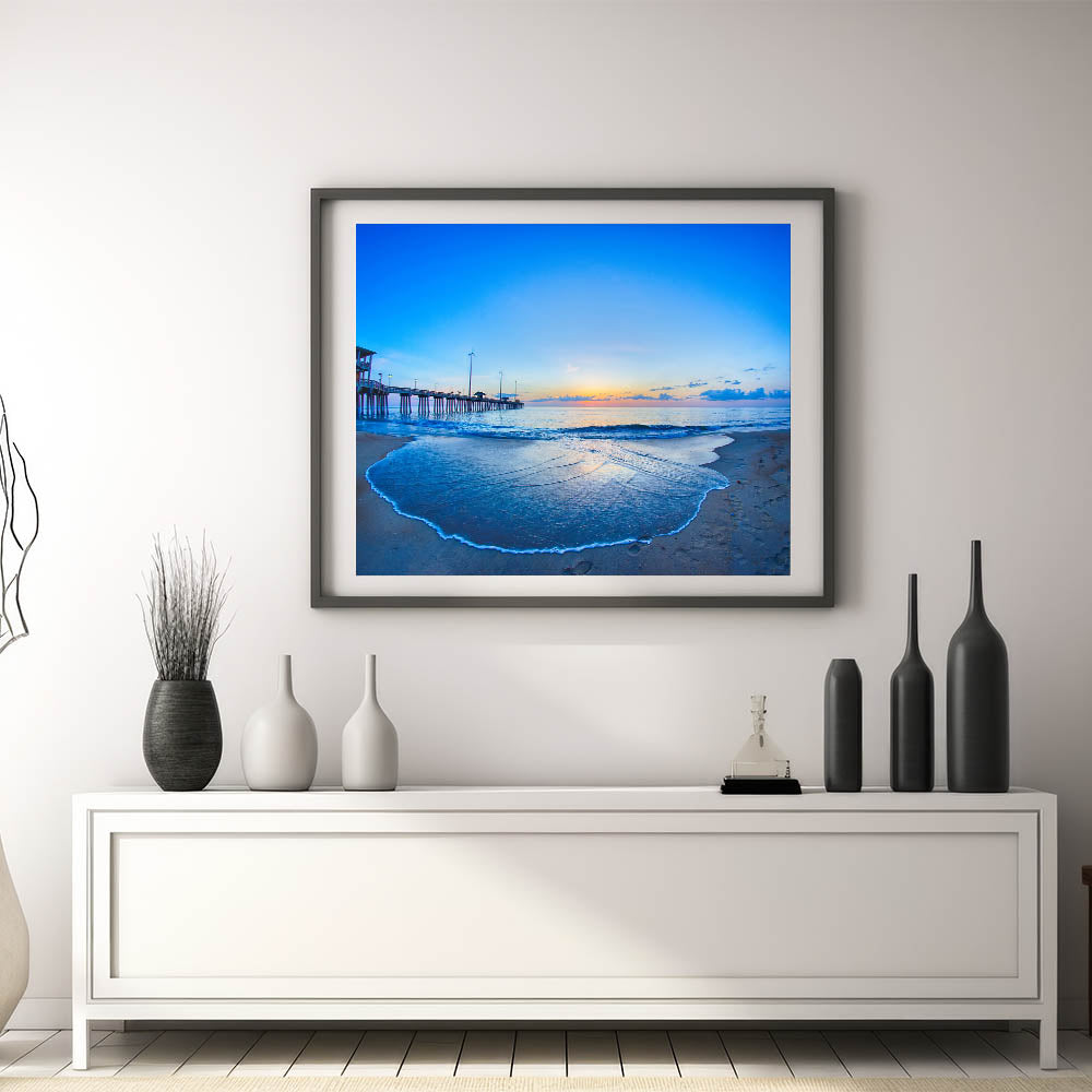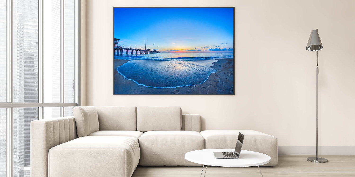 Bring the tranquility of the Outer Banks into your home with this stunning wall art featuring a serene coastal pier at sunrise. The soft colors of the early morning light reflect off the water, creating a peaceful and calming atmosphere. This piece is perfect for coastal decor lovers and anyone who wants to add a touch of North Carolina's natural beauty to their living space.