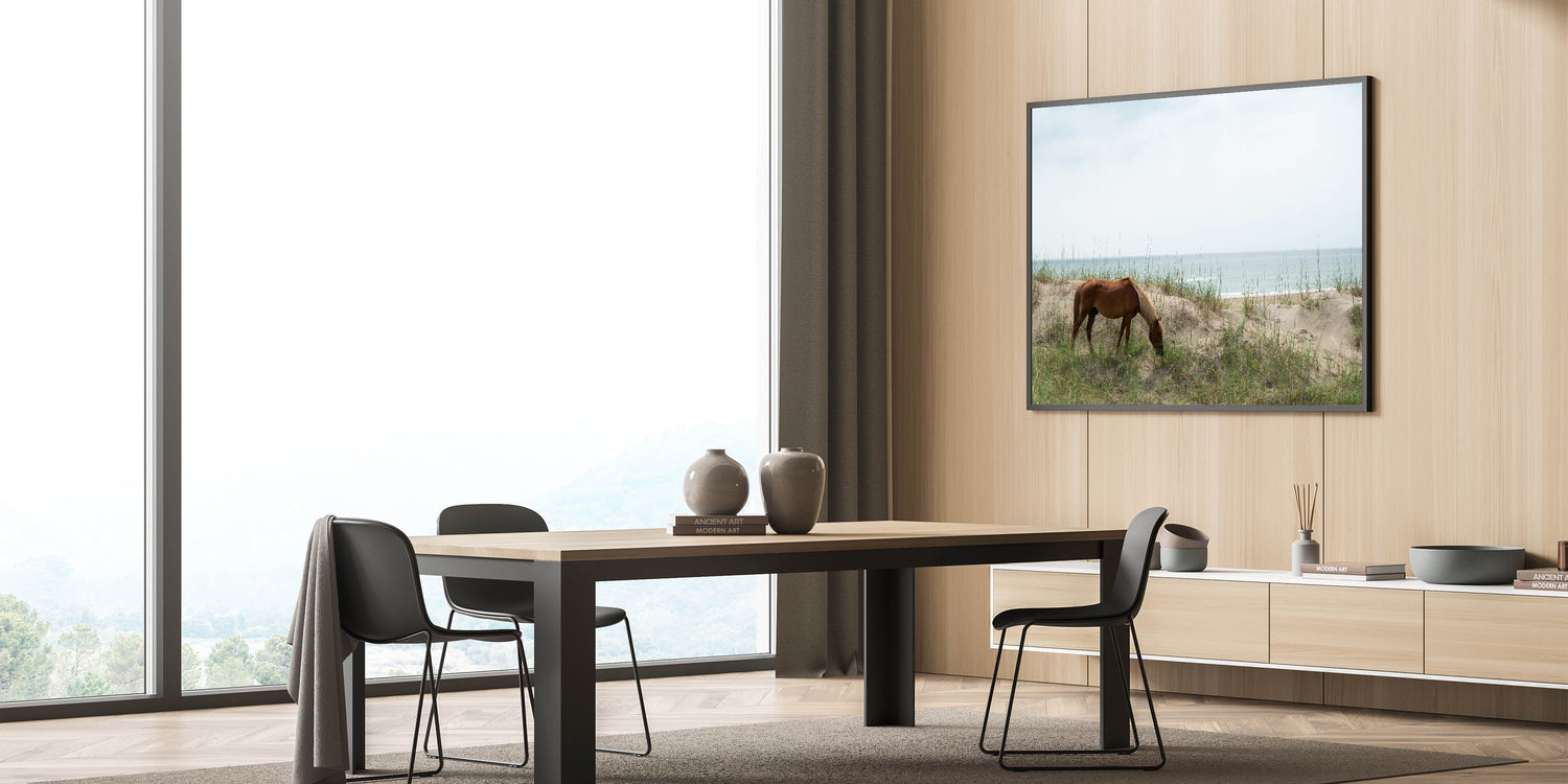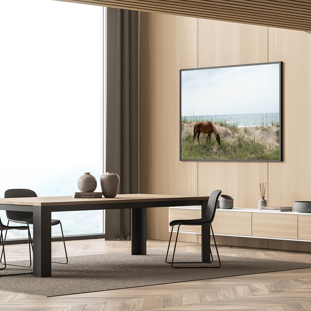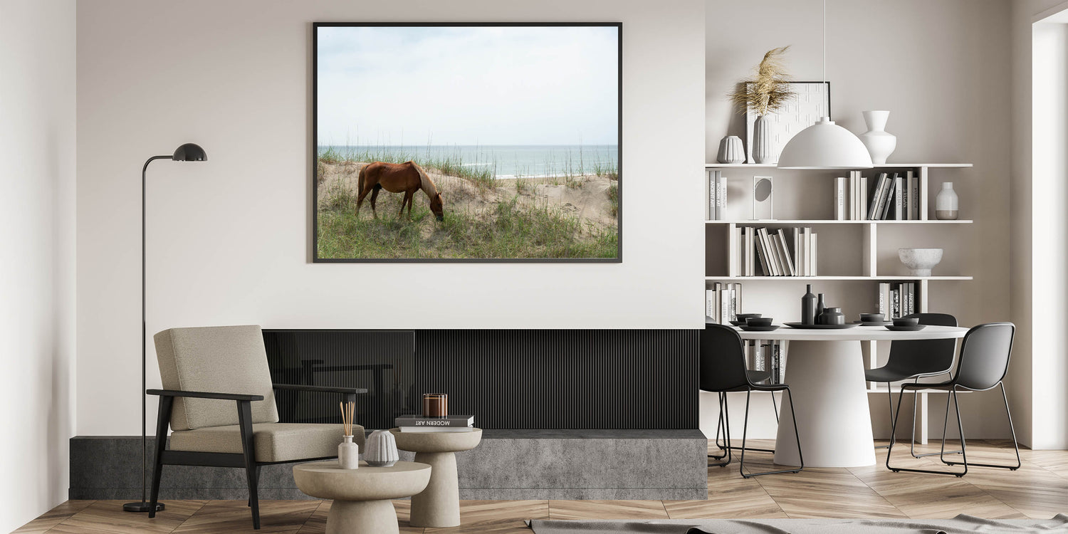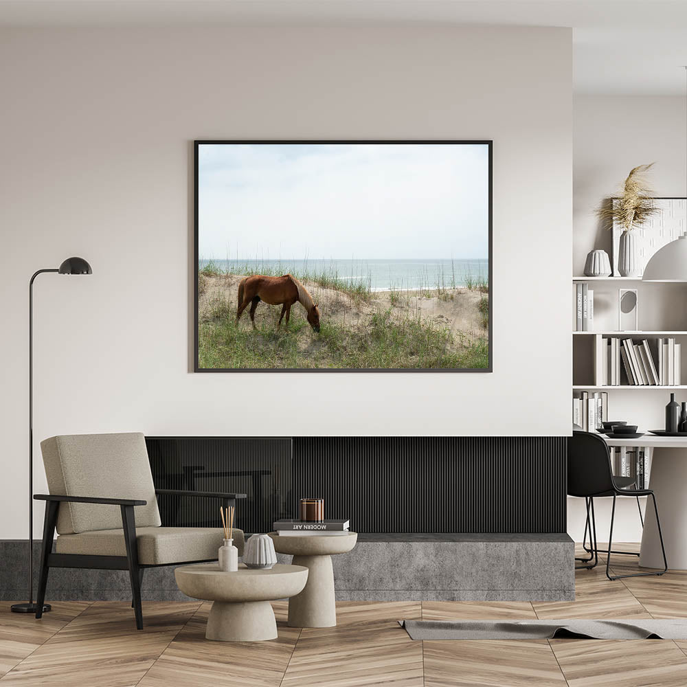 Embrace the untamed beauty of the Outer Banks with this stunning wall art featuring one of the region’s famous wild horses grazing by the coast. This captivating scene, with its natural beach grasses and ocean backdrop, reflects the free spirit and untouched charm of North Carolina's Outer Banks. This artwork is perfect for coastal and nature lovers, offering a unique piece of history and serenity for your space.