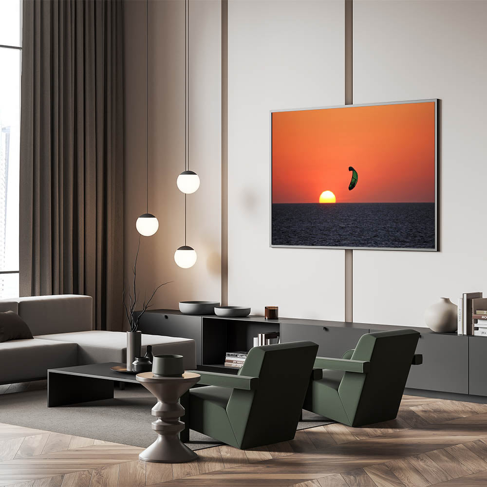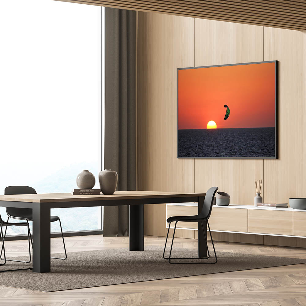 - High-resolution photography capturing the Outer Banks sunset and kite surfer in vivid detail.