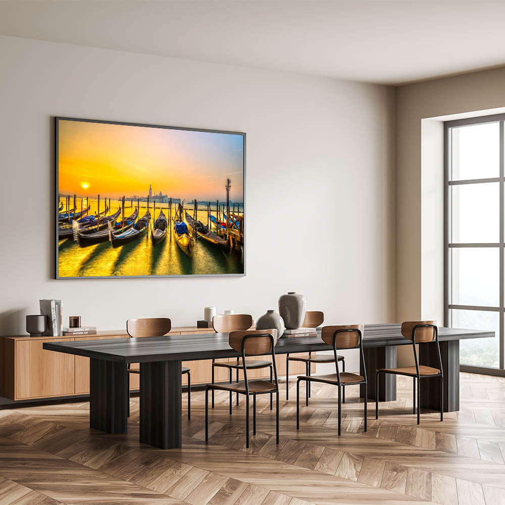 Add a touch of warmth and elegance to your space with this Venice canvas print, featuring gondolas resting on the calm waters of the lagoon at sunrise. The golden hues of the morning light reflecting off the water create a breathtaking scene that showcases the serene beauty of Venice.