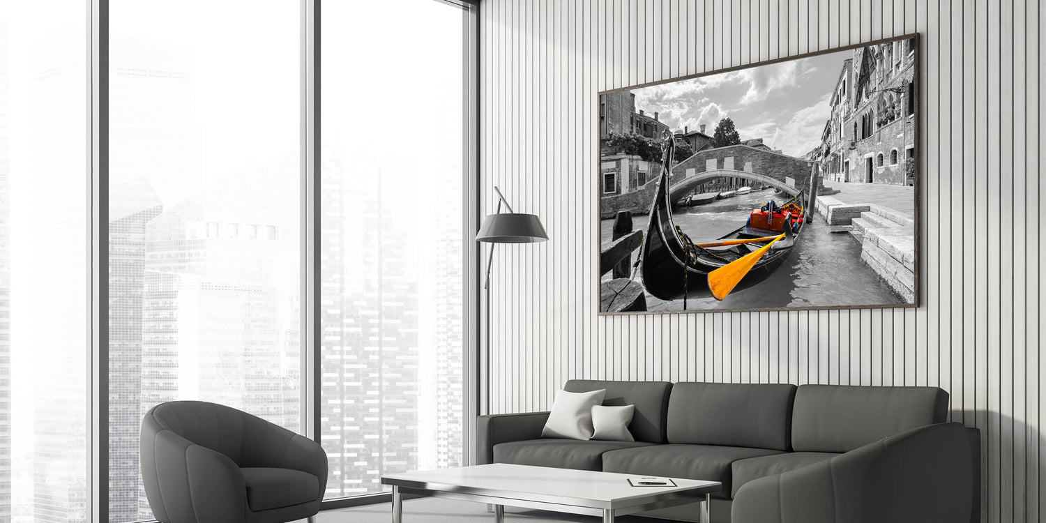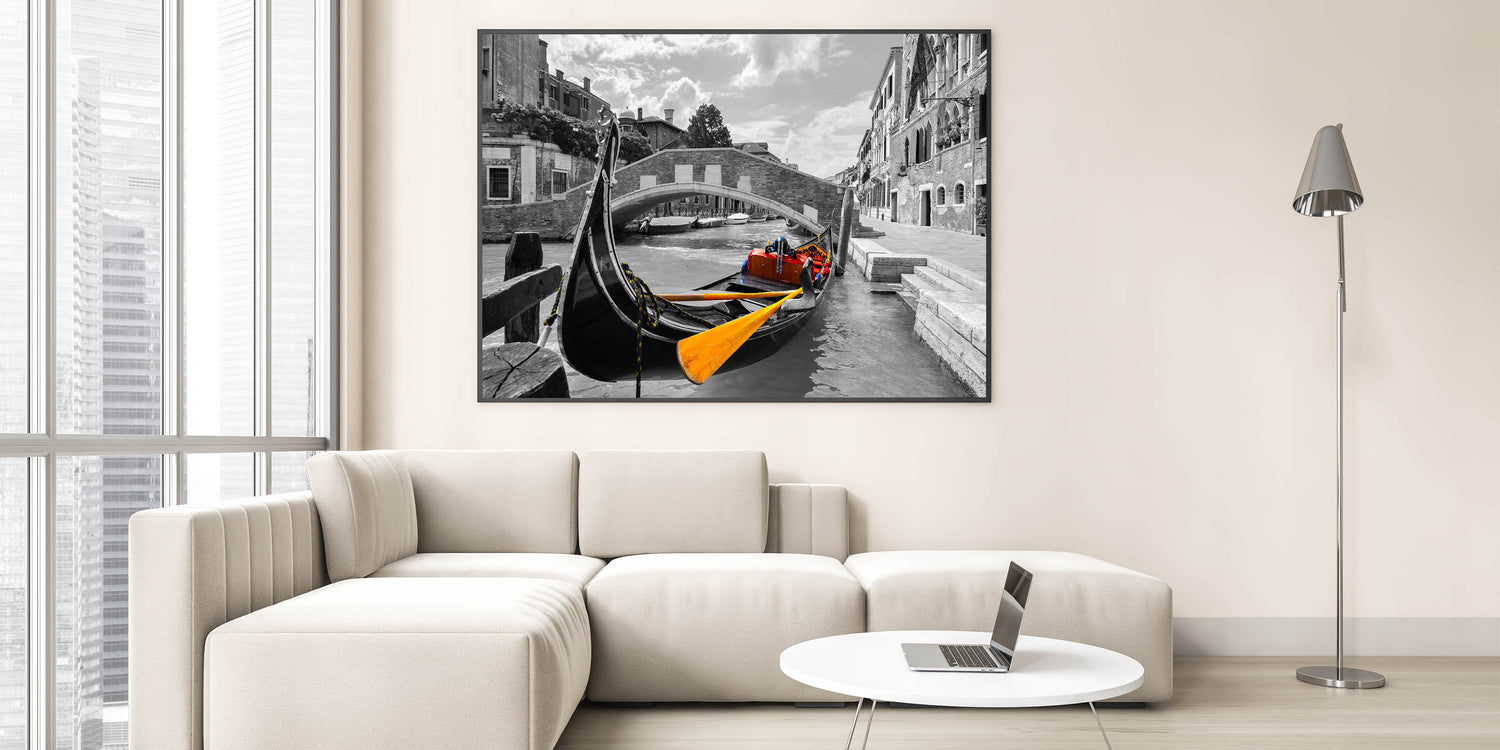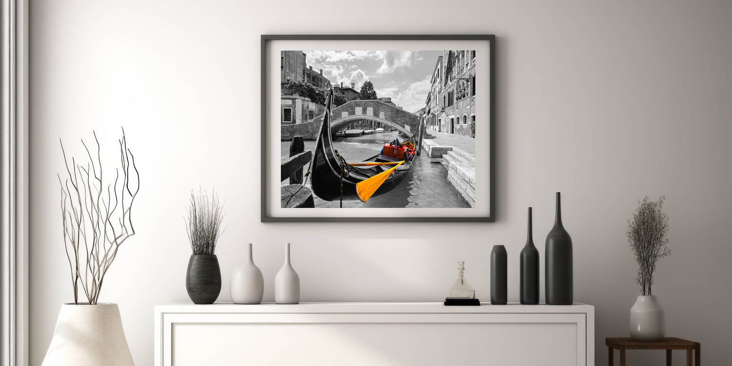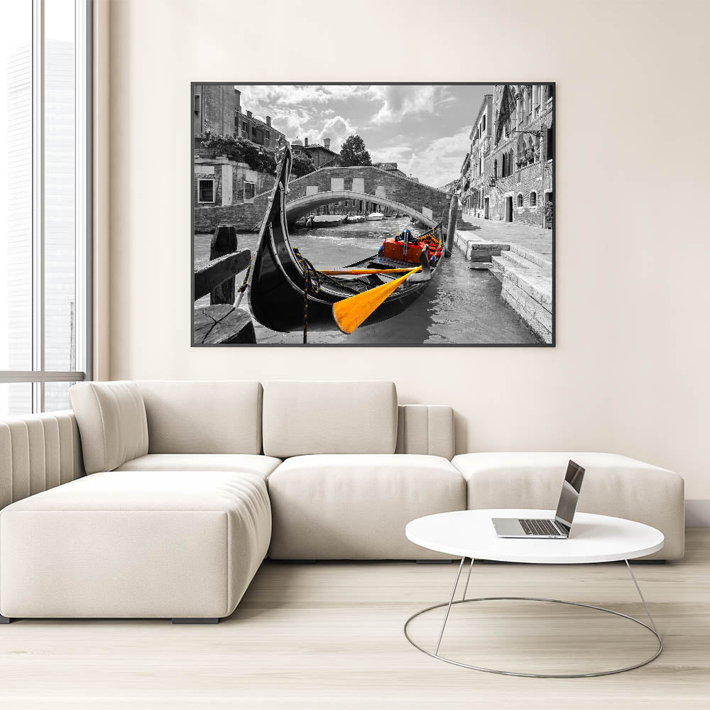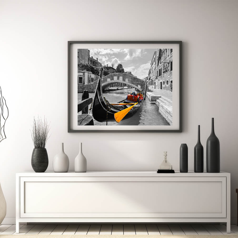 This striking Venice framed art captures a gondola at rest beside a historic stone bridge. With a unique pop of color against a black and white backdrop, this piece beautifully combines modern photography techniques with classic Venetian scenery, offering a perfect balance of history and artistry.