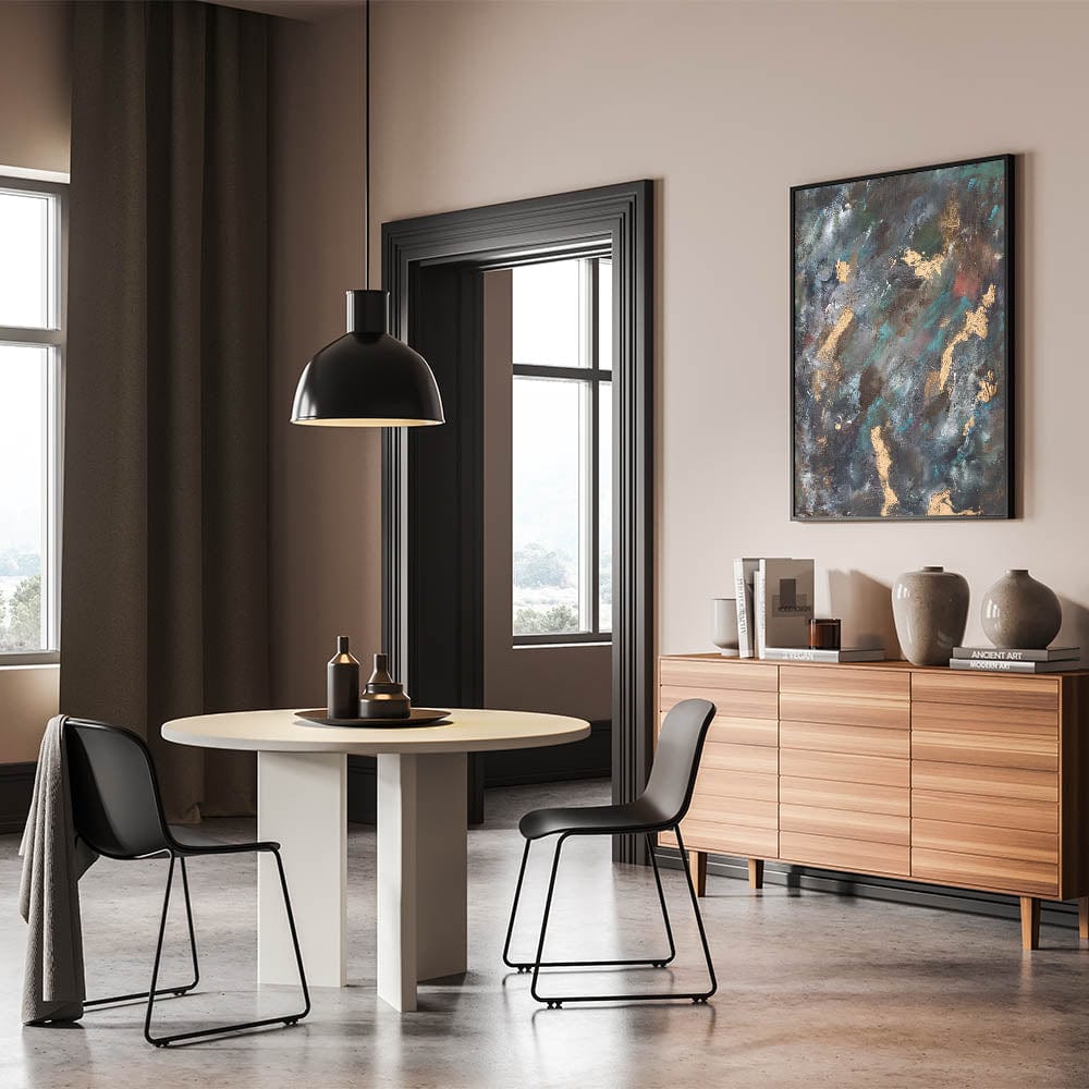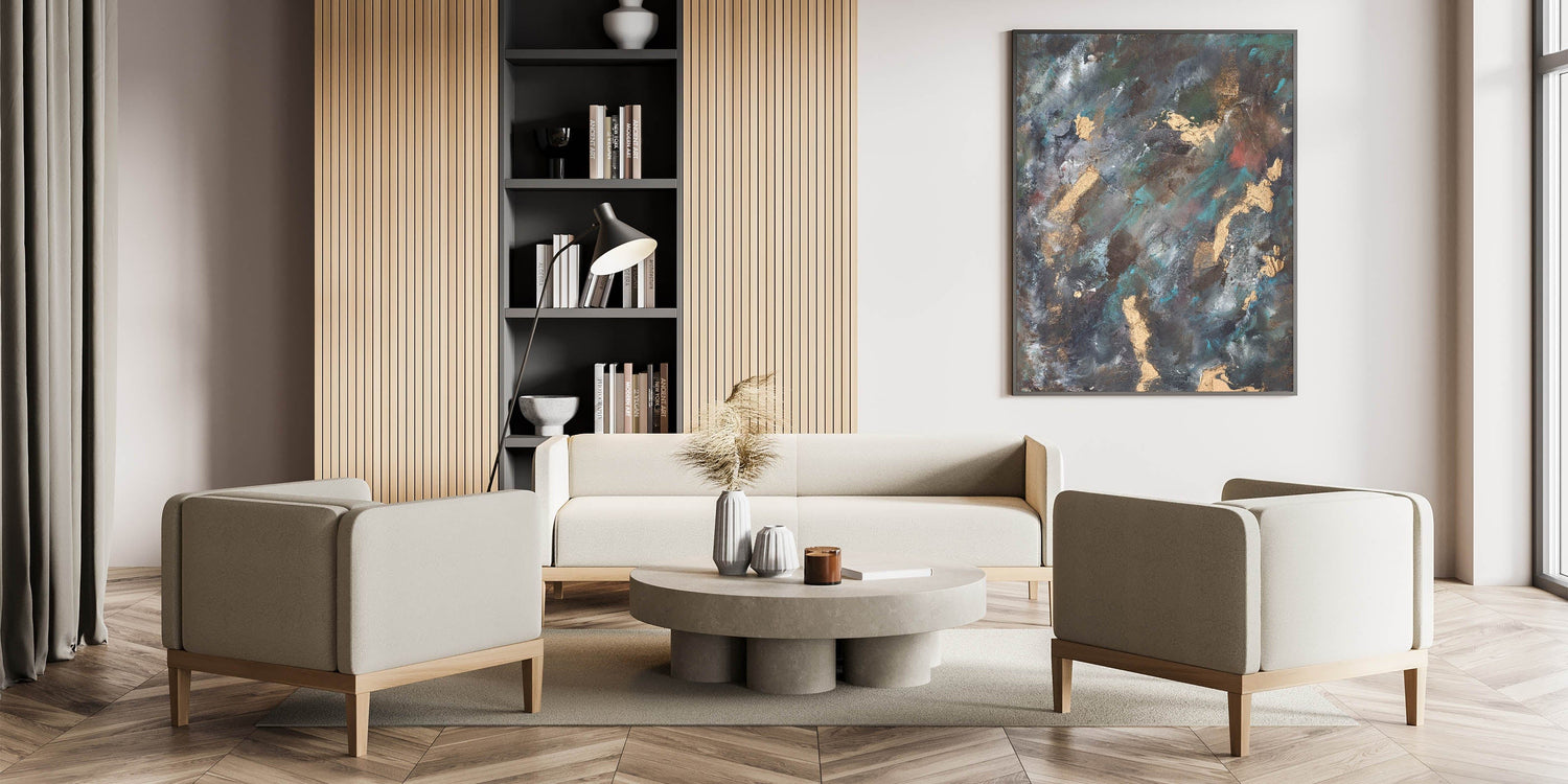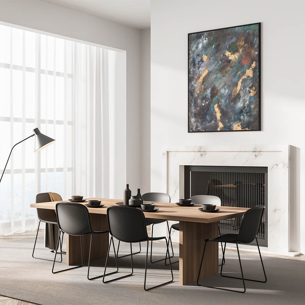 This large abstract wall art is perfect for those who appreciate moody, sophisticated decor with a luxurious edge. Its dark tones and shimmering gold accents create a timeless yet modern look. Add this contemporary abstract art to your collection and transform your space with bold artistic expression.