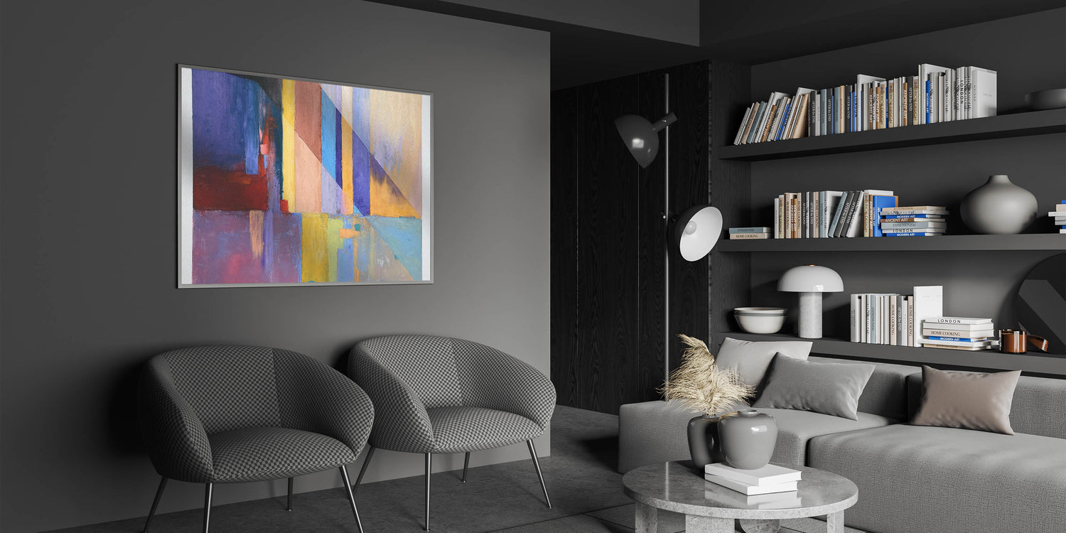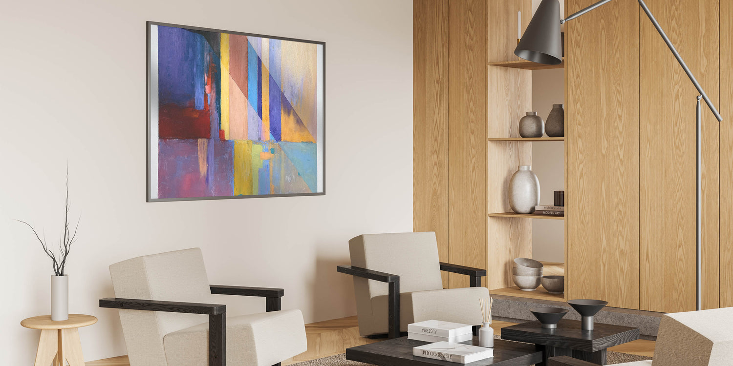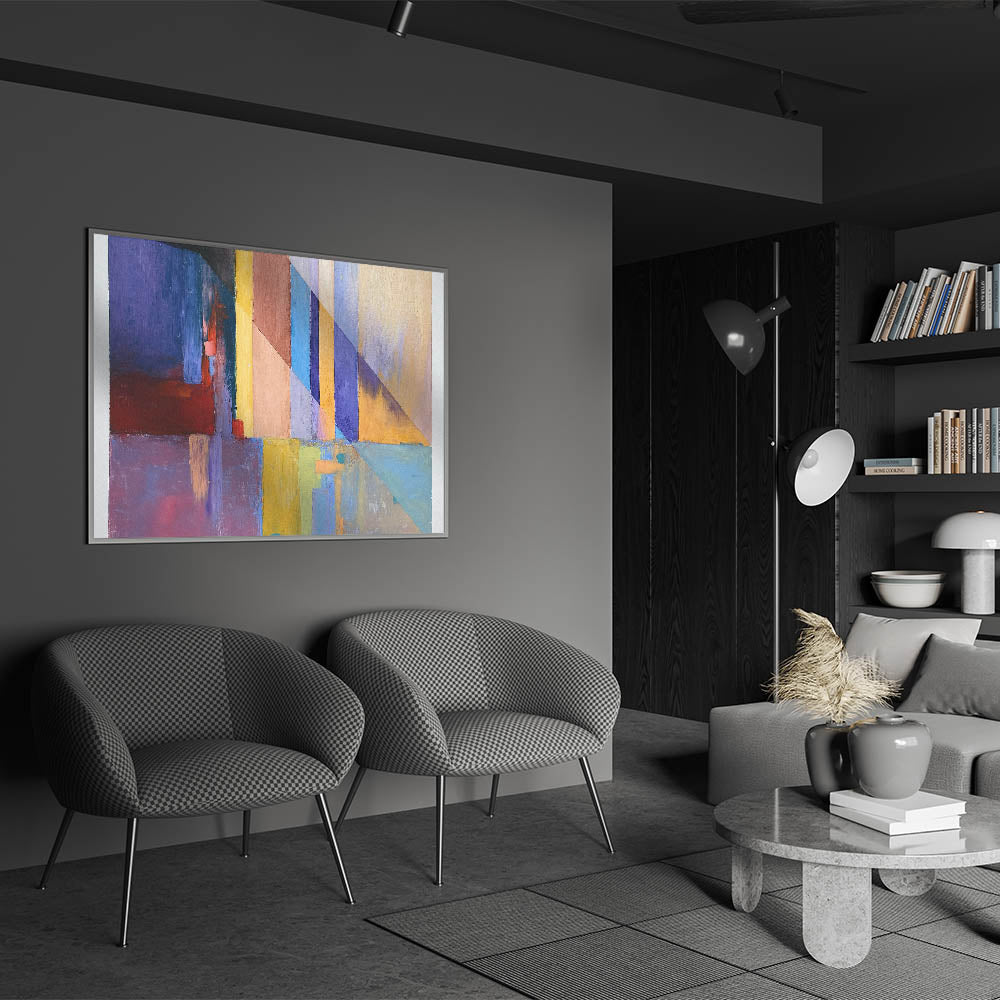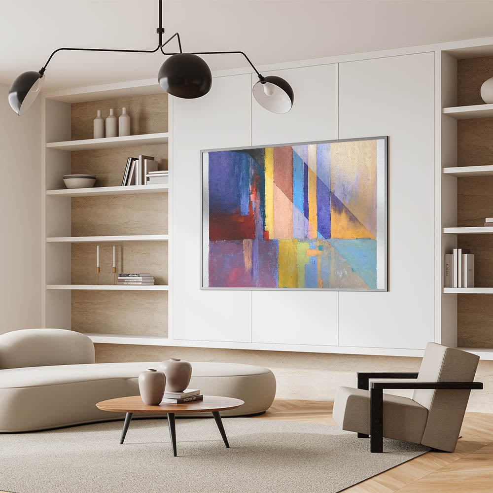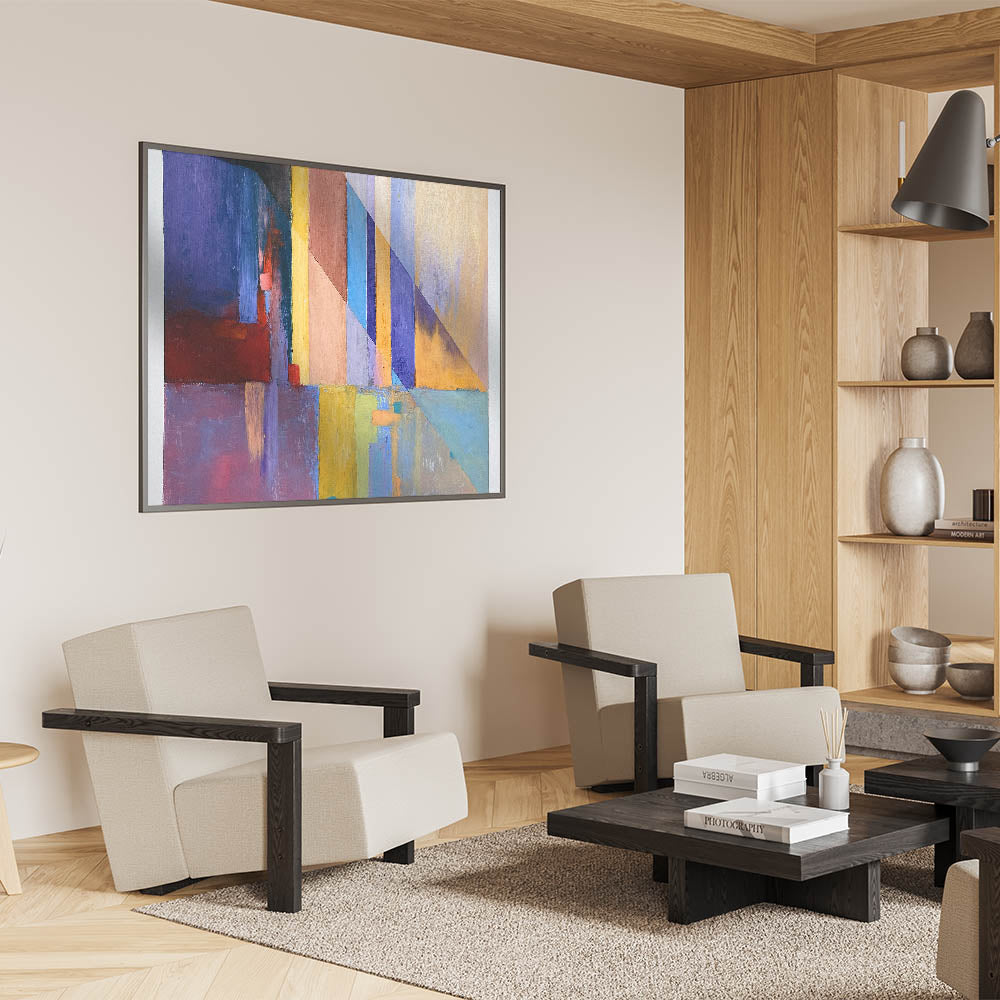 Infuse energy and sophistication into your space with this geometric abstract painting, featuring a striking interplay of blue, red, yellow, and purple hues. The sharp diagonal lines and layered color blocks create a modern, dynamic aesthetic, making this contemporary canvas print an ideal choice for bold interior designs. Whether placed in a living room, office, or gallery space, this large modern art piece serves as a captivating focal point.