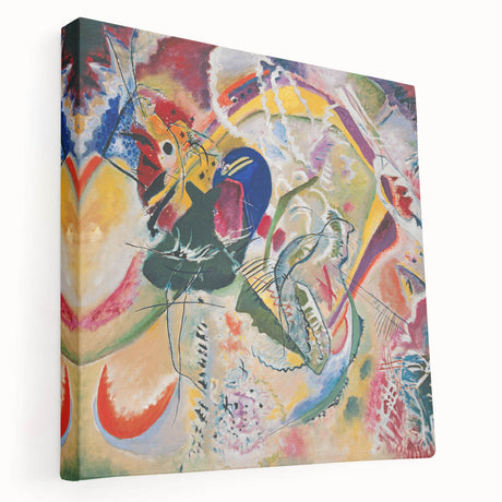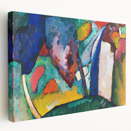 • Abstract figurative wall art on stretched canvas showcases vibrant colors and dynamic shapes, perfect for modern decor. Side view highlights its depth and texture, enhancing artistic appeal.
