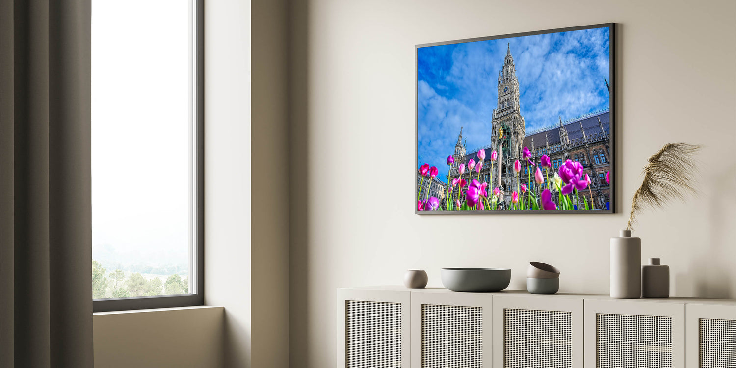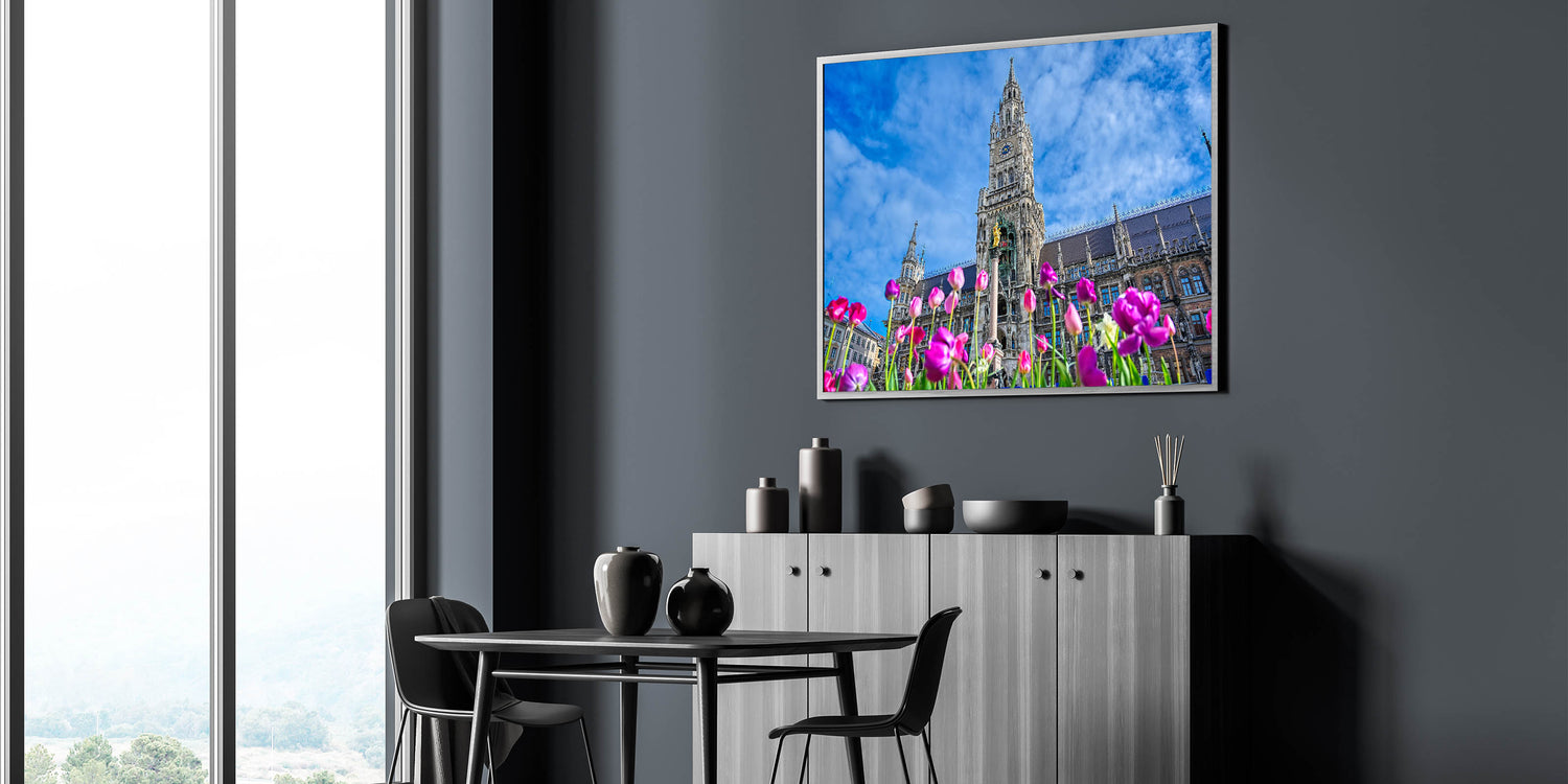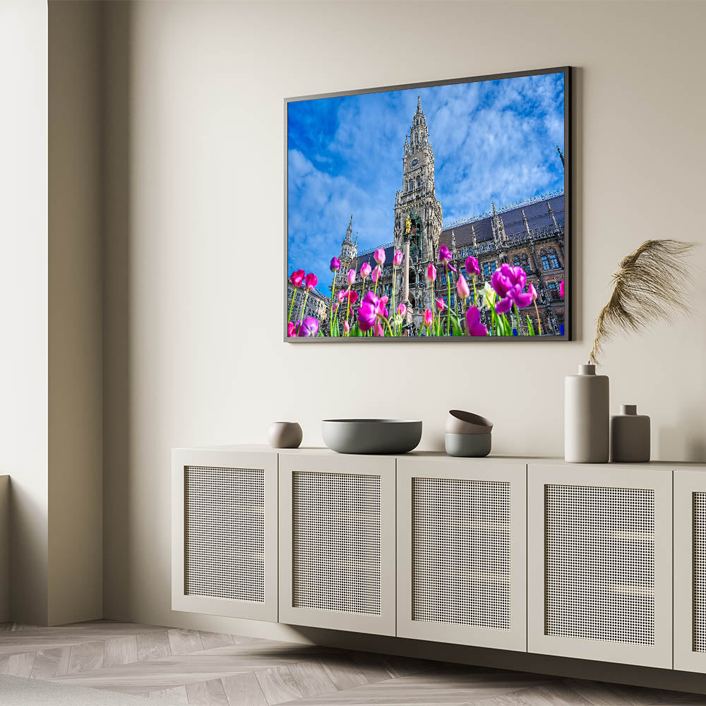 This vibrant wall art showcases a scenic view of Munich’s New Town Hall (Neues Rathaus) surrounded by colorful spring tulips. The juxtaposition of stunning Gothic architecture with the fresh burst of tulips against a blue sky captures the lively spirit of Bavaria. This German cityscape canvas is perfect for anyone who appreciates the beauty of Bavarian architecture and nature.