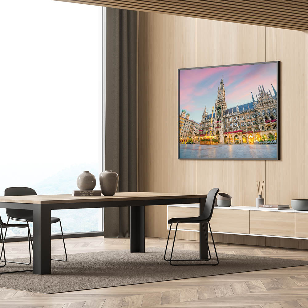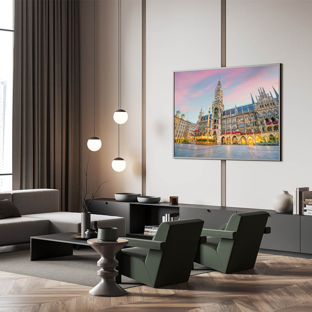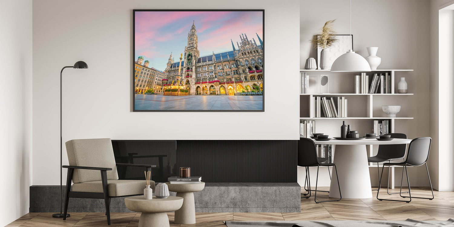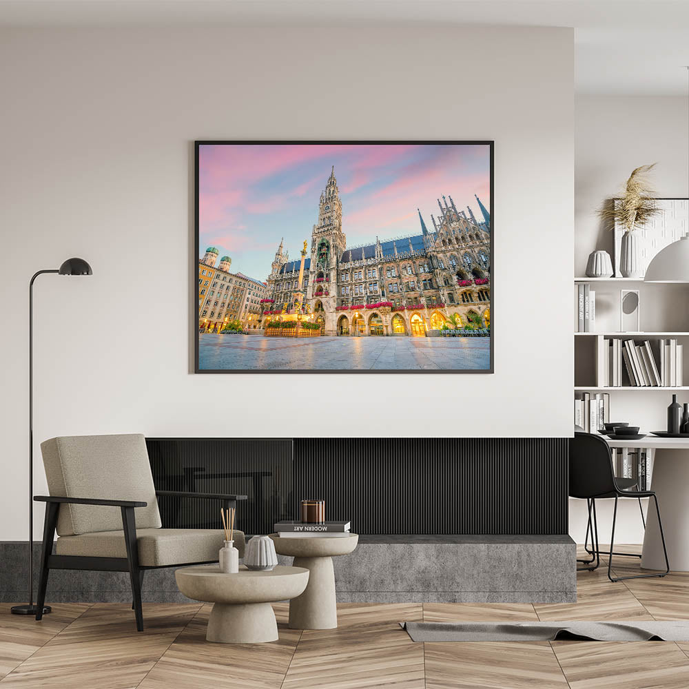 Bring a touch of Bavarian elegance into your home with this captivating wall art of Munich’s New Town Hall (Neues Rathaus) under a breathtaking sunset. The majestic Gothic architecture, framed by the colorful hues of the sky, creates a truly enchanting scene. This Munich cityscape wall art is perfect for those who appreciate historic landmarks and architectural beauty. Whether it’s for your living room, office, or hallway, this artwork will add sophistication and cultural depth to any space.