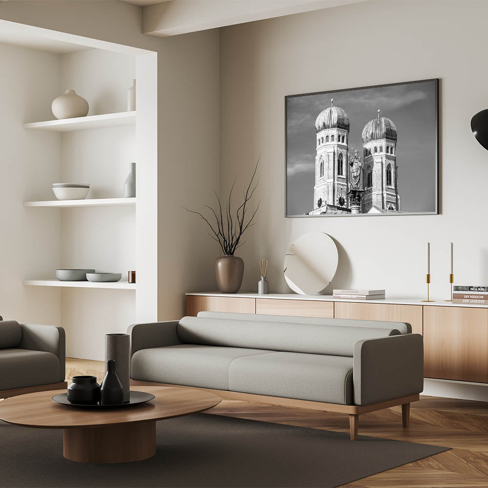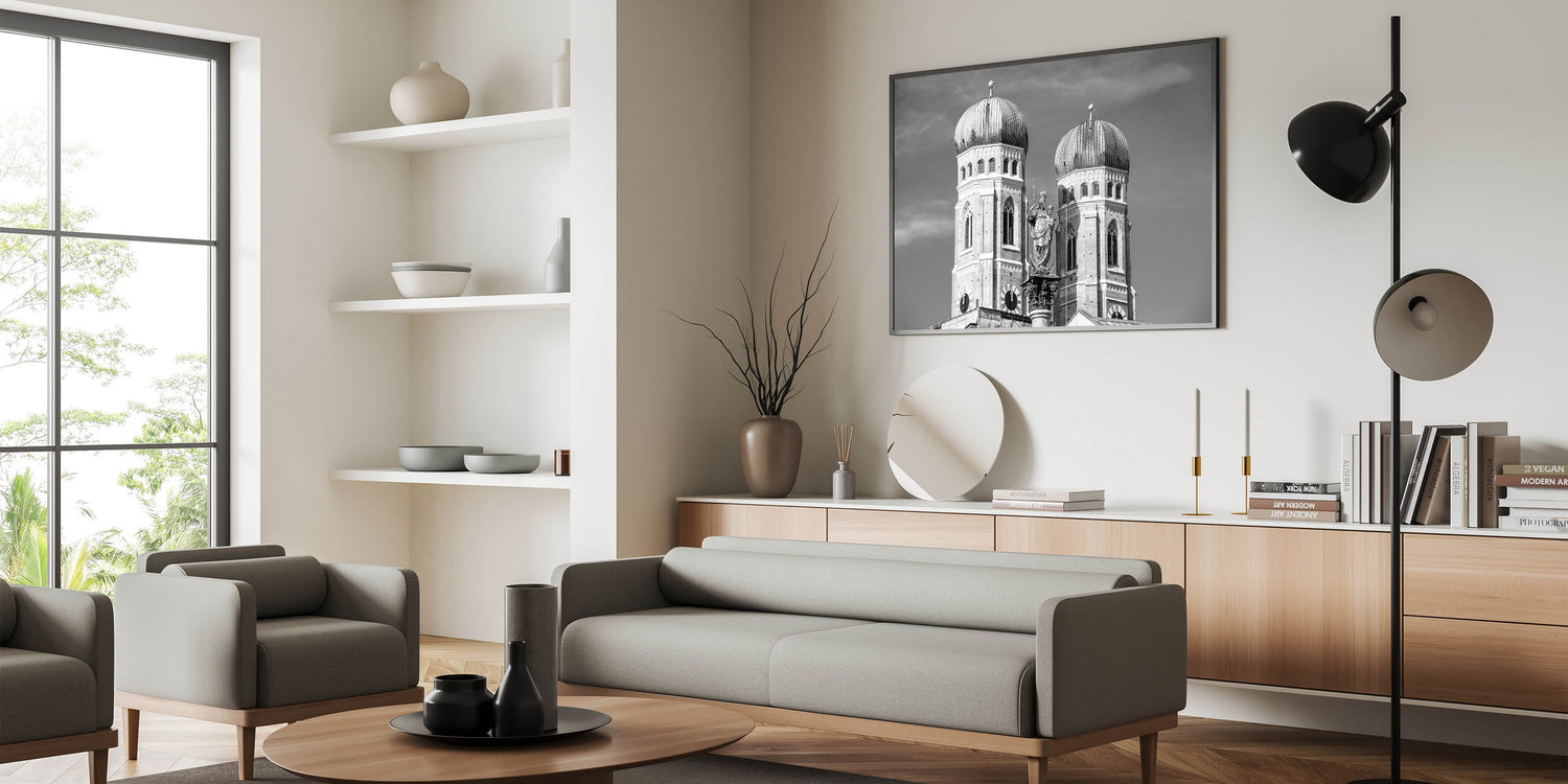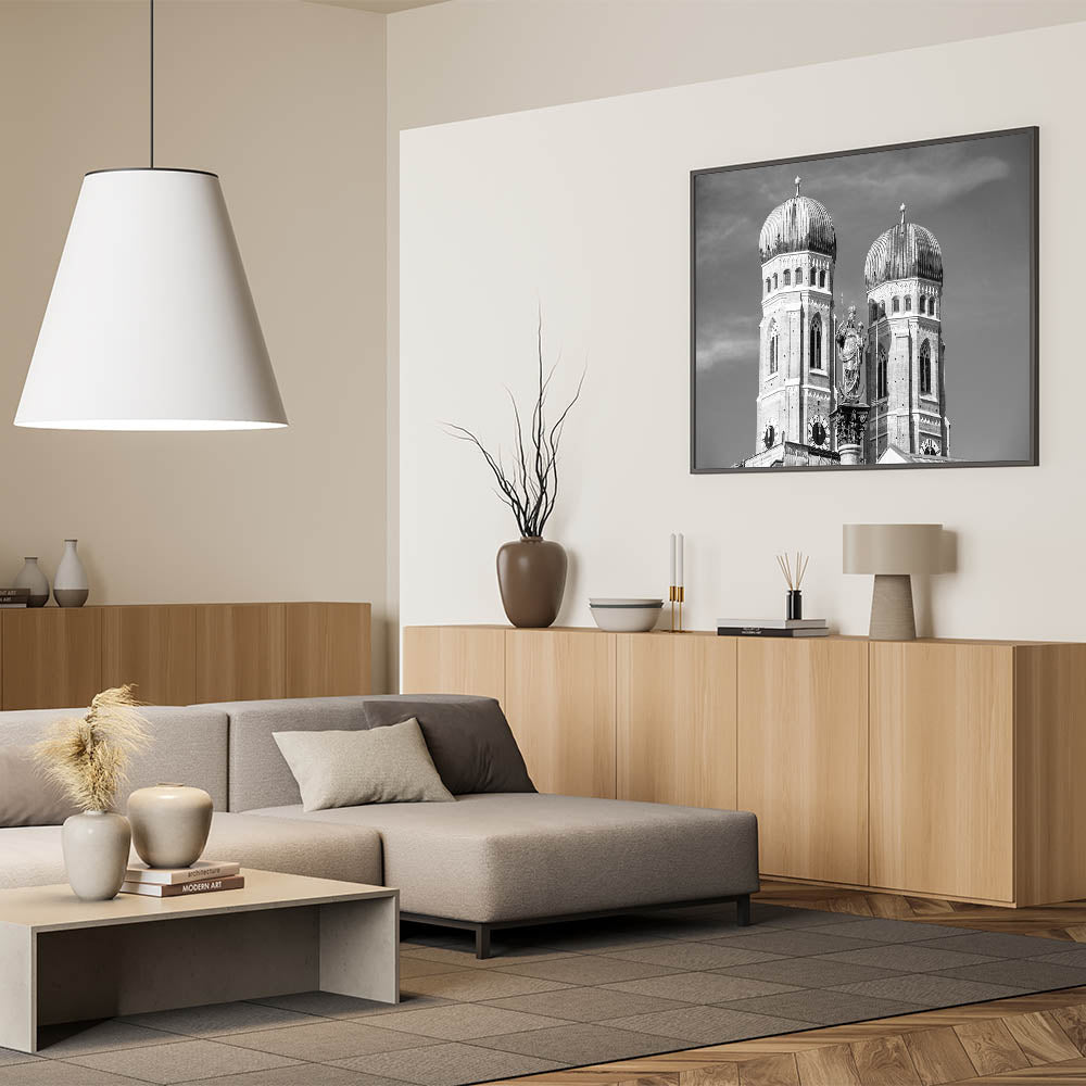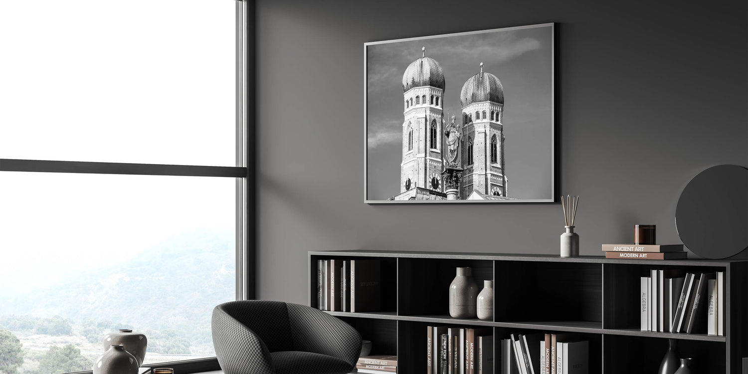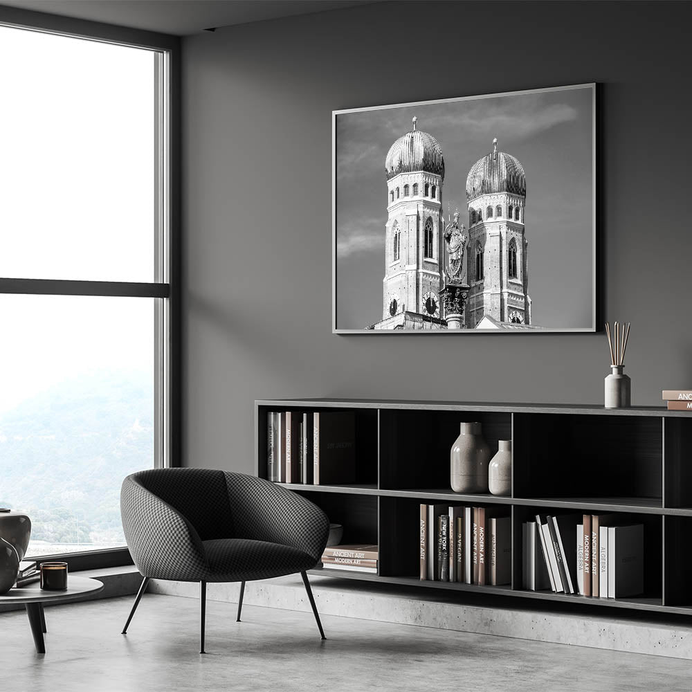This elegant black-and-white wall art showcases the iconic Frauenkirche towers in Munich, capturing the timeless beauty of Bavarian architecture. The monochrome style highlights the intricate details of this famous landmark, making it a perfect choice for those seeking a classic yet striking piece of art for their space. This Munich cityscape wall art blends history and architectural beauty, offering a sophisticated touch to any decor.
