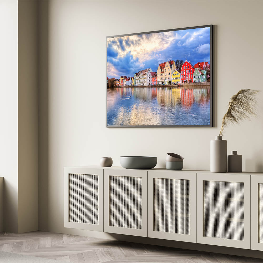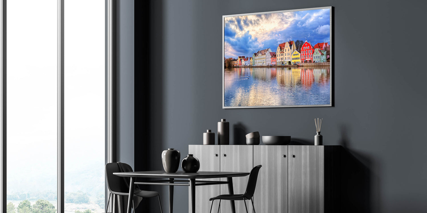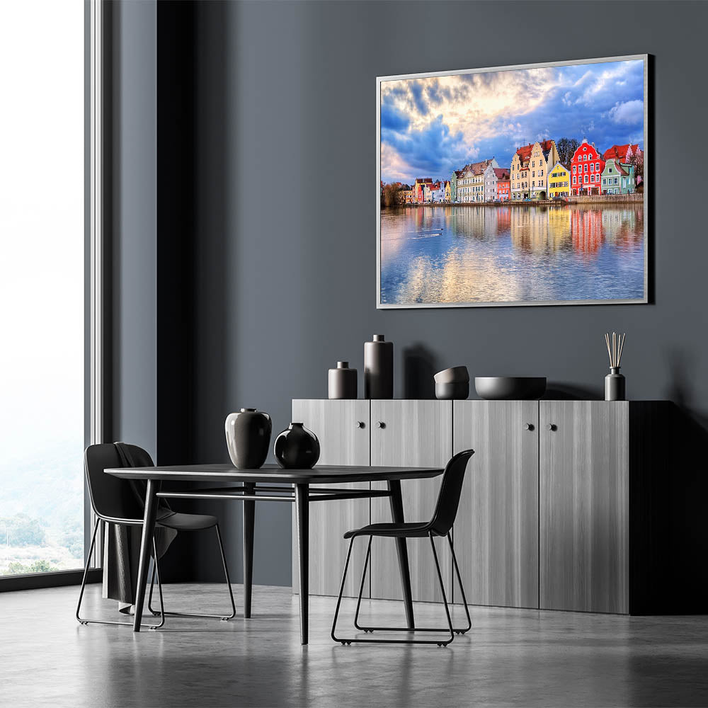 This stunning wall art captures a serene view of a Bavarian town, with vibrant buildings reflected in calm waters under a dramatic sky. This beautiful Munich cityscape wall art brings the charm of Bavaria into any room, showcasing the colorful architecture that is so unique to this region of Germany. The blend of striking colors and scenic beauty makes this piece perfect for enhancing any space with a touch of Bavarian culture.