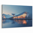 Step into the future of architectural design with this captivating wall art, featuring a stunning modern building with wave-like curves bathed in the soft glow of evening light. The sleek, fluid lines of the structure reflect off the calm water, creating a serene and harmonious scene that embodies modern elegance and innovation. This piece is perfect for those who appreciate cutting-edge architecture and contemporary design, making it an ideal addition to any sophisticated space.