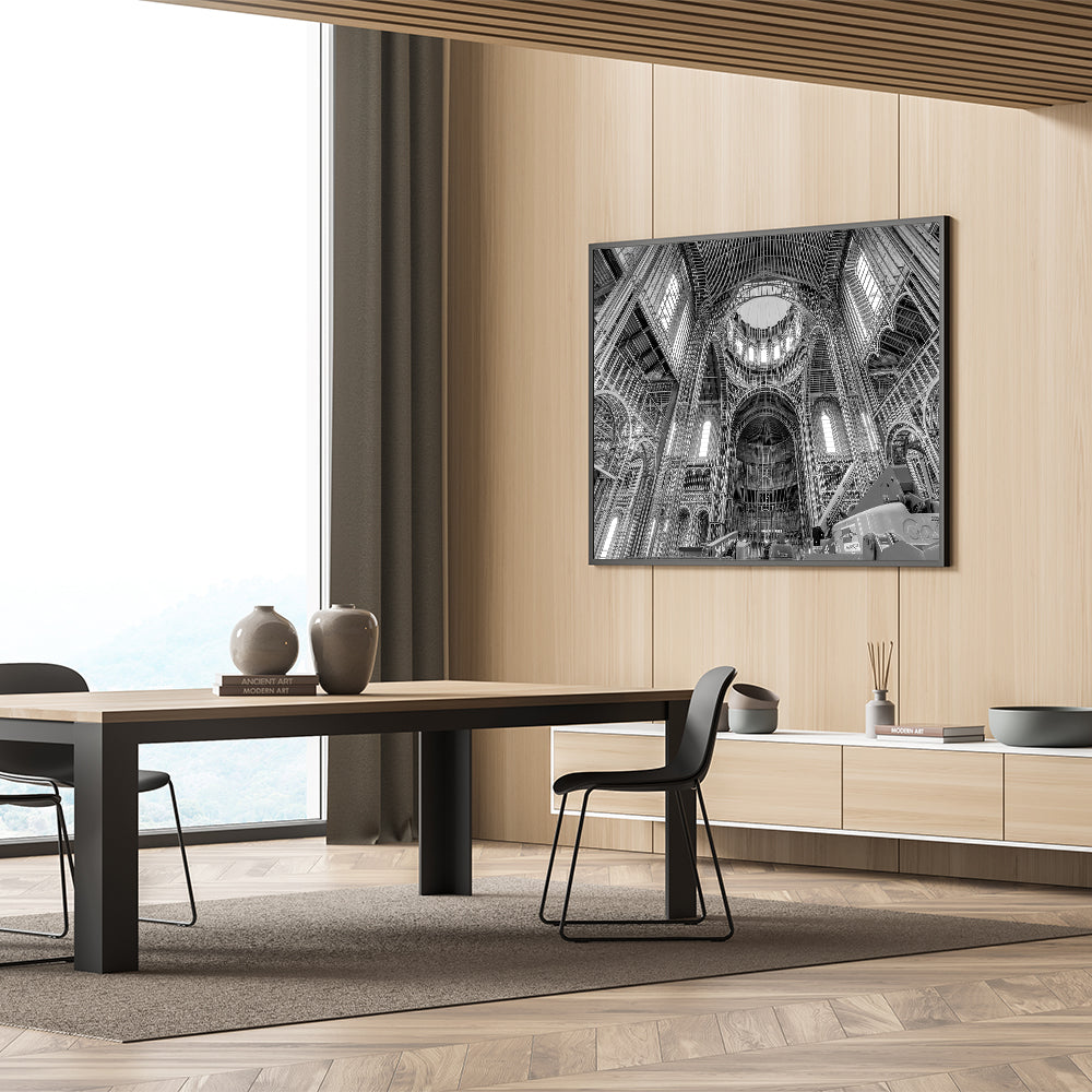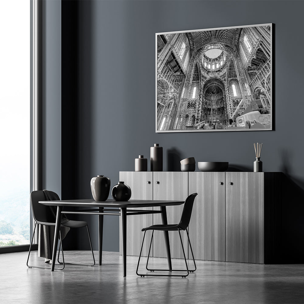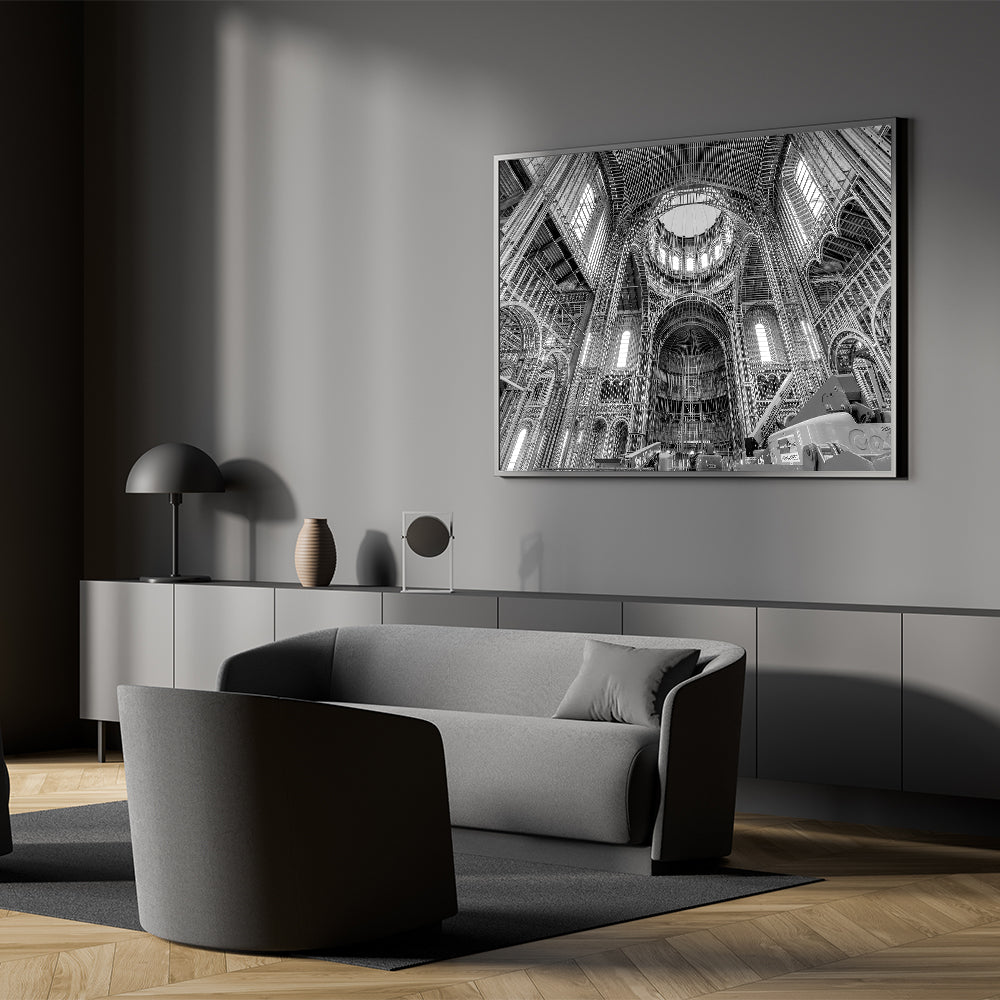 Introduce a bold statement piece into your space with this monochrome museum architecture wall art. This striking artwork captures the raw, industrial beauty of a museum's skeletal structure, emphasizing the intricate details of its architectural design. The black-and-white composition adds a dramatic touch, making it an ideal choice for modern or industrial-themed interiors. Perfect for art lovers who appreciate the intersection of history and contemporary design, this piece will enhance the sophistication of any room.
