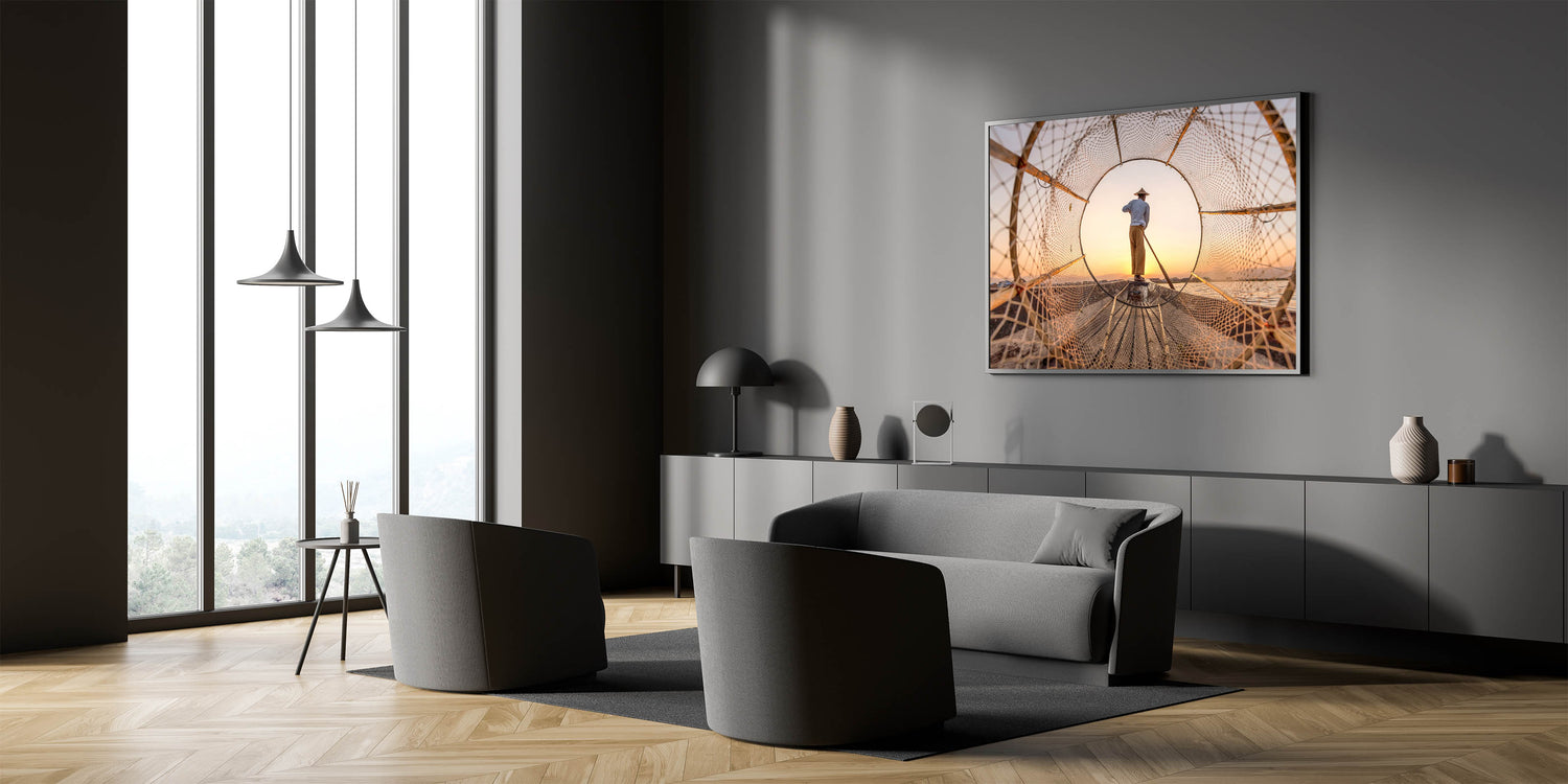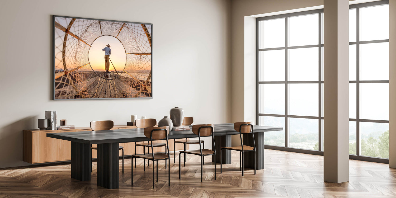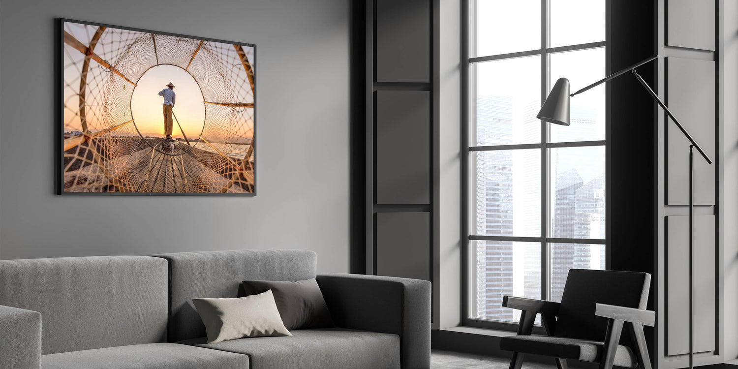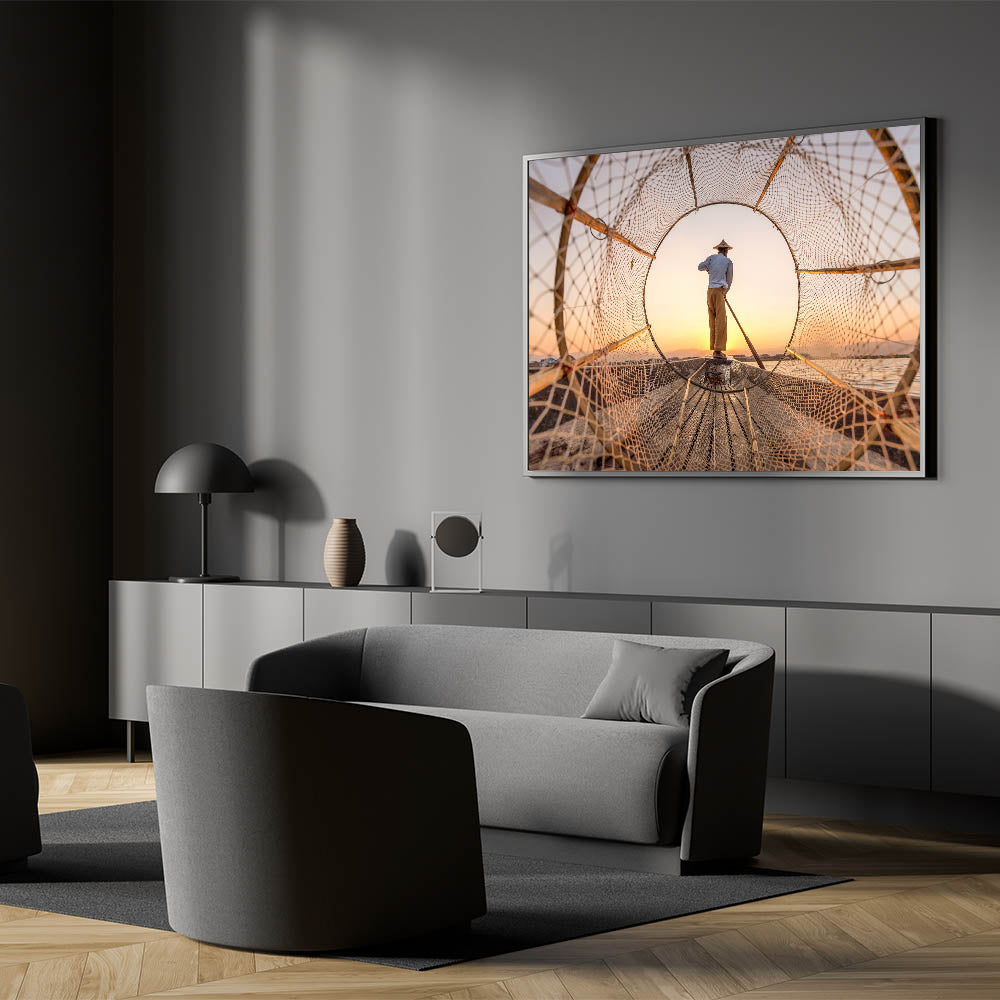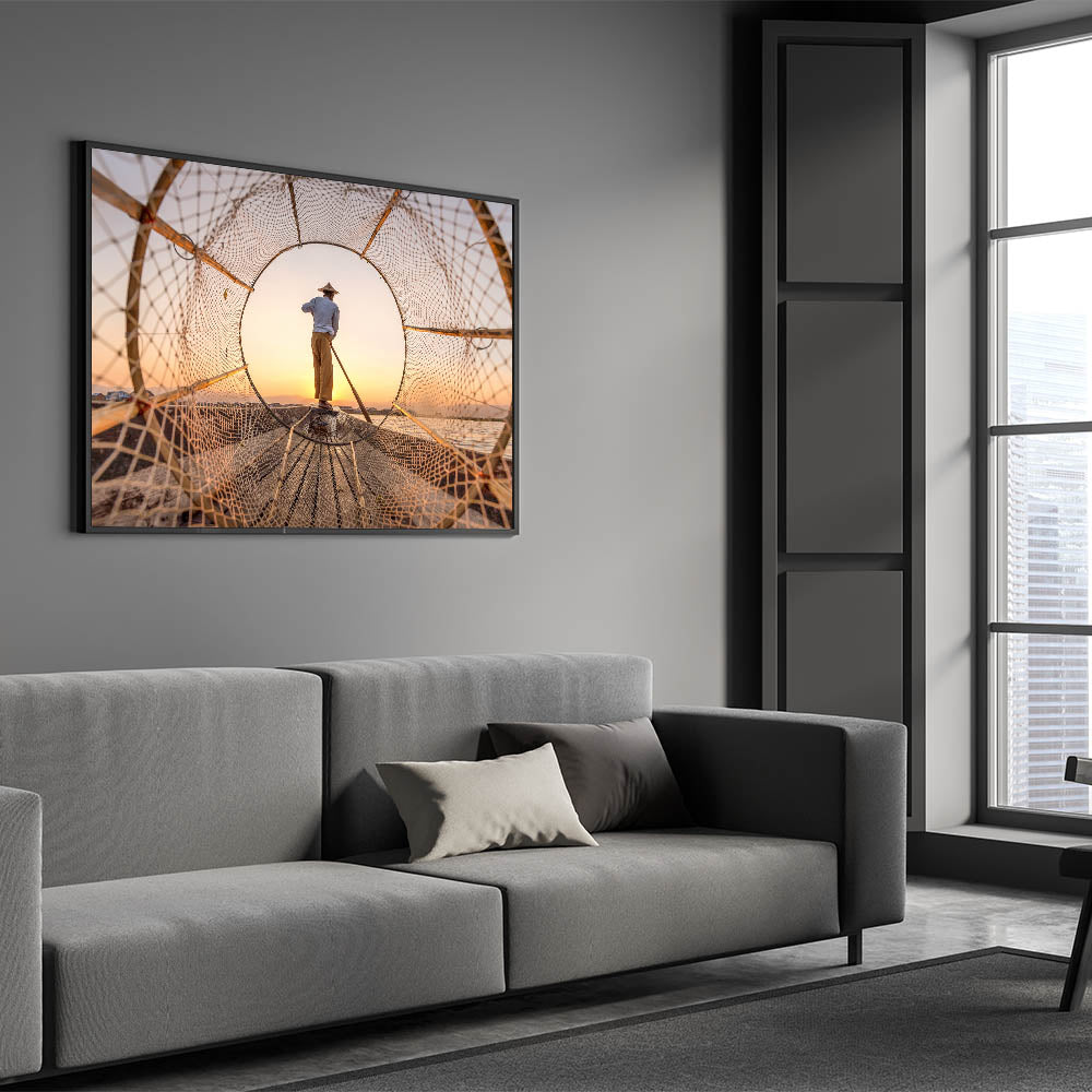 Fisherman Framed by Net Myanmar Wall Art - Golden Sunrise at Inle Lake