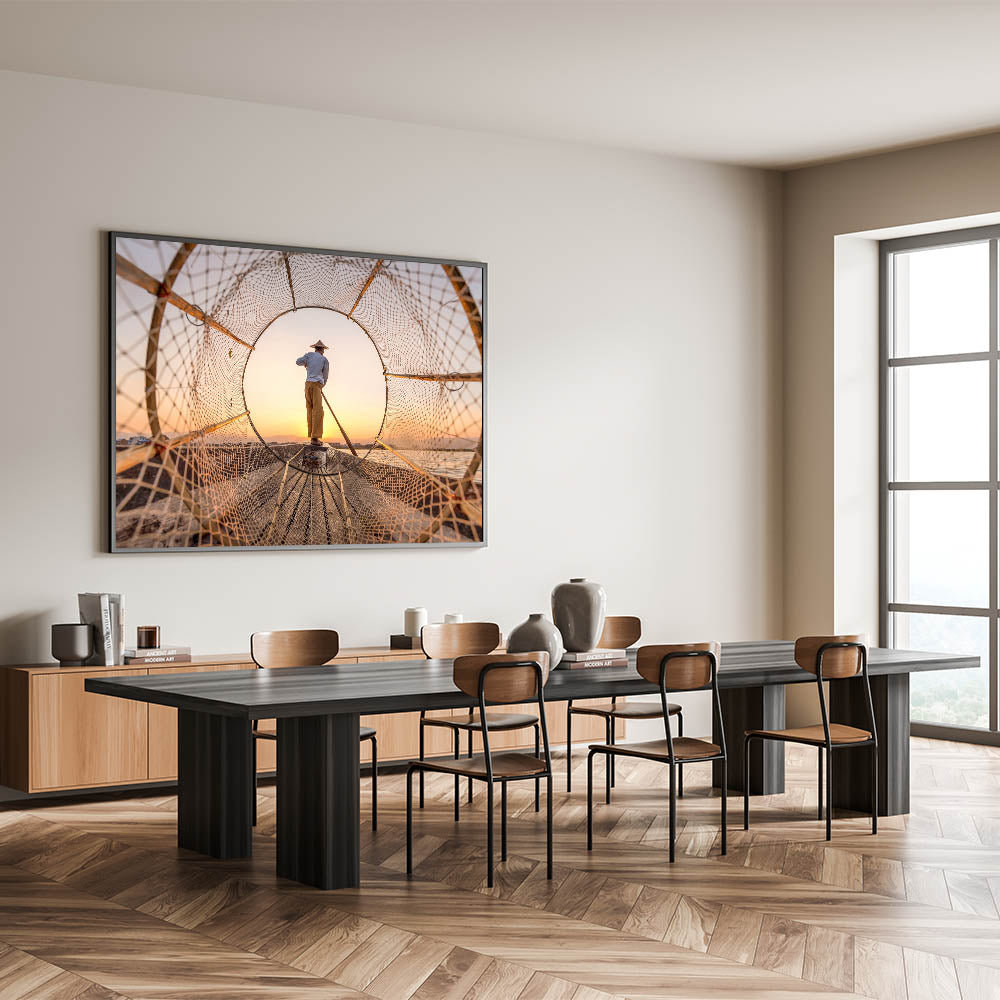 This stunning wall art captures a traditional fisherman perfectly framed through his net during a golden sunrise at Inle Lake, Myanmar. The unique perspective and warm hues of the sunrise create a serene atmosphere, highlighting the calm beauty of the lake and the fisherman’s graceful stance. This artwork beautifully showcases the cultural heritage of Myanmar, offering a tranquil view of daily life.