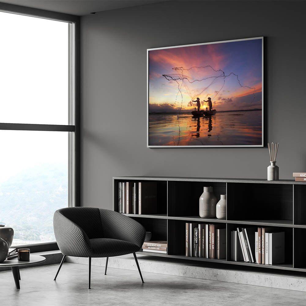 This breathtaking wall art captures the vibrant beauty of Myanmar at sunset, featuring two traditional fishermen casting their nets over the water. The vivid colors of the sky, reflected on the serene water, create a mesmerizing view, bringing a sense of tranquility and culture to any space. The intricate details of the fishermen's silhouettes and the dynamic flow of the nets make this piece a true work of art.