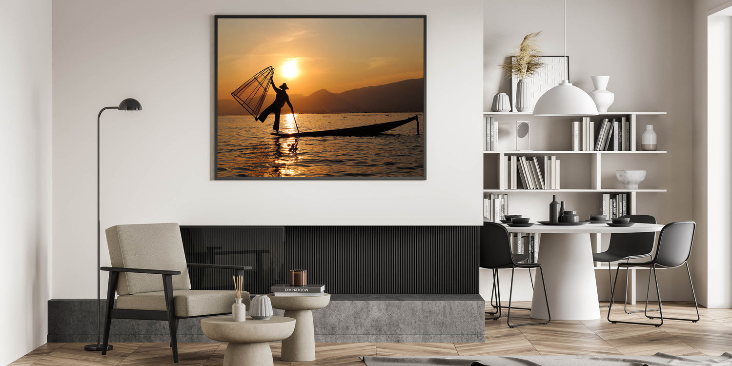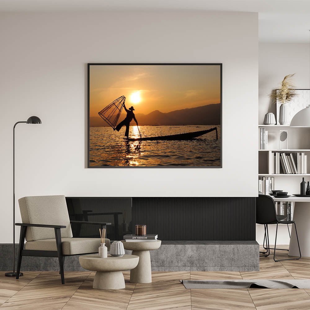 Sunset Silhouette of Fisherman Myanmar Wall Art - Inle Lake Heritage