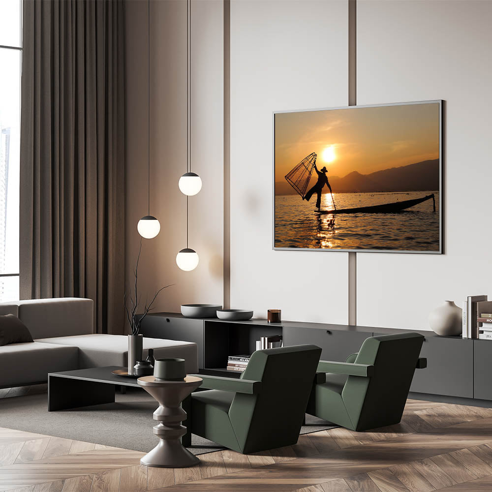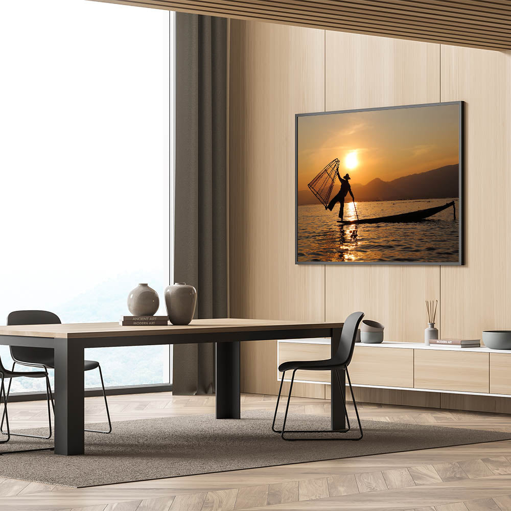 This stunning artwork is perfect for those looking to add a piece of Myanmar’s rich culture to their decor. Whether placed in a living room, bedroom, or office, the silhouette of the fisherman against the sunset creates a sense of tranquility and heritage that will elevate any space.