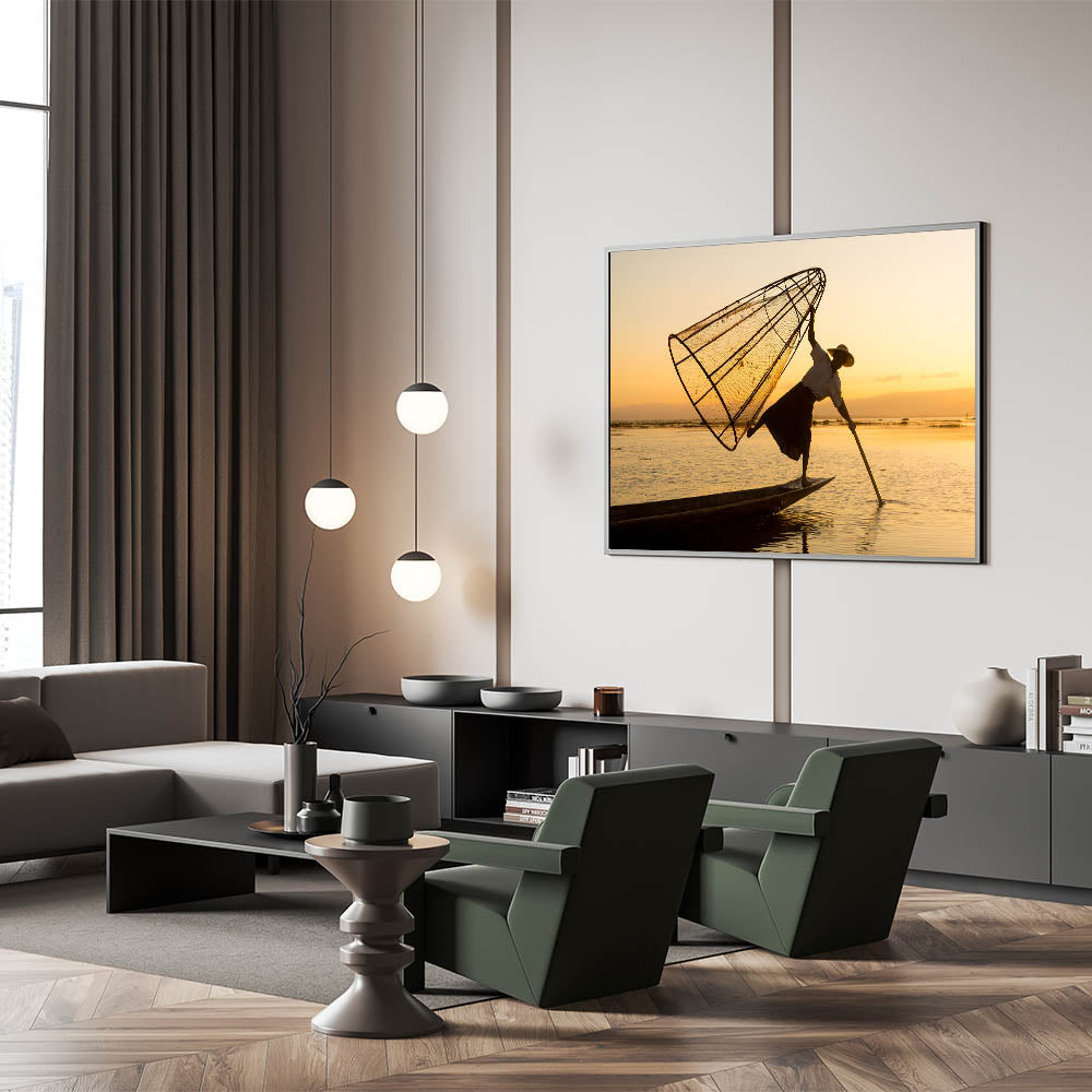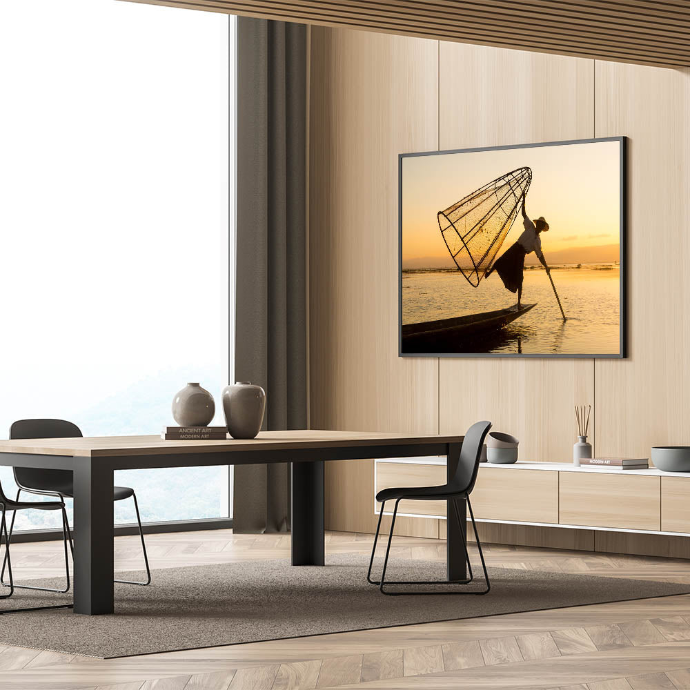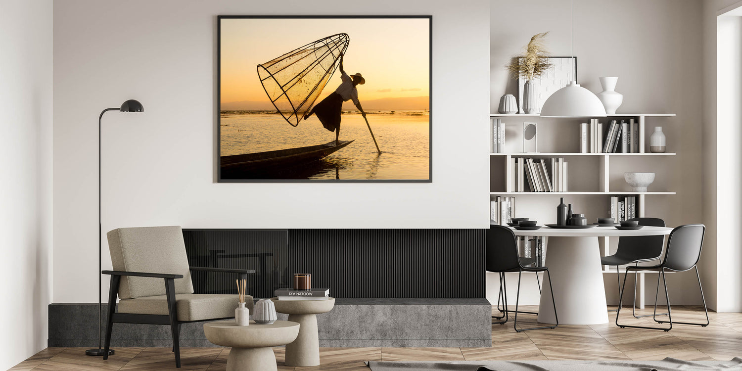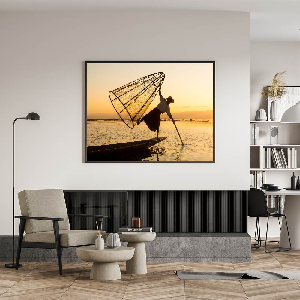 Celebrate the cultural richness of Myanmar with this stunning wall art featuring a traditional fisherman balancing on a boat at Inle Lake during a serene sunset. The warm golden hues of the sky beautifully illuminate the intricate fishing techniques of the locals, capturing a moment of cultural significance and natural beauty.