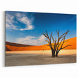 Immerse yourself in the stark beauty of Namibia with this captivating wall art, featuring the skeletal remains of a tree standing tall against the backdrop of vivid orange dunes and a clear blue sky. This Namibian landscape photography captures the raw and dramatic scenery of Africa’s deserts, making it an ideal piece for those looking to add a touch of nature's untamed beauty to their living or working space.