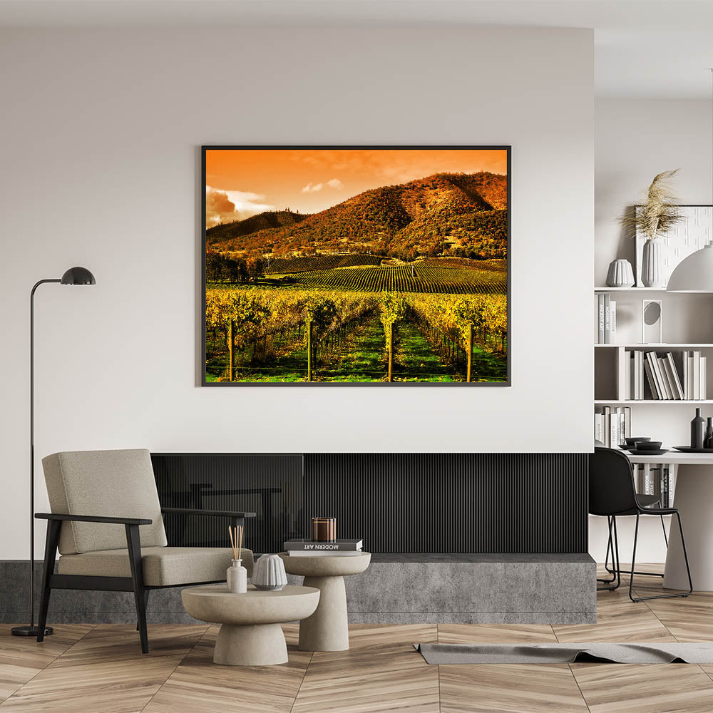 Immerse yourself in the timeless beauty of Napa Valley with this stunning landscape art. This captivating artwork features the renowned vineyards of California's wine country, where rolling hills and golden vineyards stretch toward the horizon under a vibrant, orange sky. The rich textures of the vines and the autumnal tones of the landscape make this piece perfect for adding a touch of nature’s elegance to your home or office.