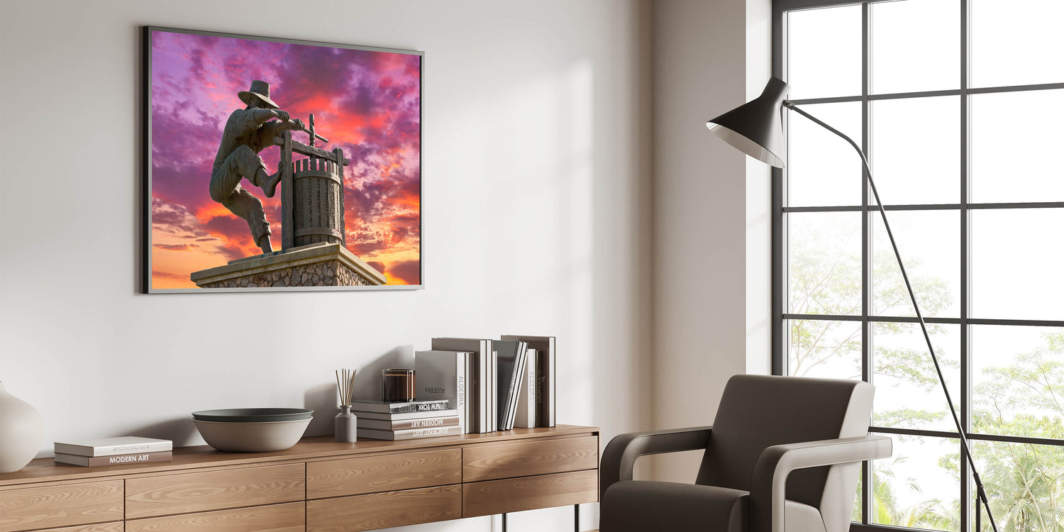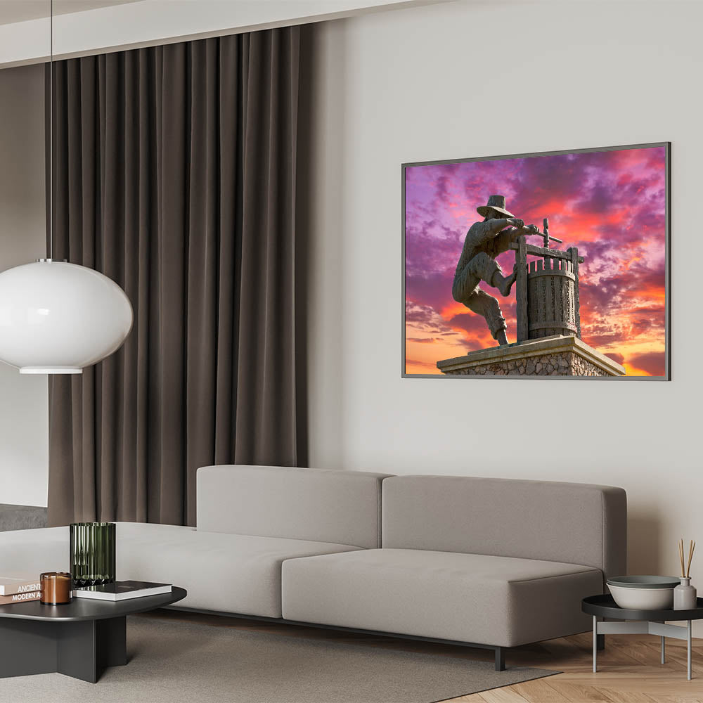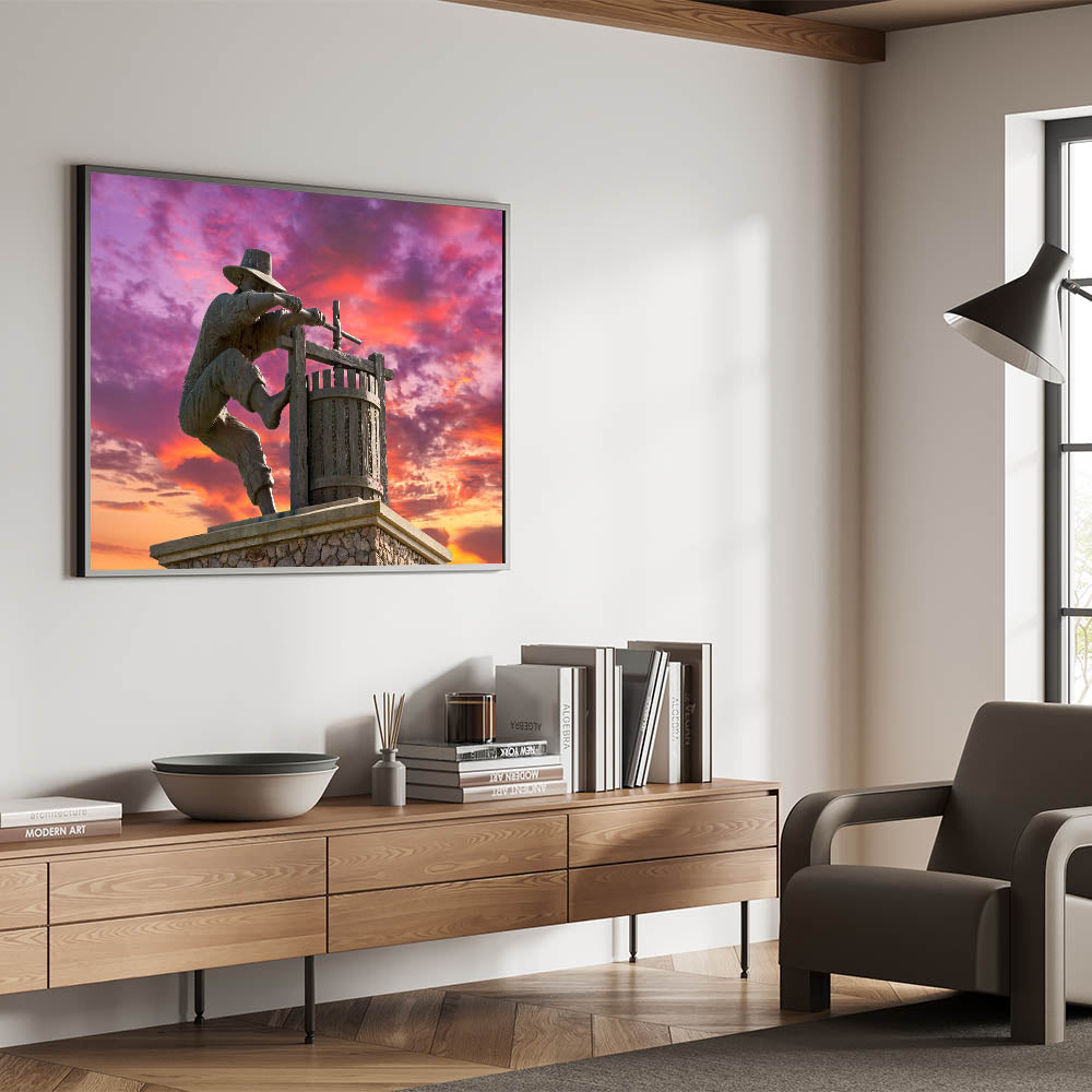 Celebrate the tradition of winemaking with this unique Napa Valley wall art. This striking image captures the iconic statue of a winemaker pressing grapes, set against a vivid sunset sky. The detailed craftsmanship of the statue, combined with the dramatic purple and orange hues of the sky, creates a powerful and visually stunning scene. This artwork pays tribute to Napa Valley’s rich winemaking heritage while adding a bold, artistic touch to your space.