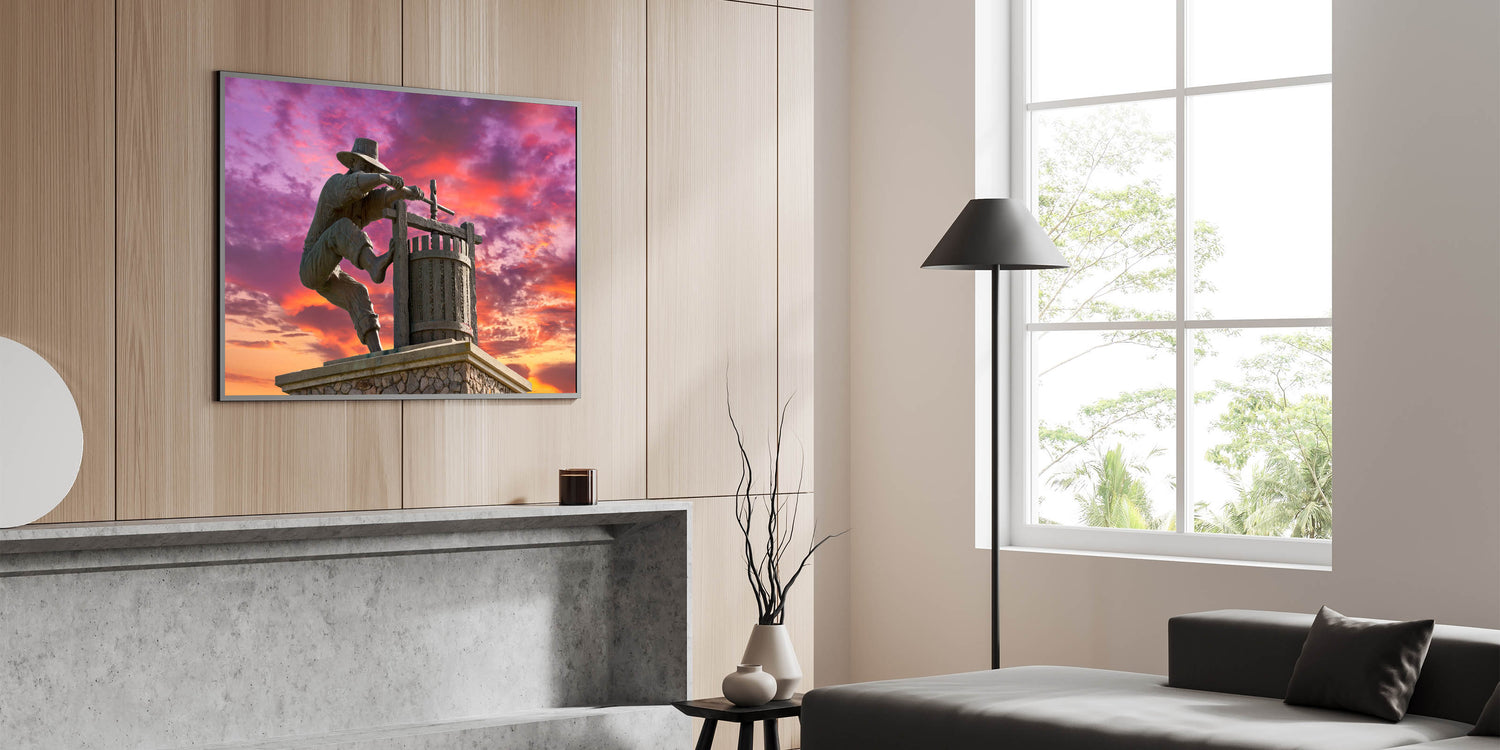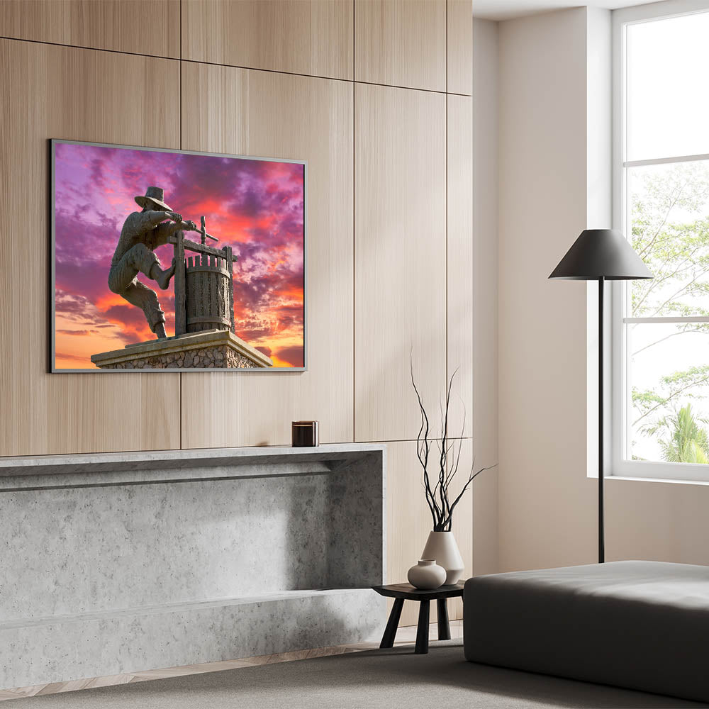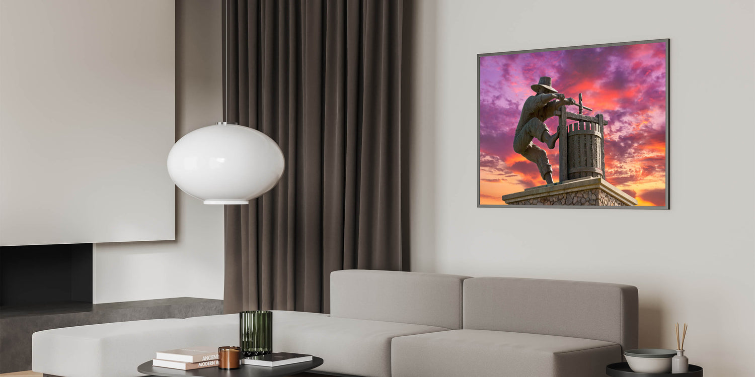 Celebrate the tradition of winemaking with this unique Napa Valley wall art. This striking image captures the iconic statue of a winemaker pressing grapes, set against a vivid sunset sky. The detailed craftsmanship of the statue, combined with the dramatic purple and orange hues of the sky, creates a powerful and visually stunning scene. This artwork pays tribute to Napa Valley’s rich winemaking heritage while adding a bold, artistic touch to your space.