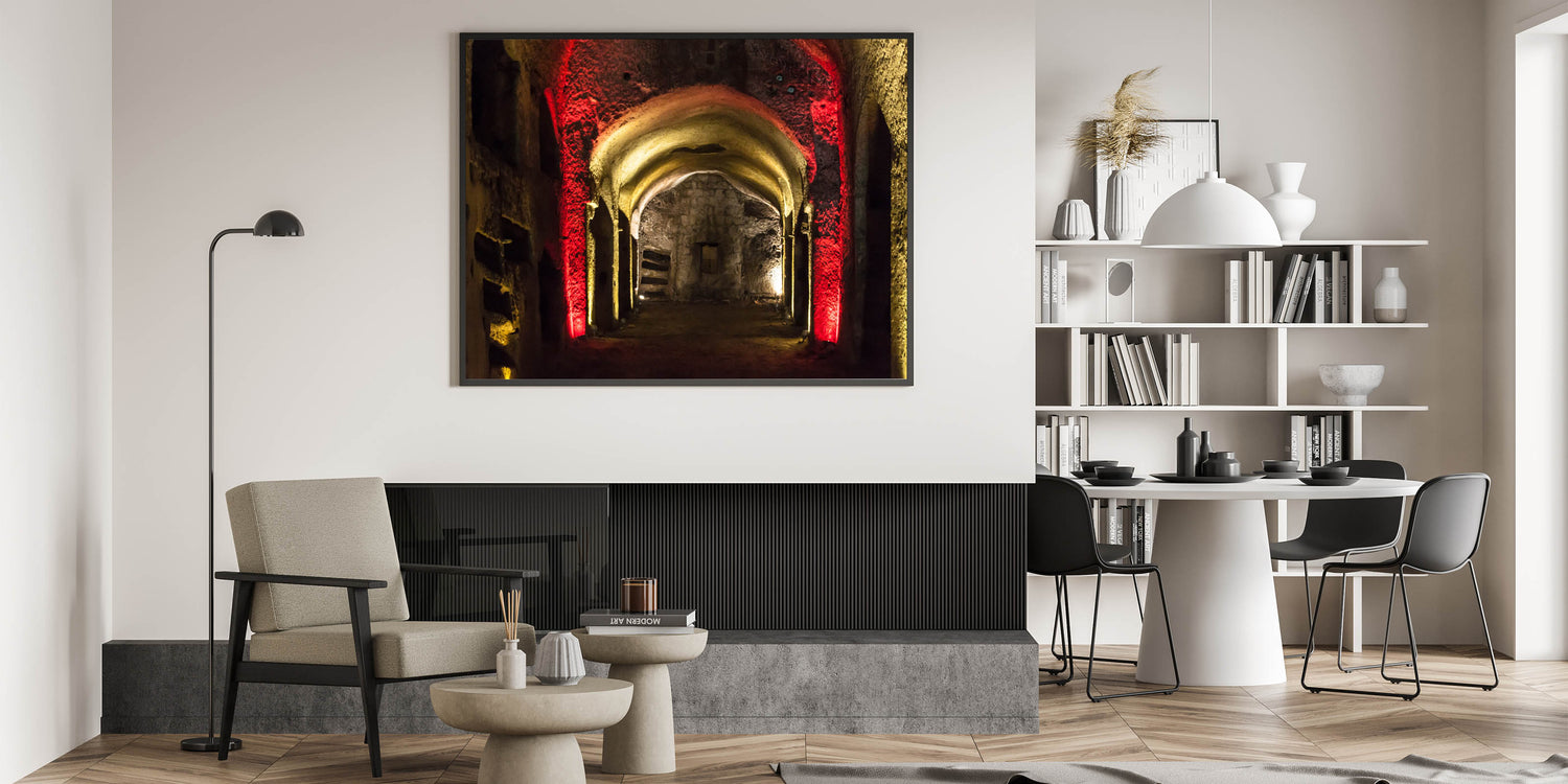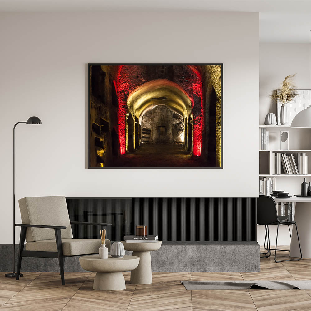 Add a touch of mystery and history to your decor with this unique Naples Cityscape Art, featuring an evocative photograph of an underground chamber in Naples. This artwork is part of the Beautiful Naples Wall Art Collection, capturing the architectural beauty and cultural significance of the ancient city. The dramatic lighting and intricate stonework make this piece a captivating addition to any room.