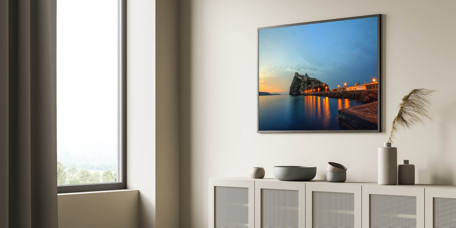 Enhance your space with this breathtaking Naples Skyline Wall Decor, featuring the silhouette of a coastal castle as the sun sets over the Mediterranean. This stunning piece from the Beautiful Naples Wall Art Collection showcases the serene and mystical atmosphere of Naples’ historic coastline, making it a perfect addition for those who love Naples Coastal Scene Art.