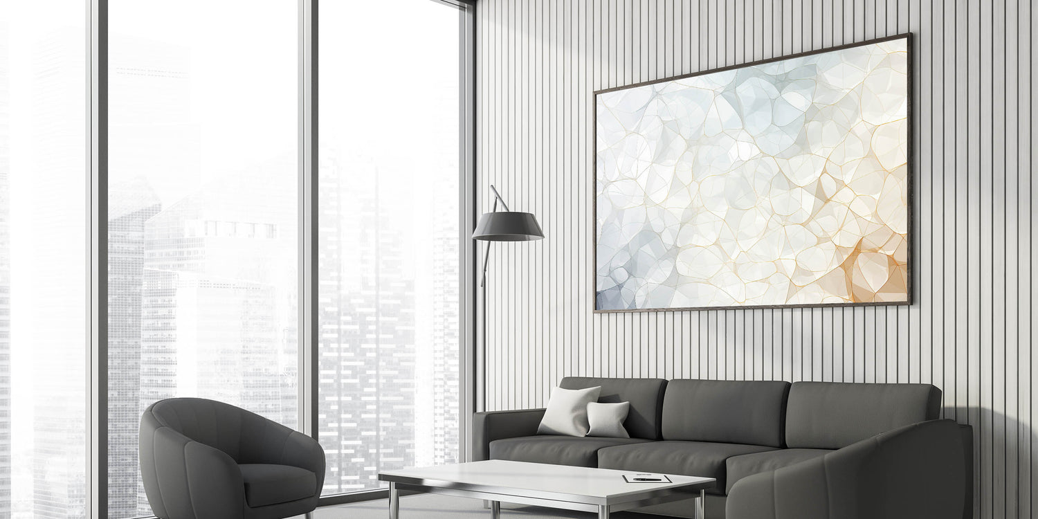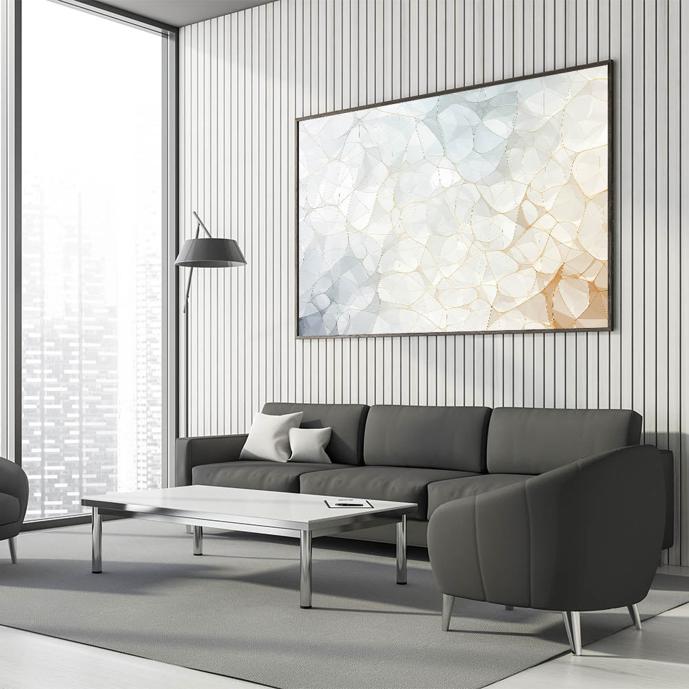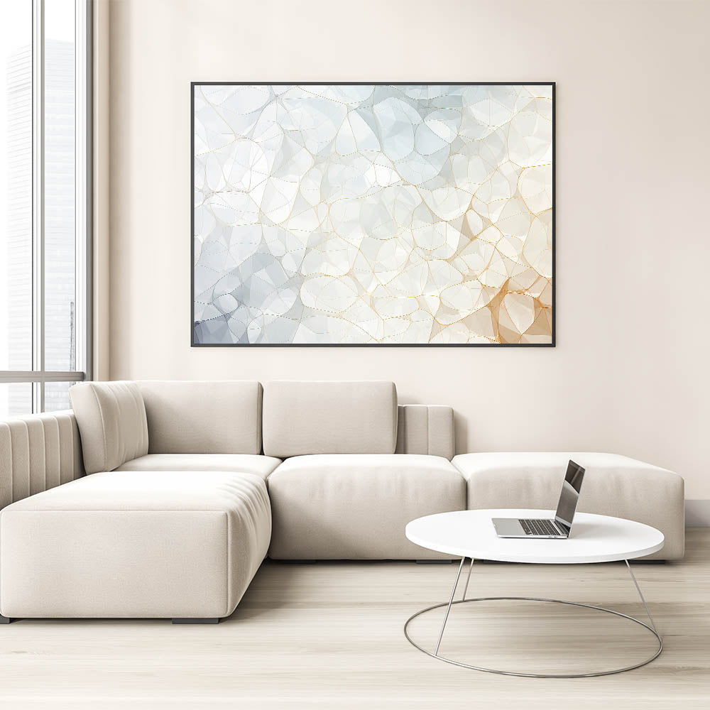 Elevate your interior with this stunning abstract design featuring delicate geometric patterns in soft, translucent tones. The gentle blend of whites, grays, and gold accents create an elegant and calming atmosphere, perfect for minimalist or modern decor styles. The fluid, organic shapes evoke the beauty of natural elements while maintaining a sophisticated, artistic touch. This piece is ideal for adding a subtle yet striking focal point to any room.